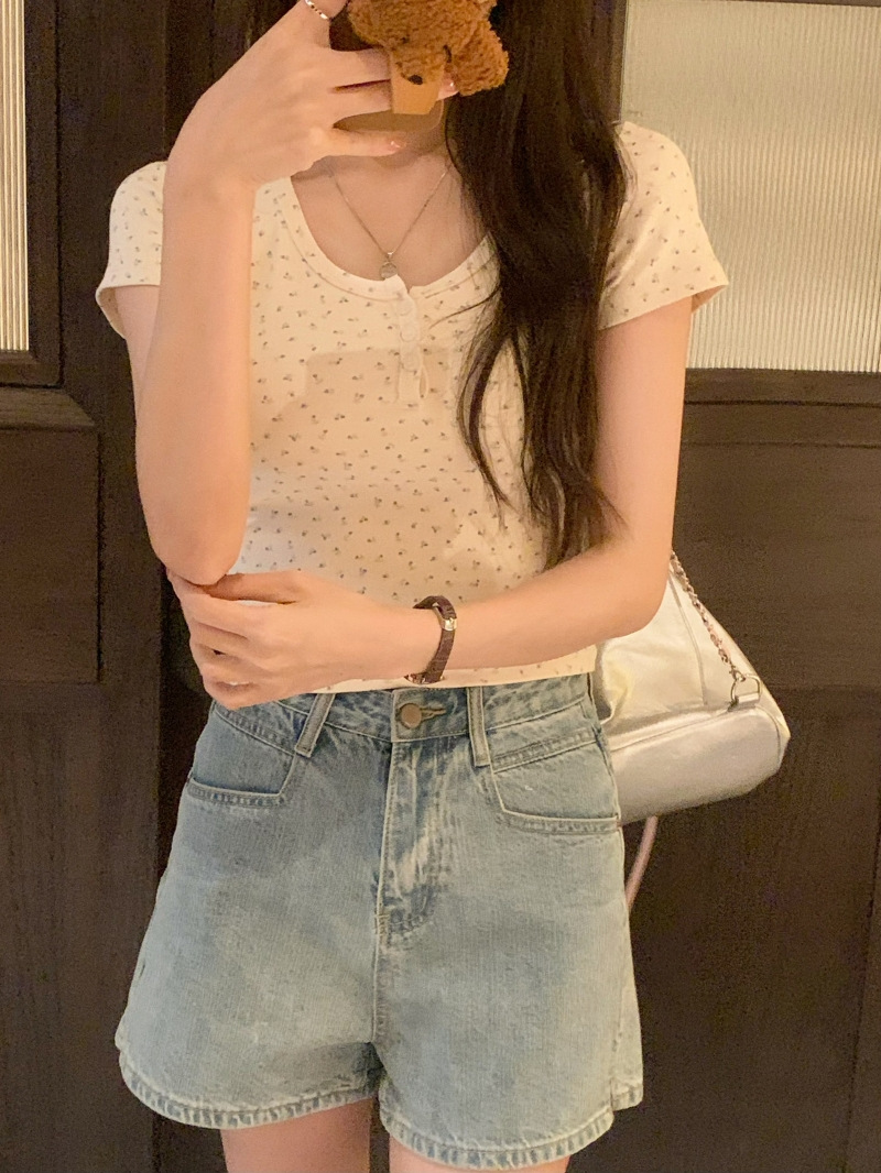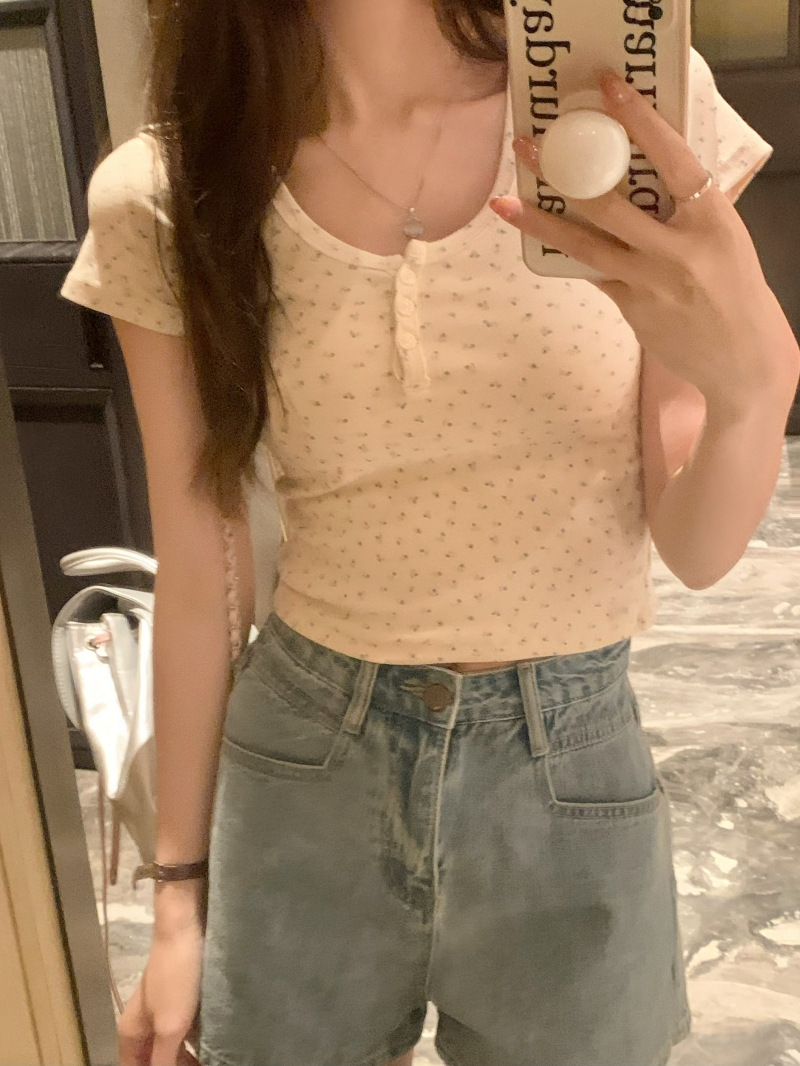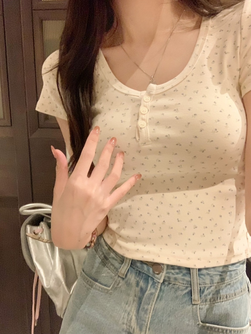 순수 버튼 플로럴 반팔 티셔츠 여성용 슬림 핏 짧은 바닥 셔츠 슬리밍 여름 BM 스타일 라운드 넥 숄더 탑