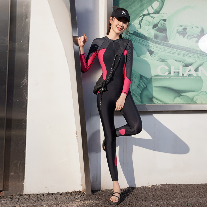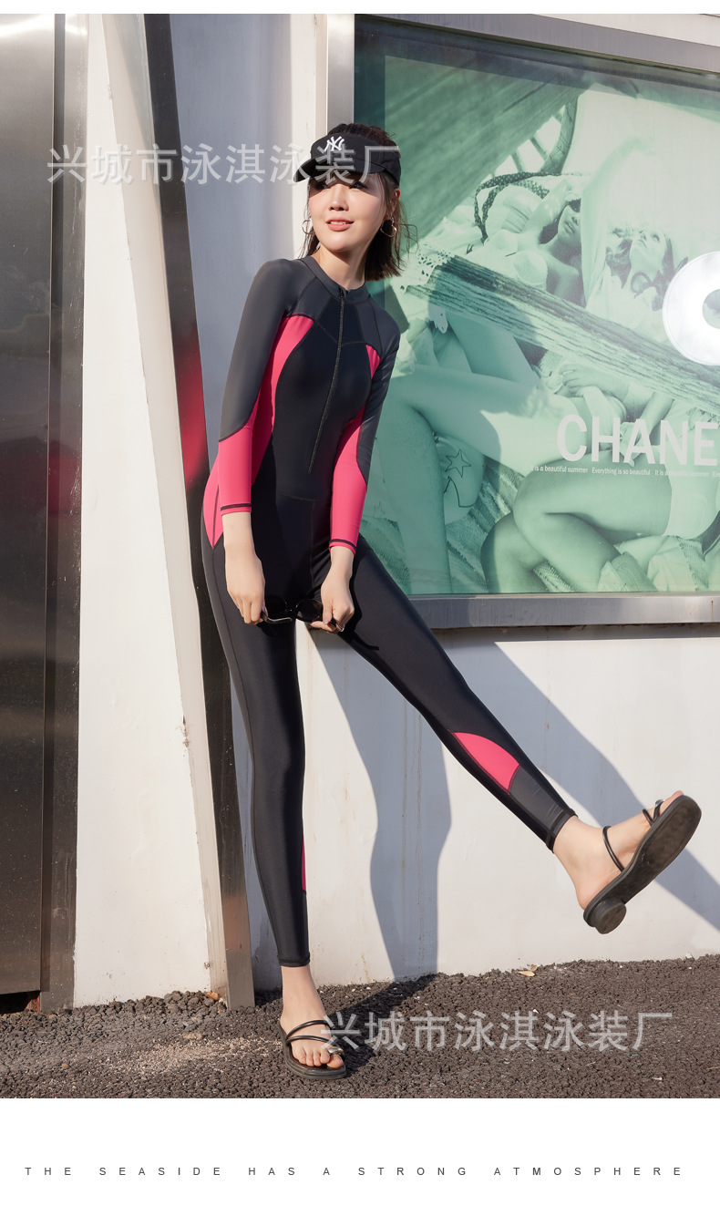 슬림핏 슬리밍 태양 보호 긴팔 바지 하이 칼라 지퍼 스포츠 원피스 수영복 여성 스노클링 서핑 다이빙 세트