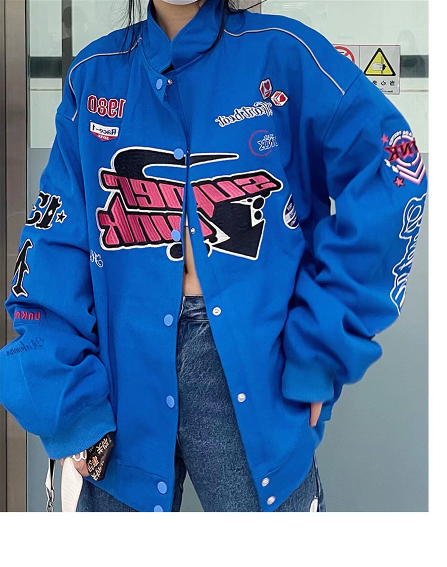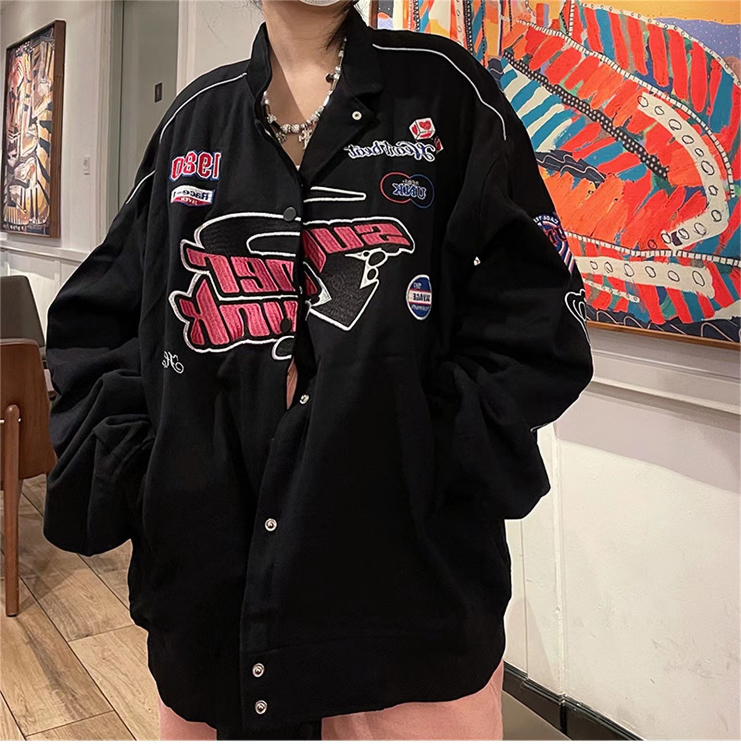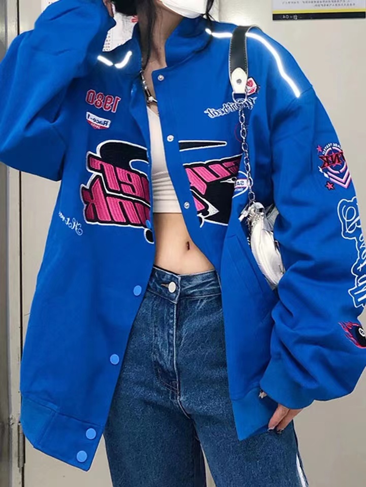 미국 야구 유니폼 여자 가을과 겨울 홍콩 스타일 오토바이 비행 세트 자수 재킷 느슨한 빈티지 퀼트 재킷 트렌디 한