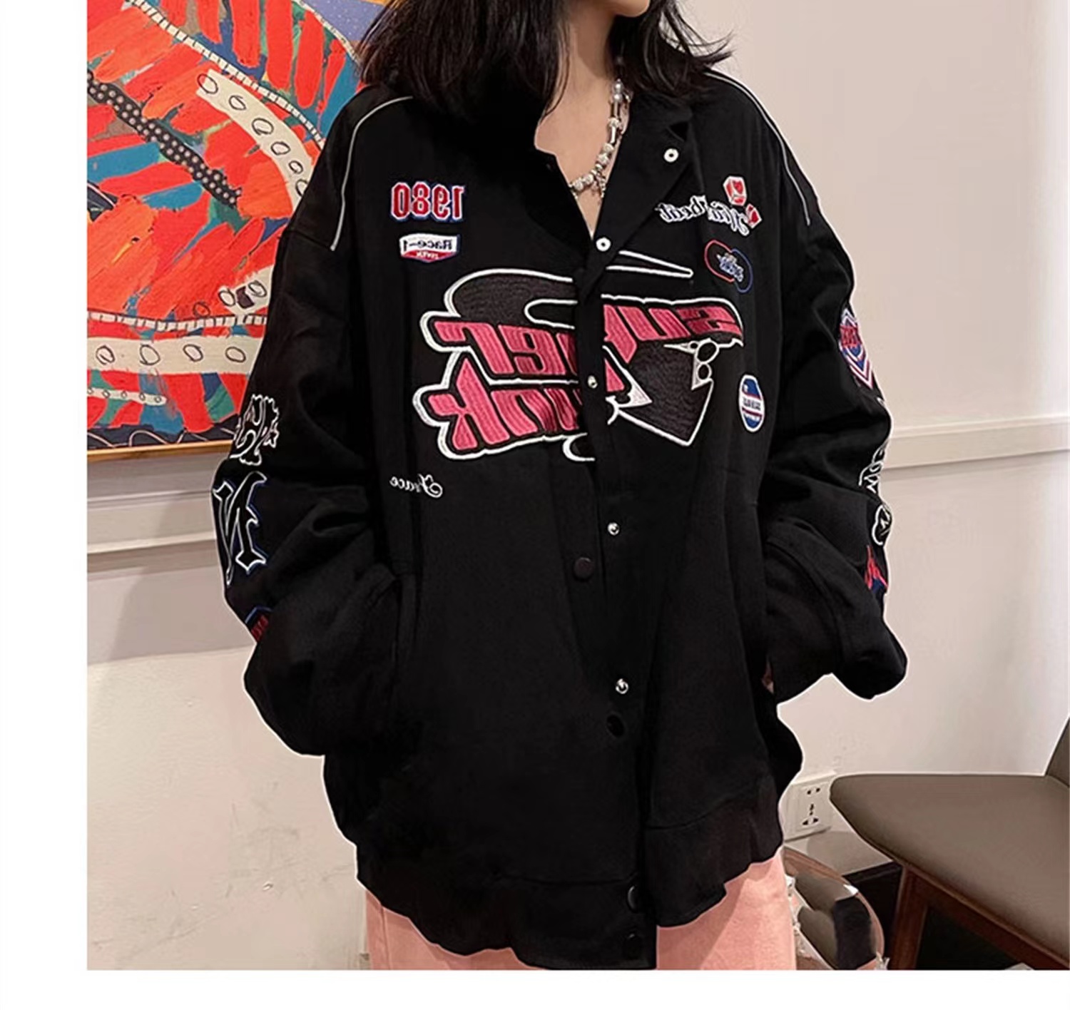 미국 야구 유니폼 여자 가을과 겨울 홍콩 스타일 오토바이 비행 세트 자수 재킷 느슨한 빈티지 퀼트 재킷 트렌디 한스토어 가기