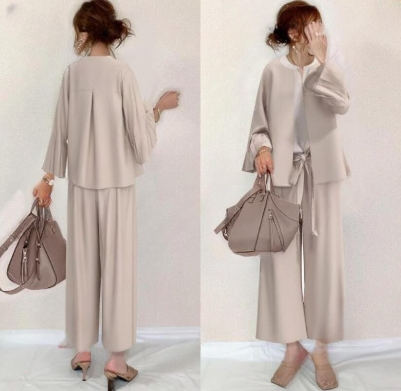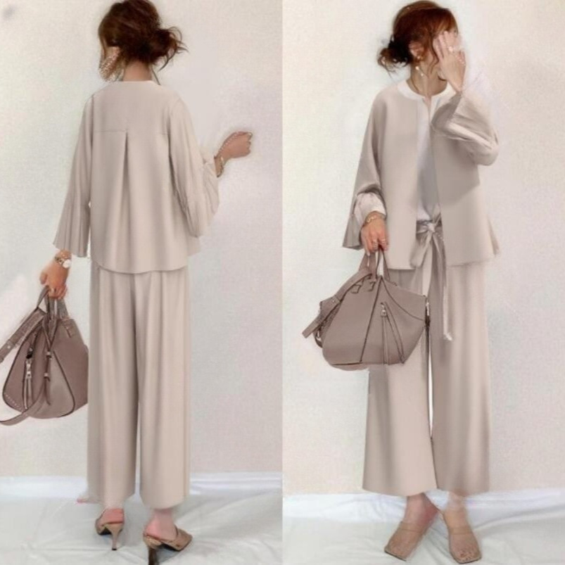 일본의 새로운 벨 슬리브 탑 스트레이트 팬츠 + 화이트베이스 조끼 3 피스 세트스토어 가기