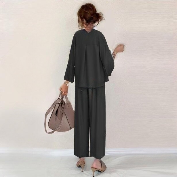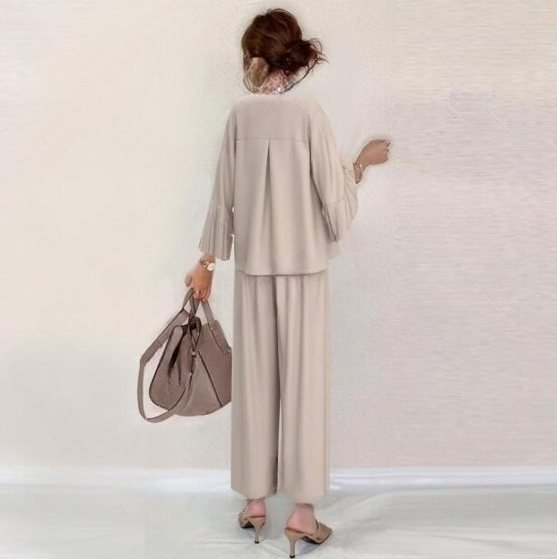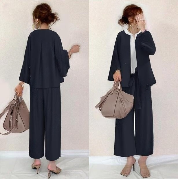 일본의 새로운 벨 슬리브 탑 스트레이트 팬츠 + 화이트베이스 조끼 3 피스 세트