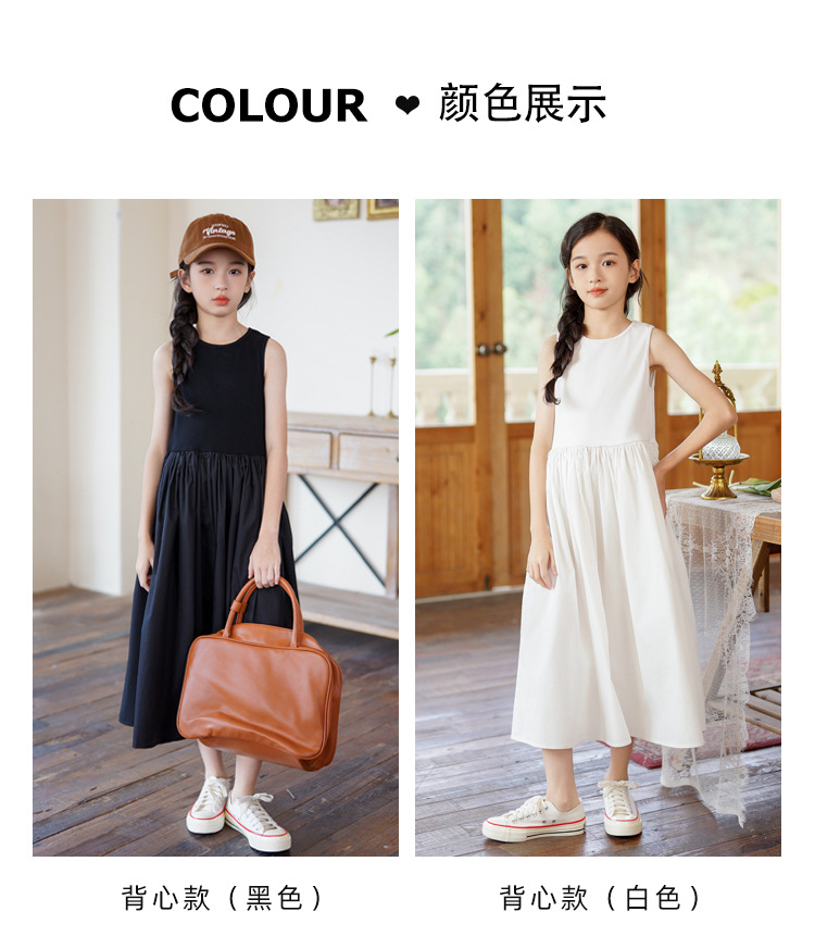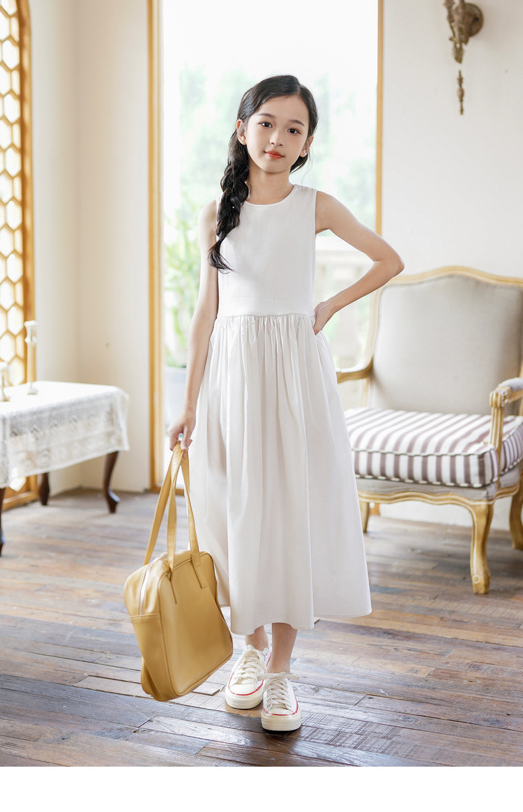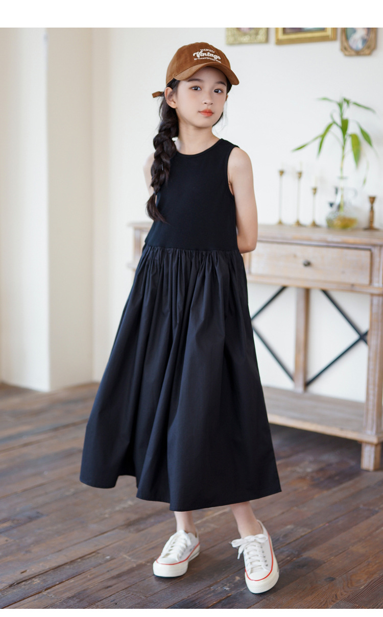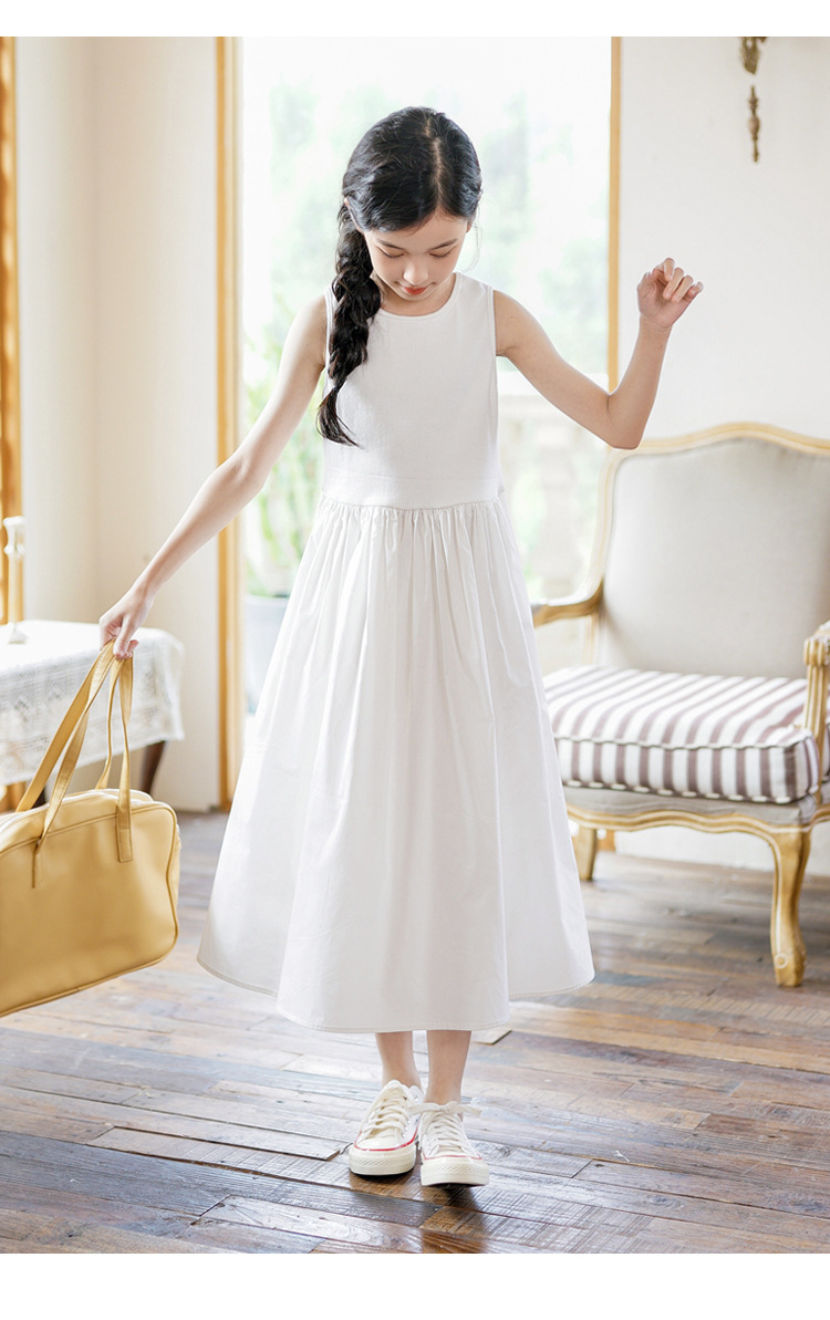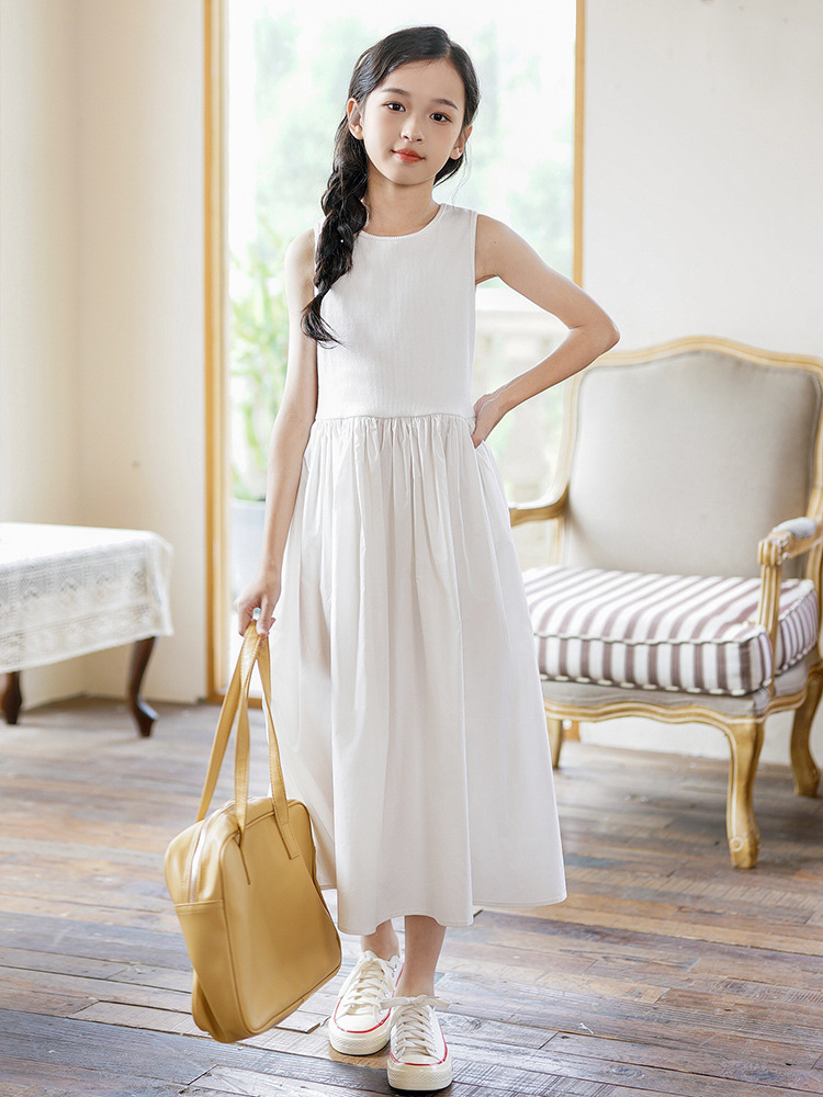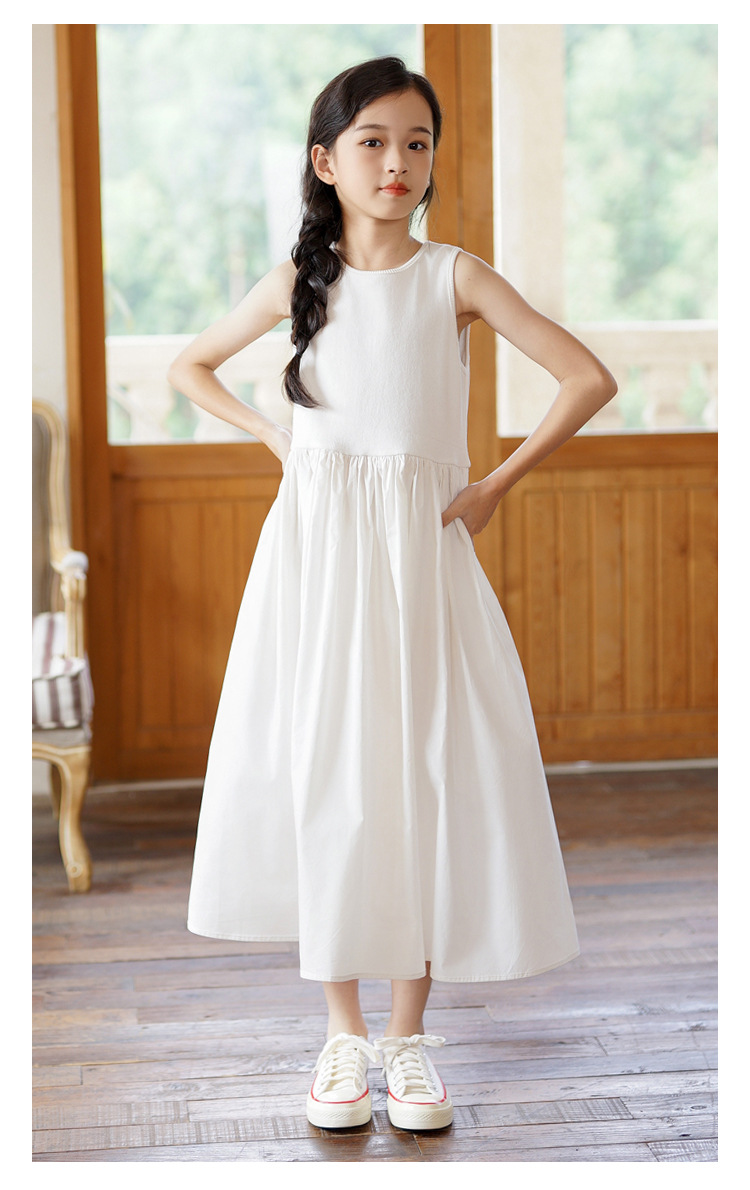 소녀 원피스 여름 민소매 조끼 단색 코튼 스커트 2024 노인을위한 한국 스타일의 새로운 공주 원피스