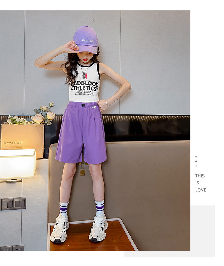 소녀 세트 자른 바지 2024 새로운 어린이 중형 및 대형 어린이 소녀 캐주얼 반바지 여름 얇은 중형 바지 여름복