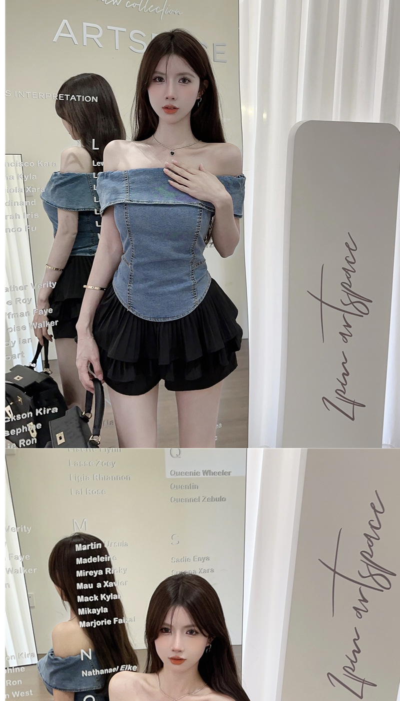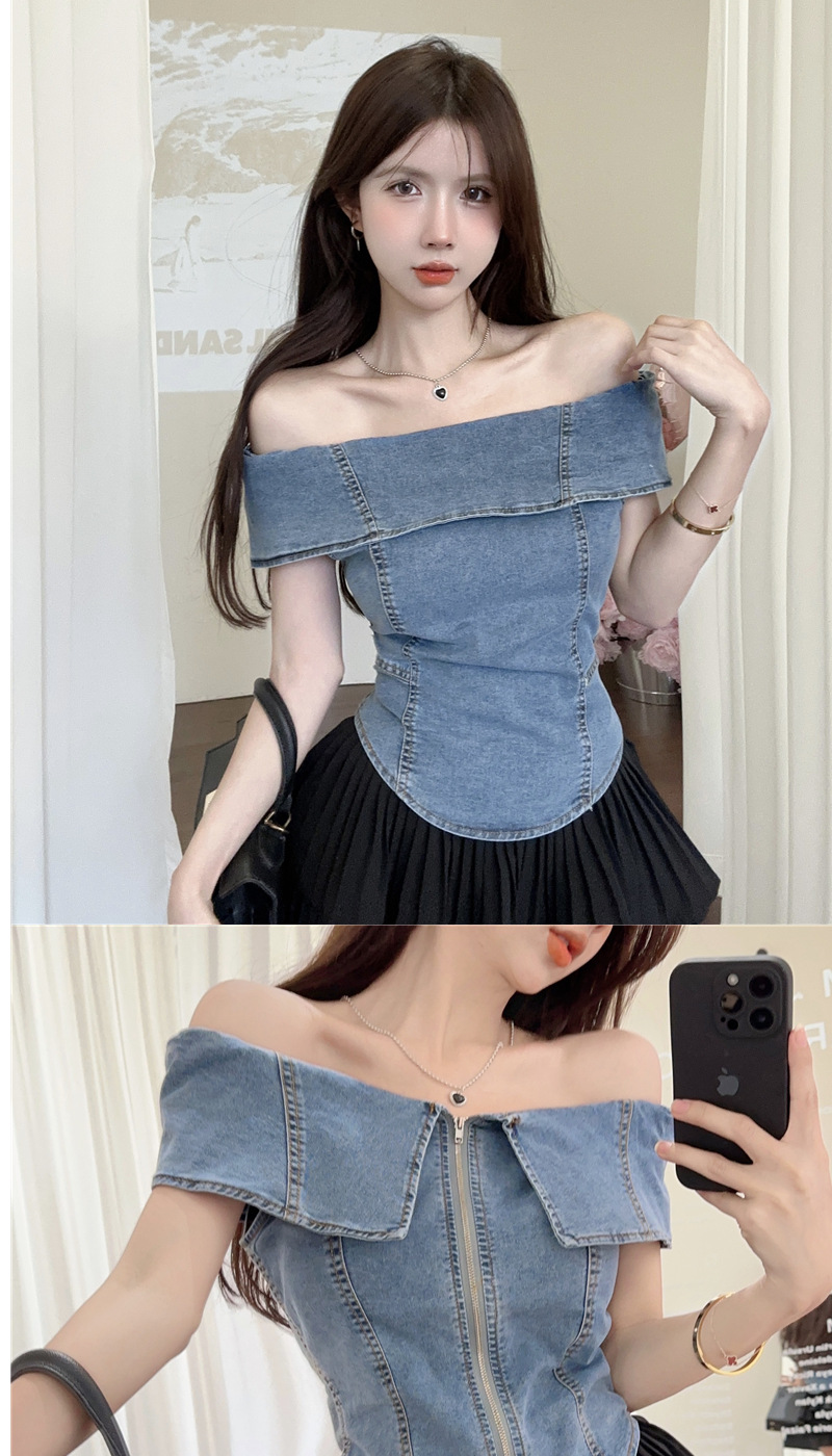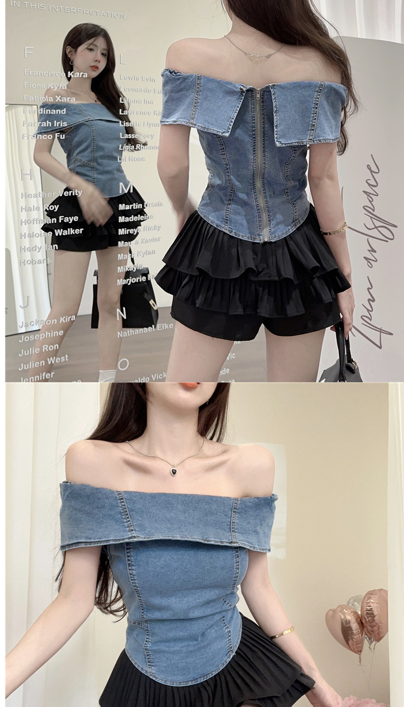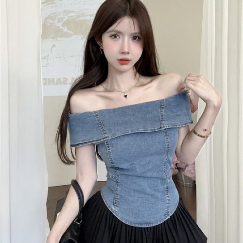 달콤한 시원한 뜨거운 소녀 오프 숄더 데님 셔츠 탑 오프 숄더 여성 여름 디자인 감각 틈새 슬리밍 짧은 셔츠