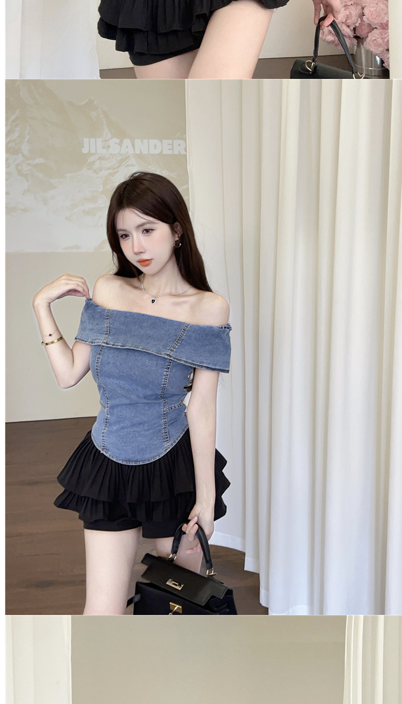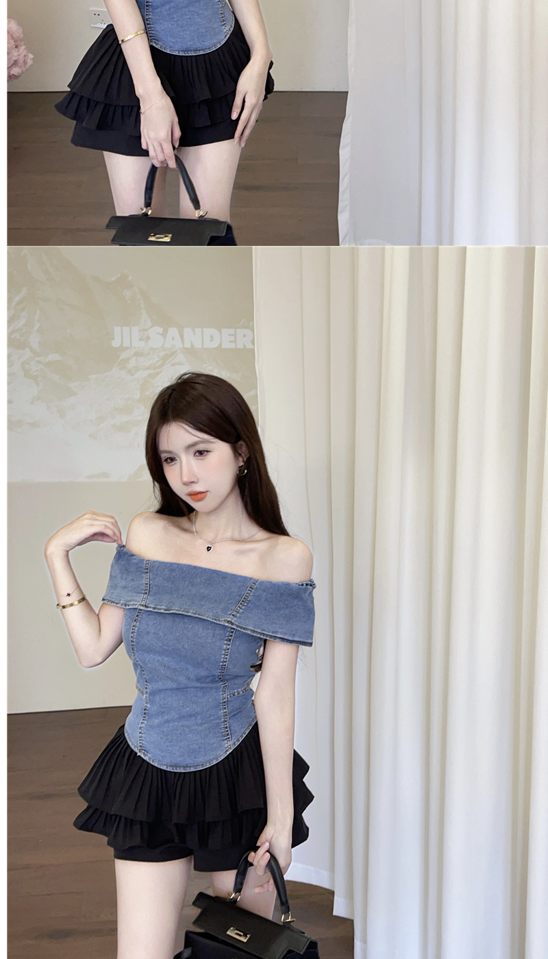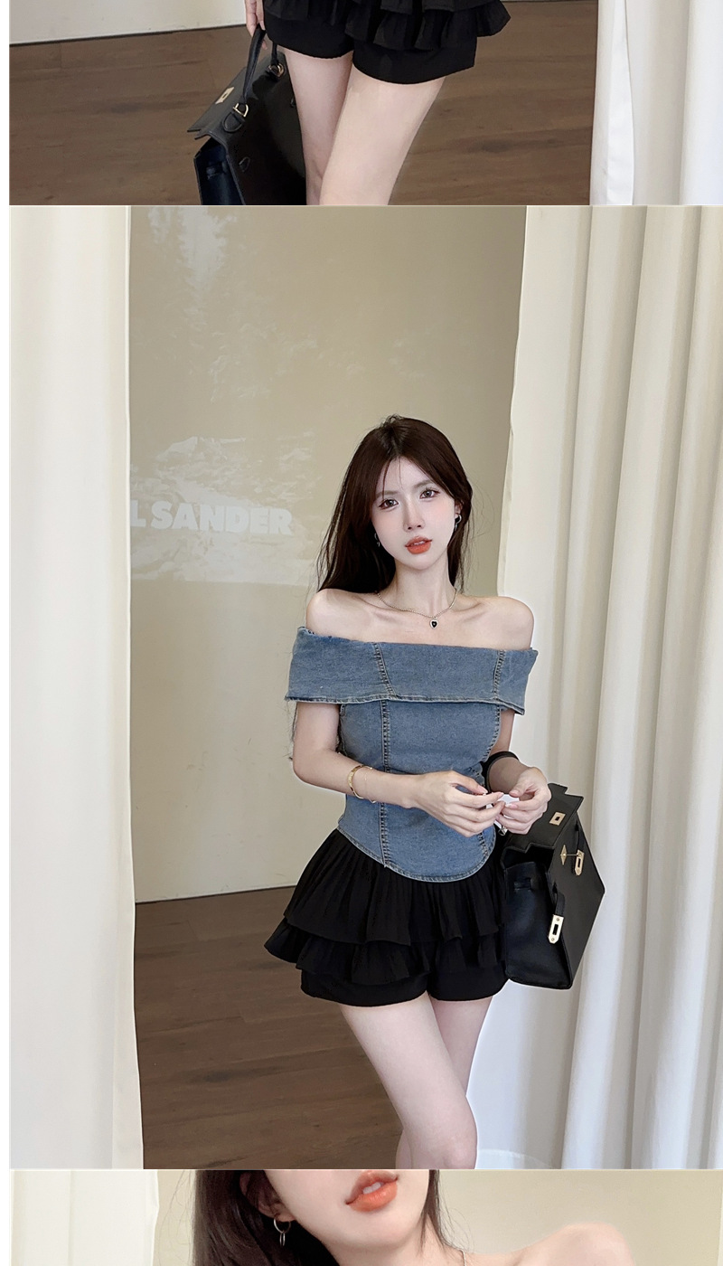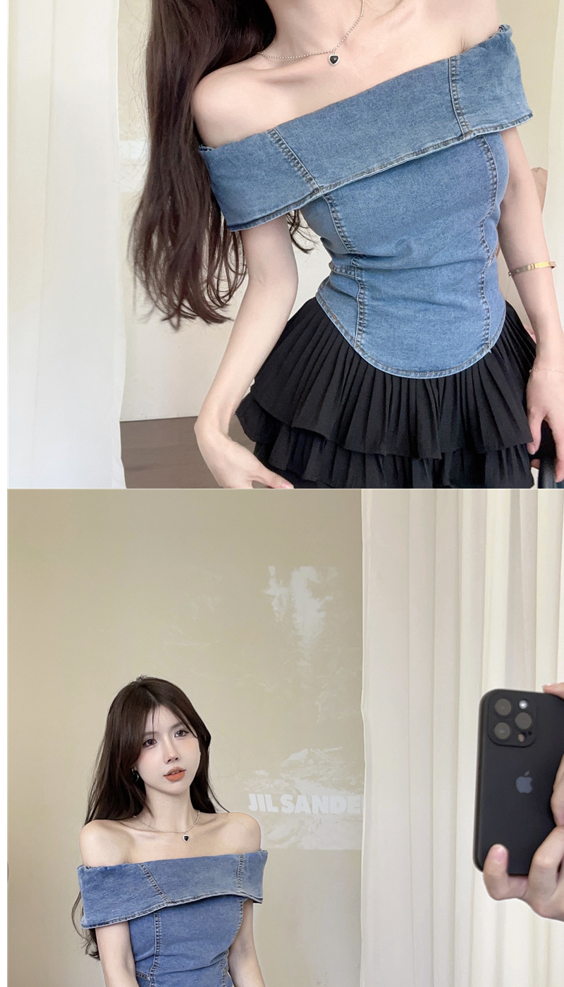 달콤한 시원한 뜨거운 소녀 오프 숄더 데님 셔츠 탑 오프 숄더 여성 여름 디자인 감각 틈새 슬리밍 짧은 셔츠