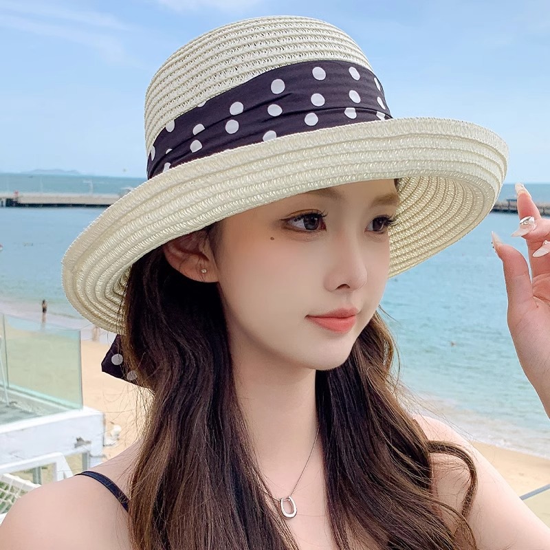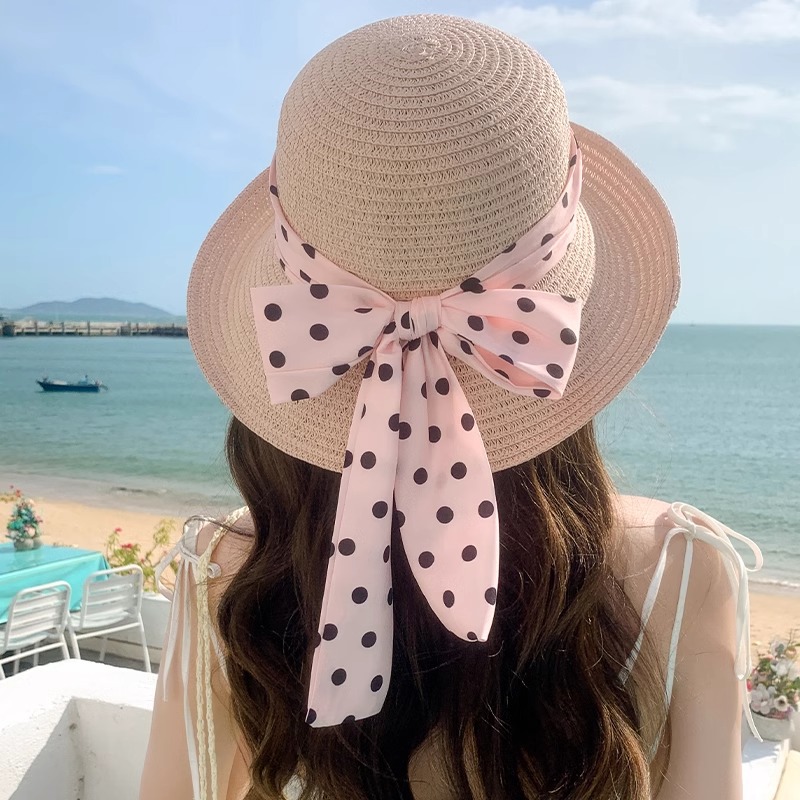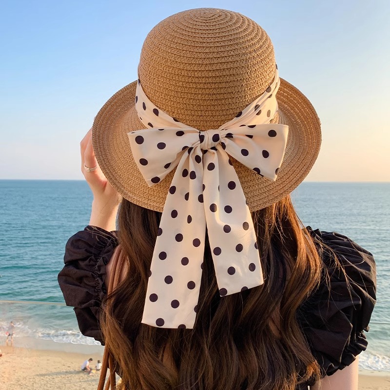 프랑스 우아한 컬링 분지 모자 폴카 도트 나비 태양 방지 밀짚 모자 여성 여름 해변 휴가 해변 태양 방지 모자