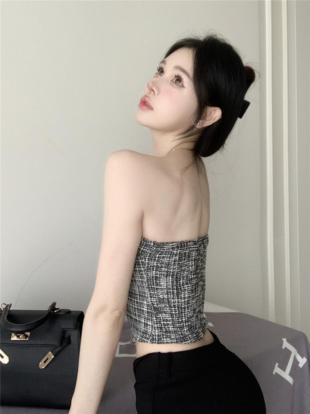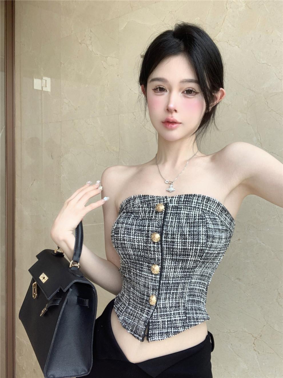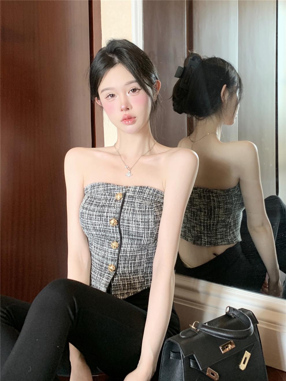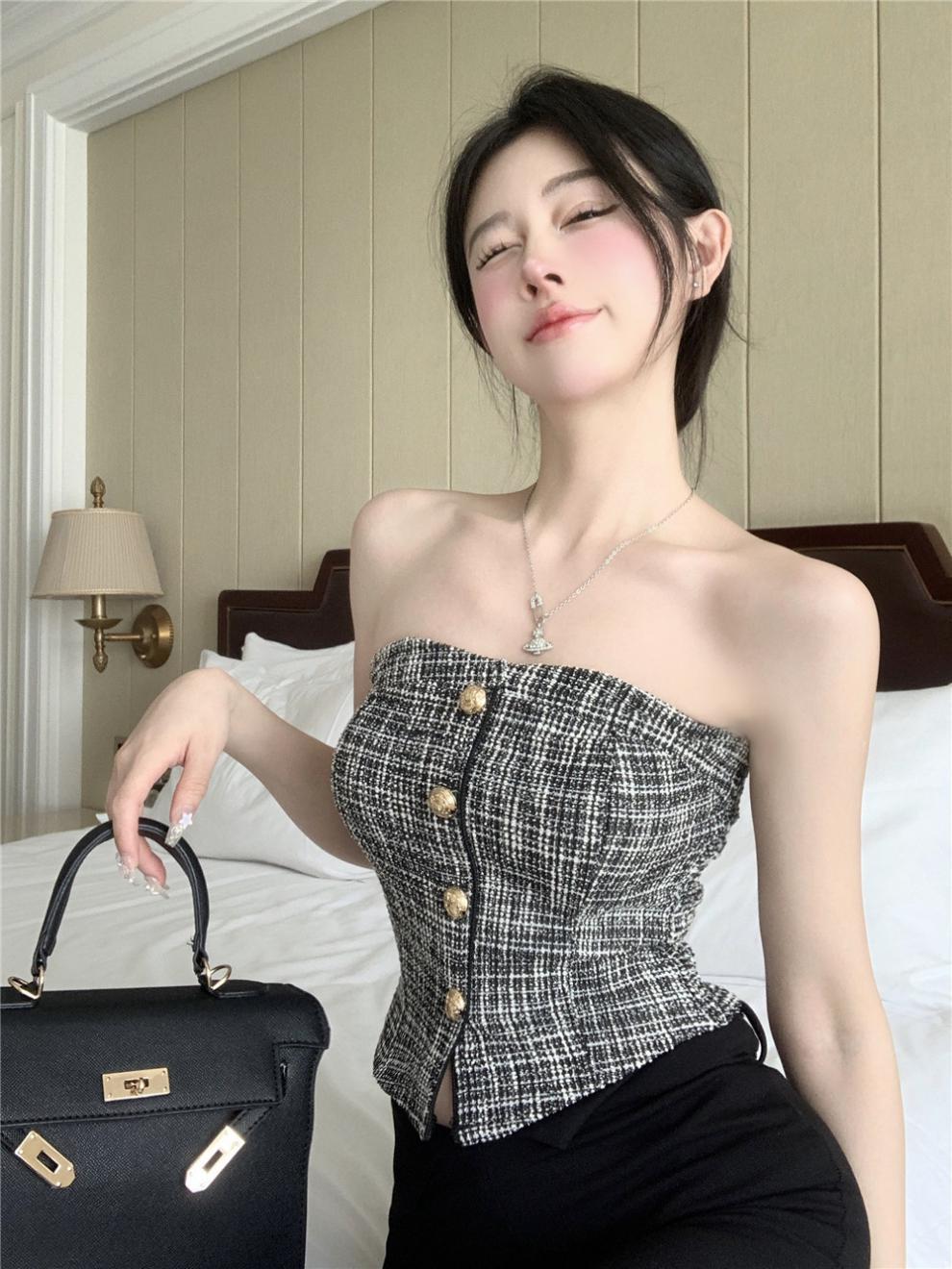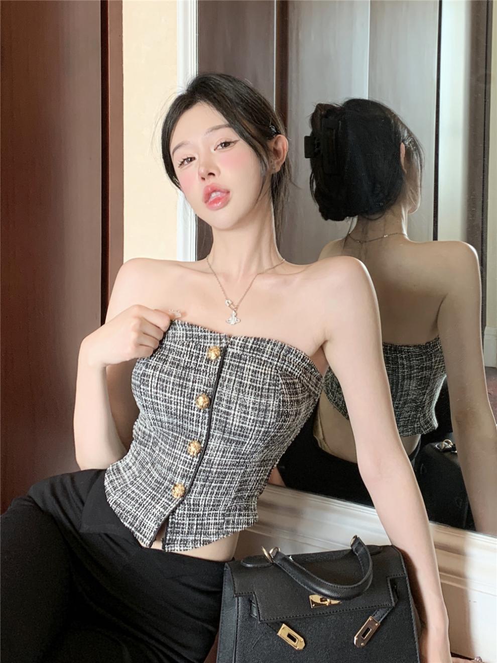 샤넬 스타일 우아한 튜브 탑 여성 여름 새로운 패션 서양식 사교계 슬림 슬리밍 짧은 최고 패션스토어 가기