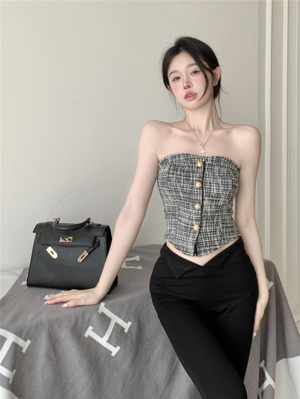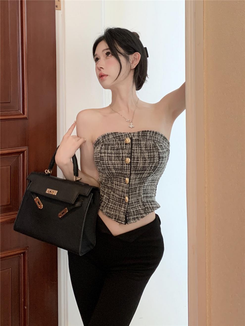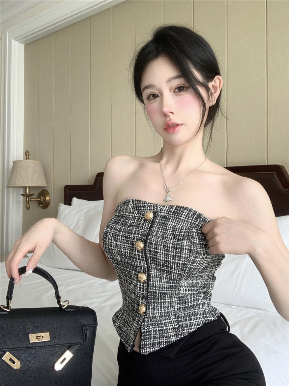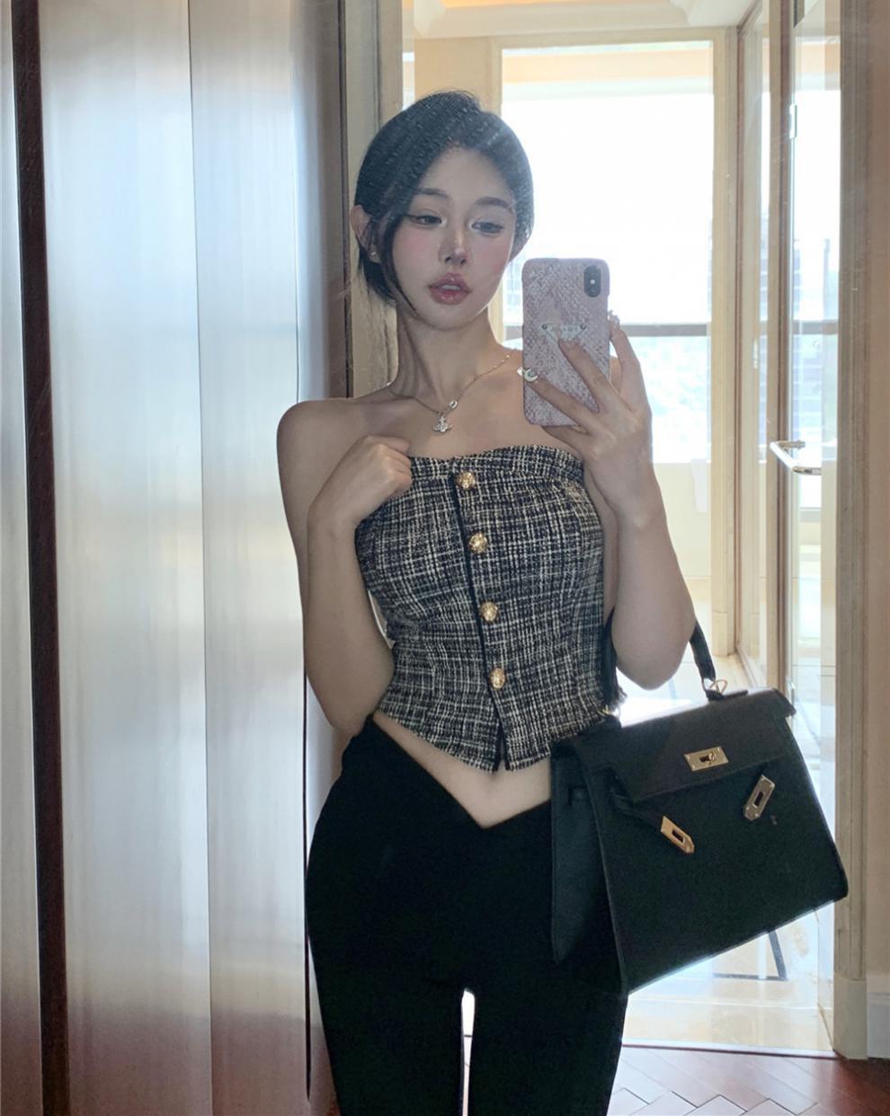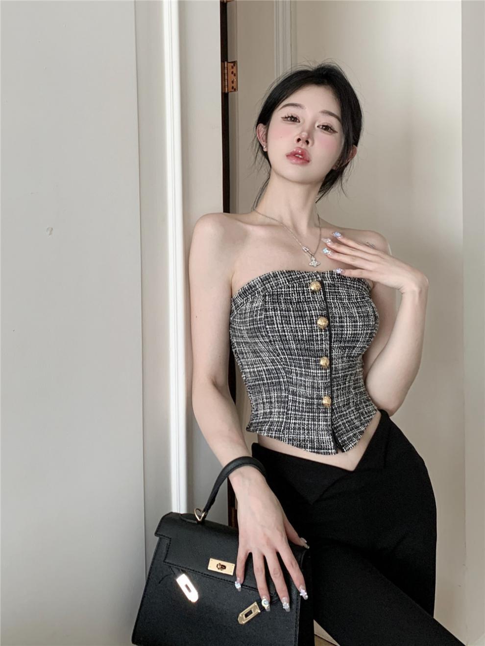 샤넬 스타일 우아한 튜브 탑 여성 여름 새로운 패션 서양식 사교계 슬림 슬리밍 짧은 최고 패션스토어 가기