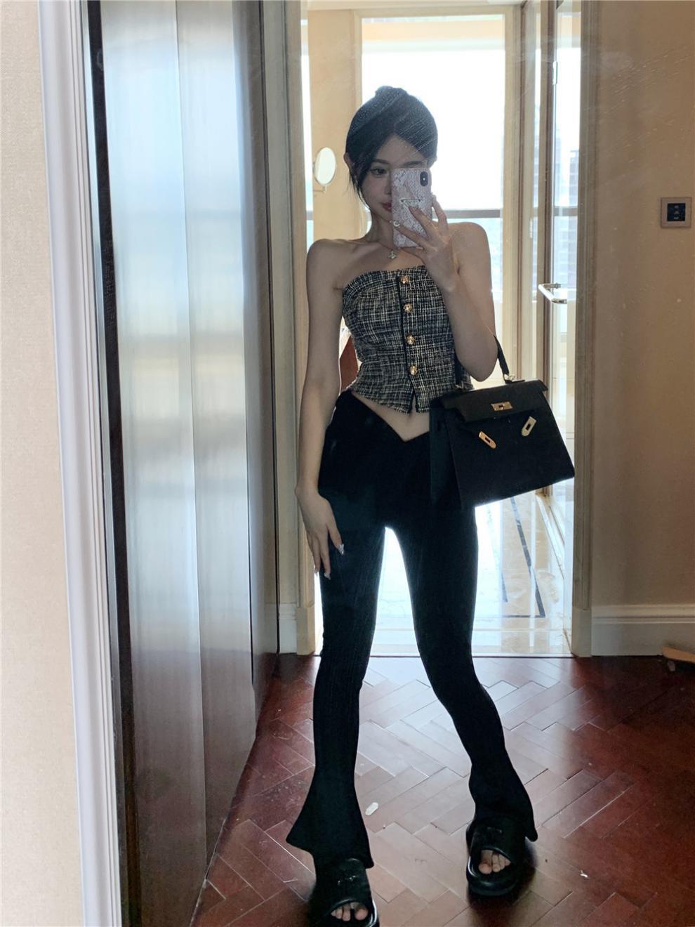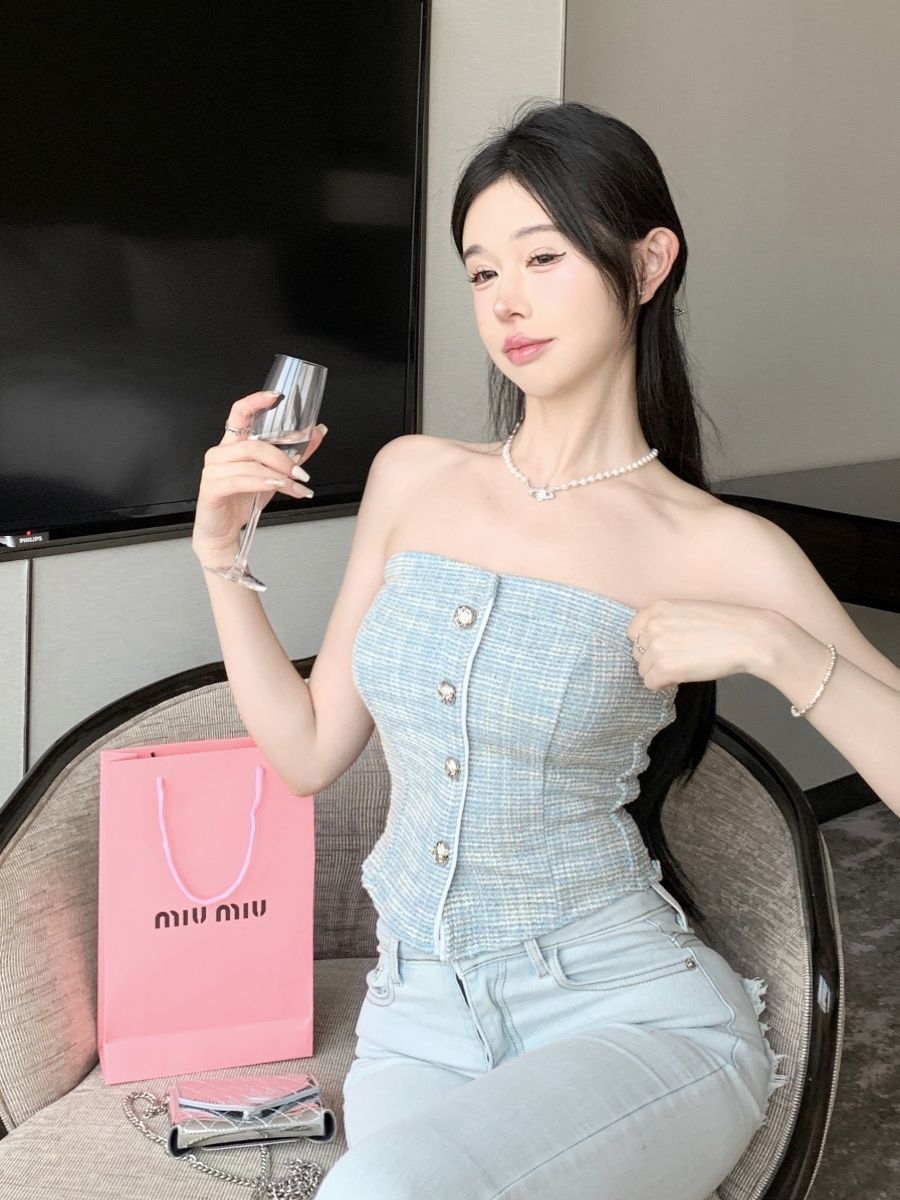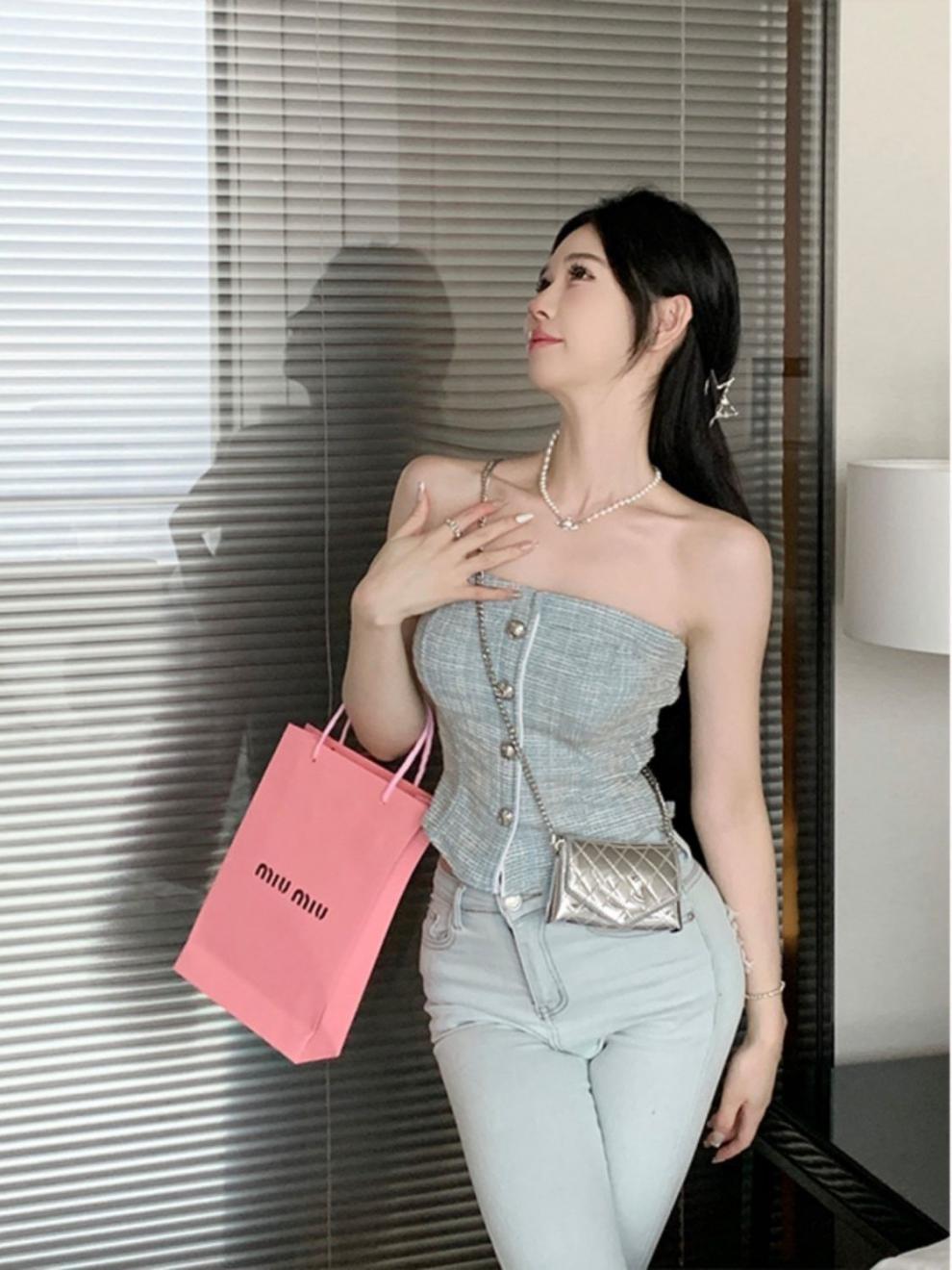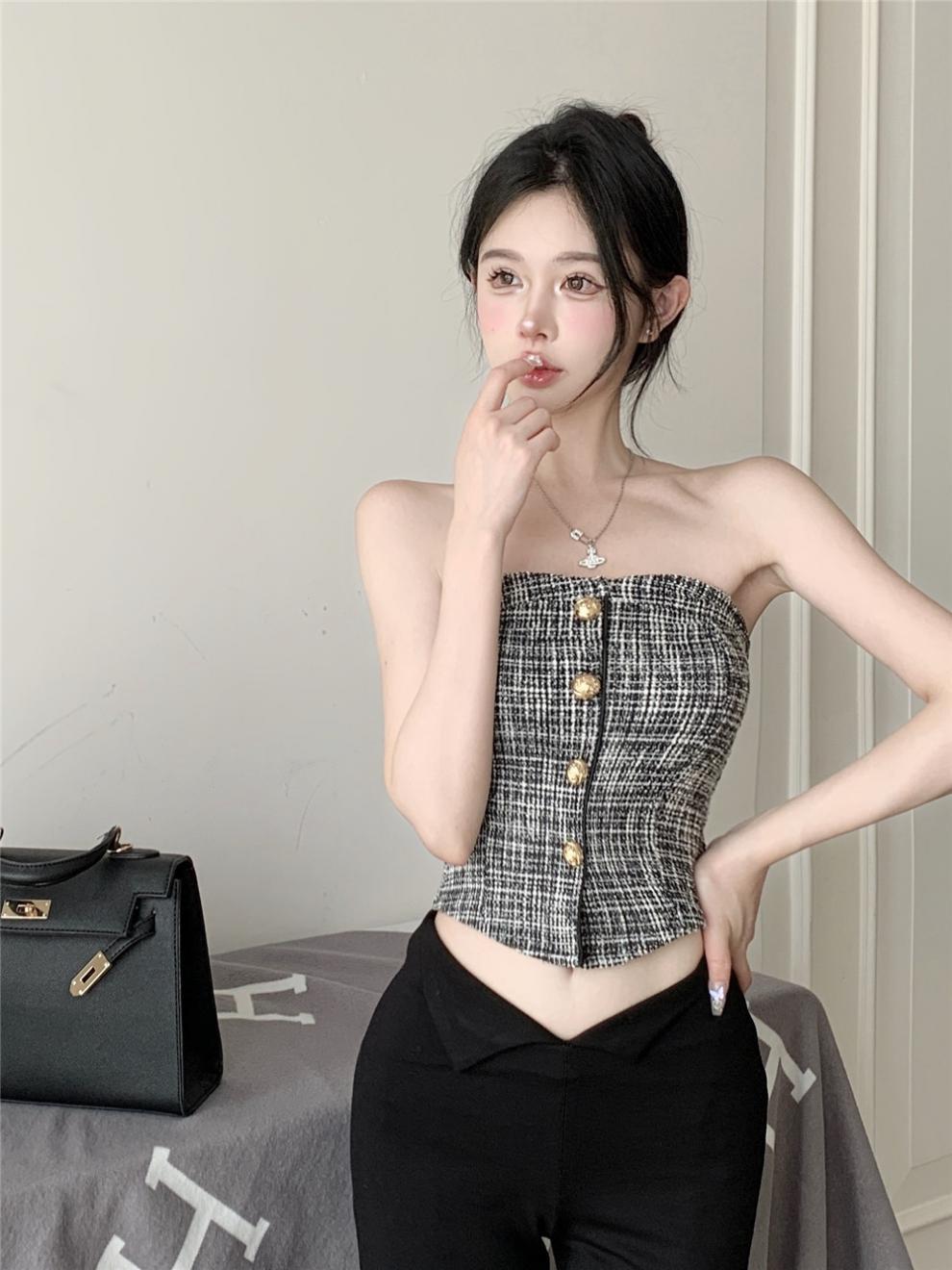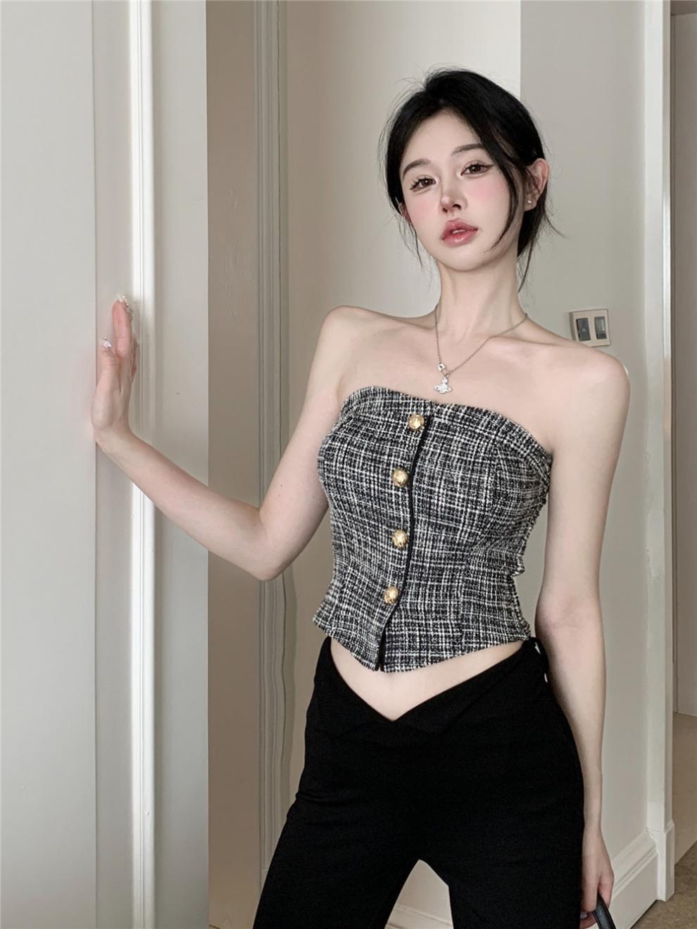 샤넬 스타일 우아한 튜브 탑 여성 여름 새로운 패션 서양식 사교계 슬림 슬리밍 짧은 최고 패션스토어 가기