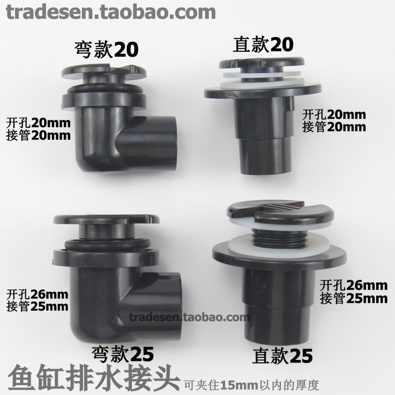 产品尺寸:开孔20~22mm或开孔26~28mm,可接外径20和25mm的硬水管。可夹住15mm厚度以内的玻璃,如是很薄的塑料水箱可适当锯短牙管使用;。