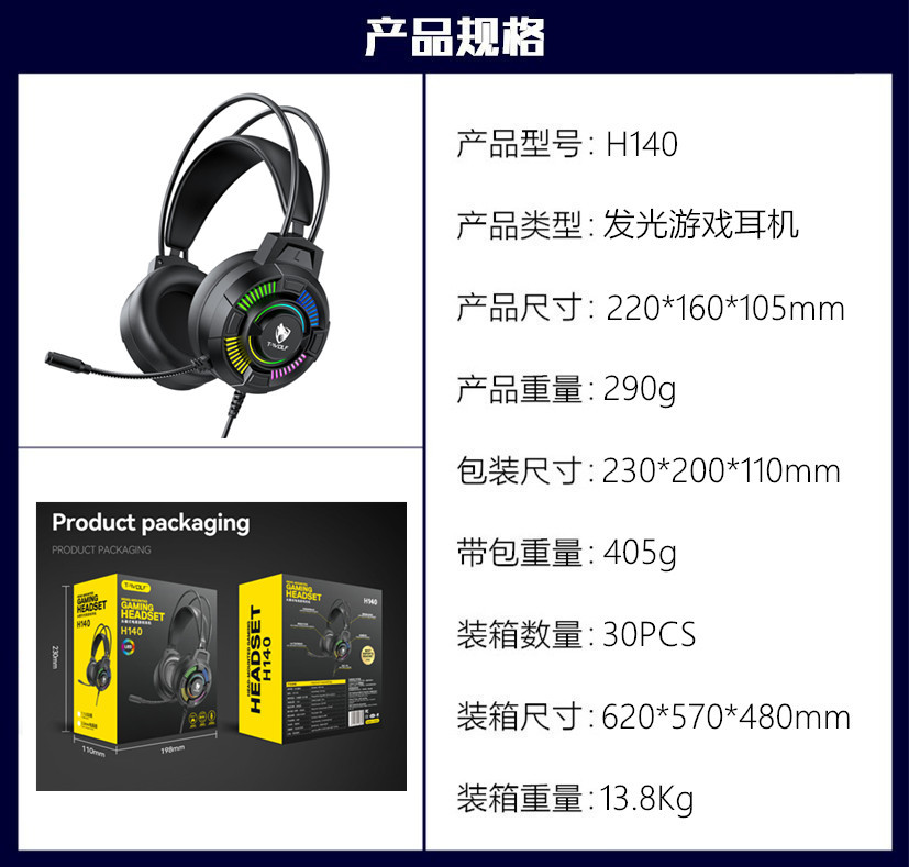 T-WOLF 레이 랭 H140 컴퓨터 헤드셋 발광 RGB 유선 게이밍 헤드셋 7.1 헤드셋 2 대 1