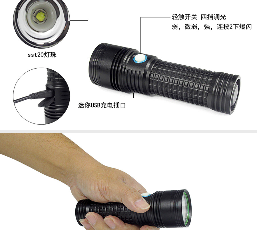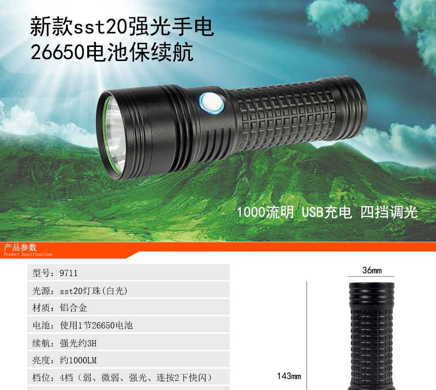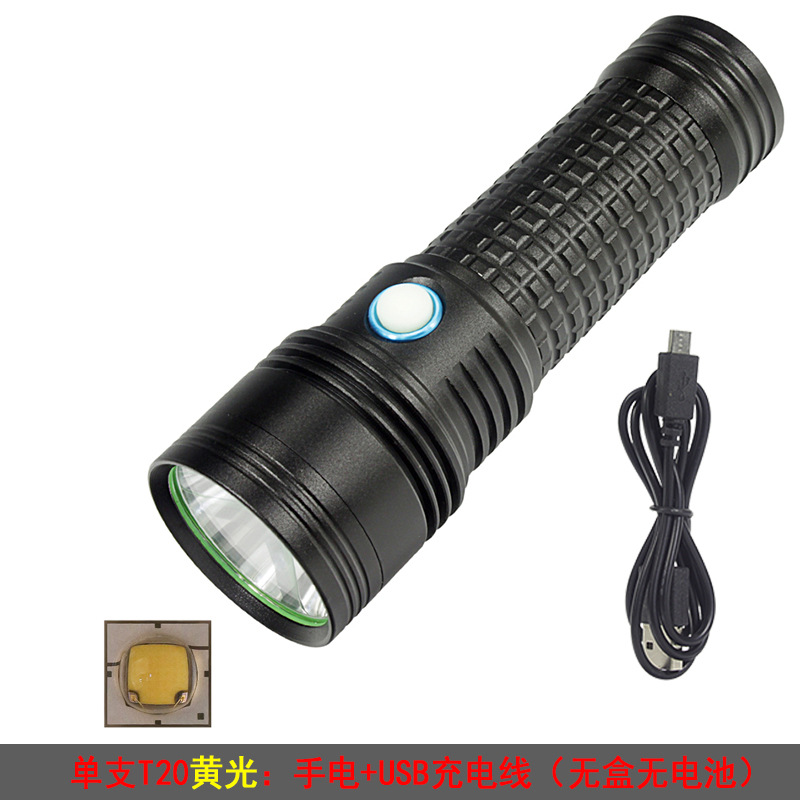 국경 T20 노란색 LED 손전등 야외 충전식 알루미늄 합금 편리한 조명 장비 순찰 보안 검색 등