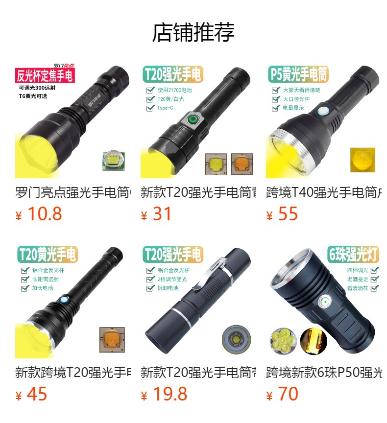 국경 T20 노란색 LED 손전등 야외 충전식 알루미늄 합금 편리한 조명 장비 순찰 보안 검색 등스토어 가기