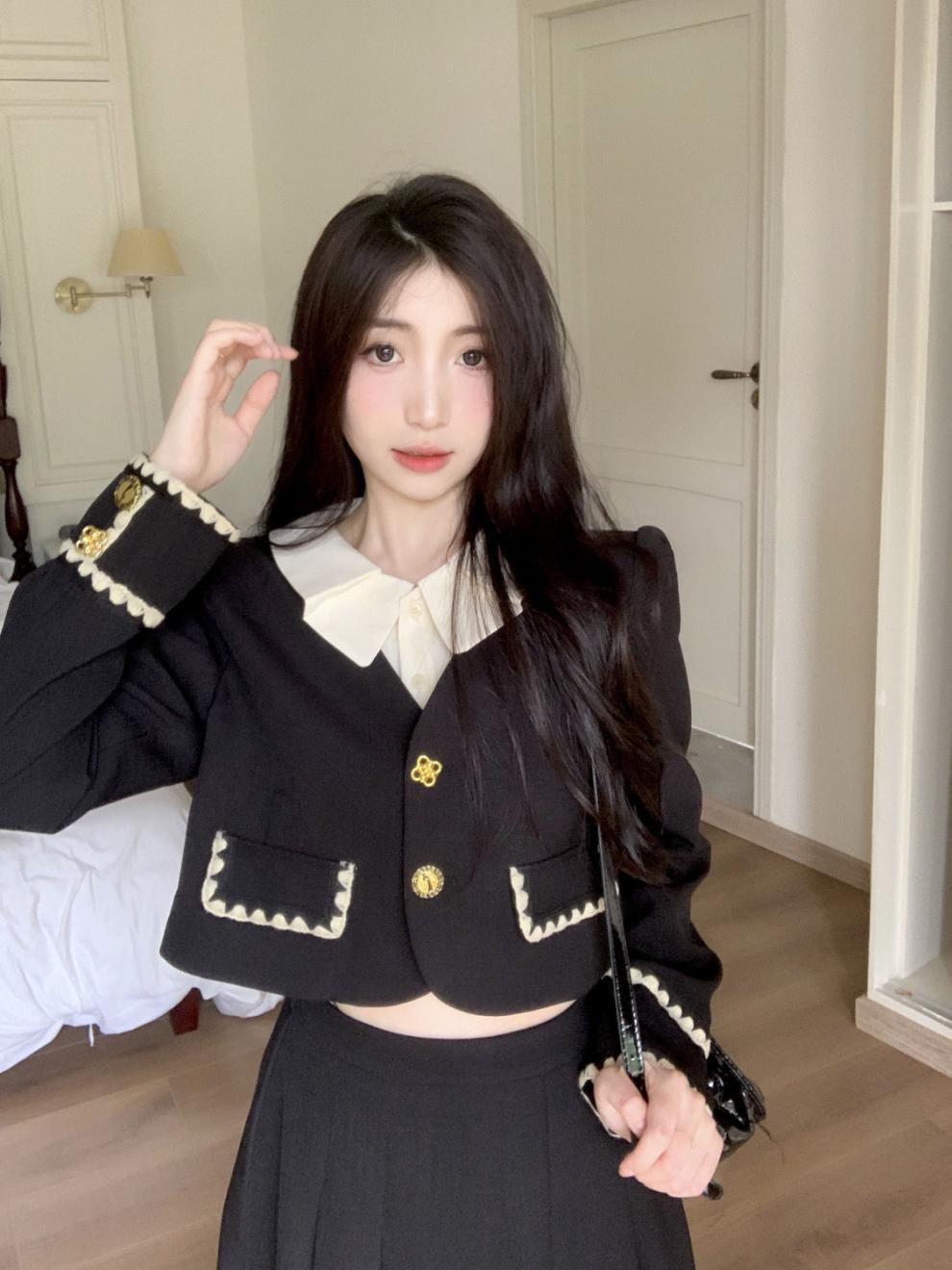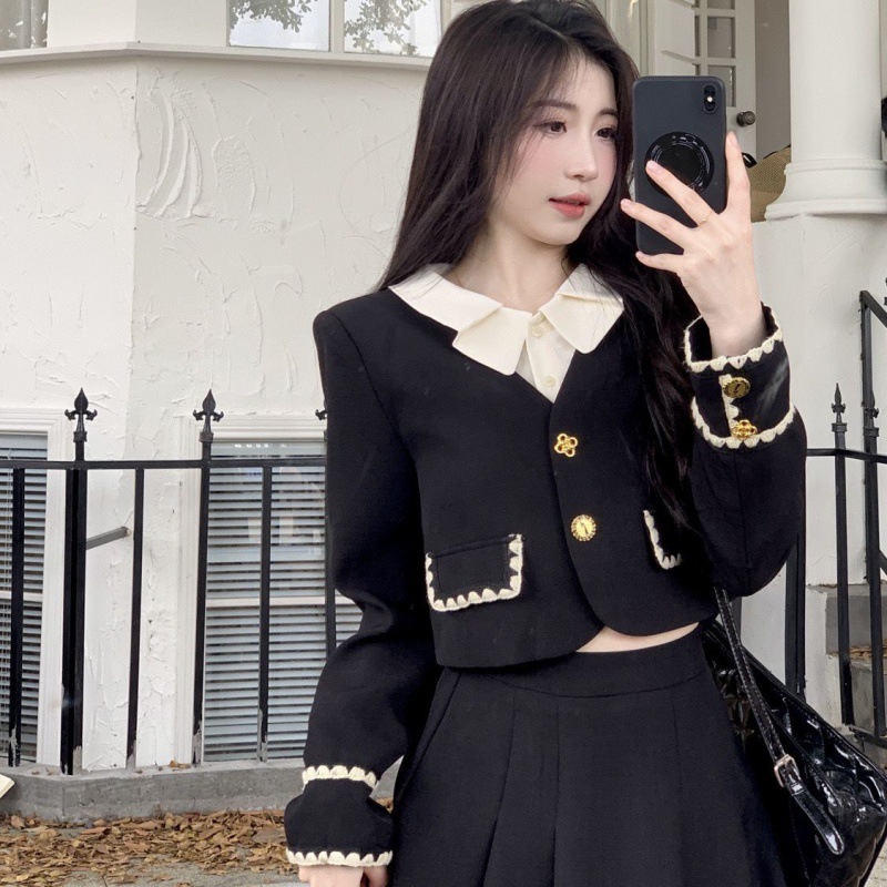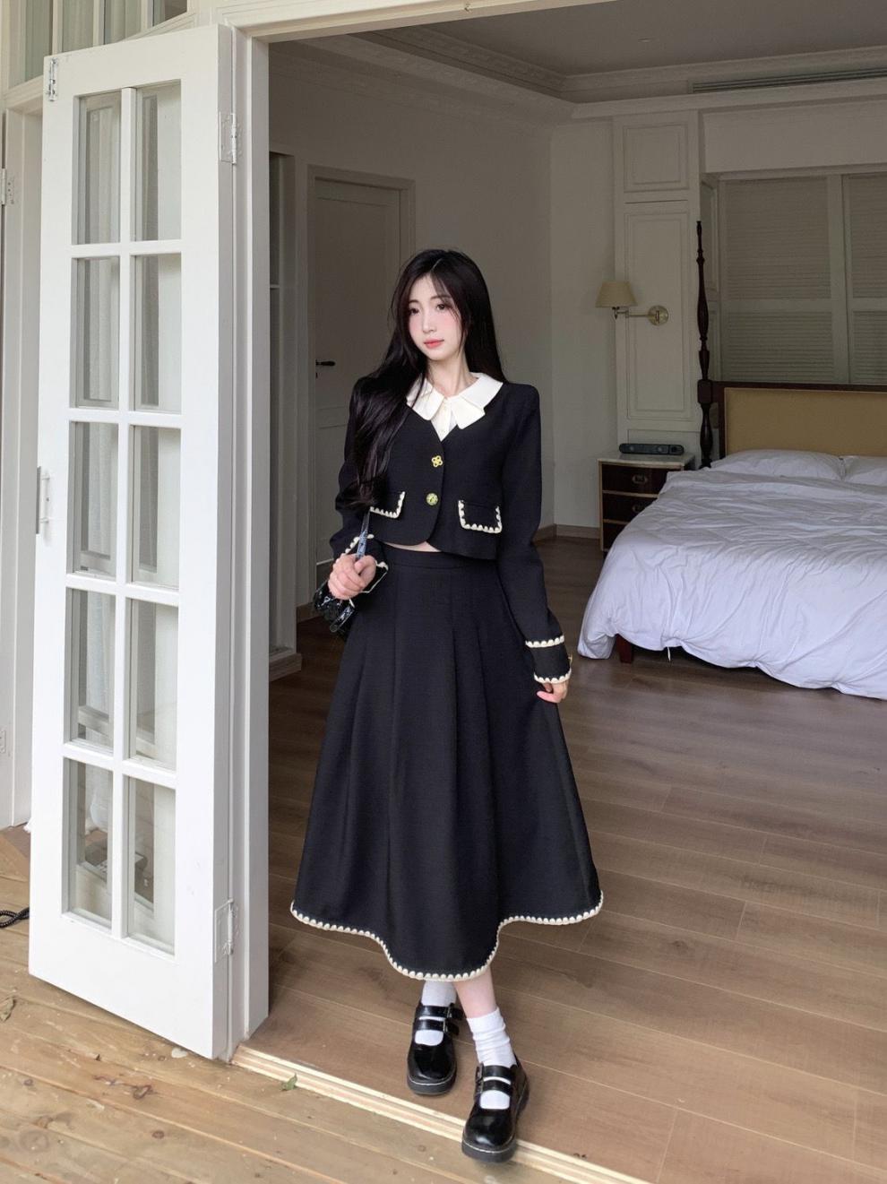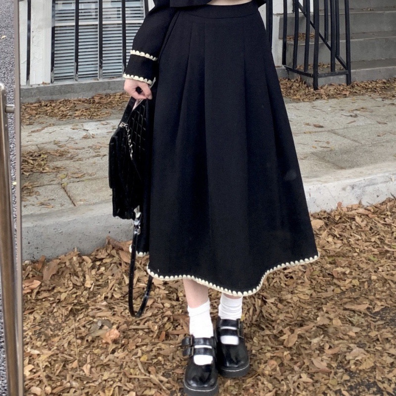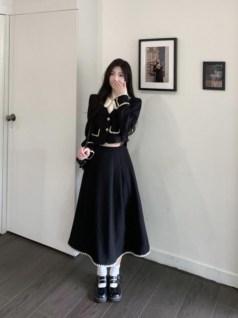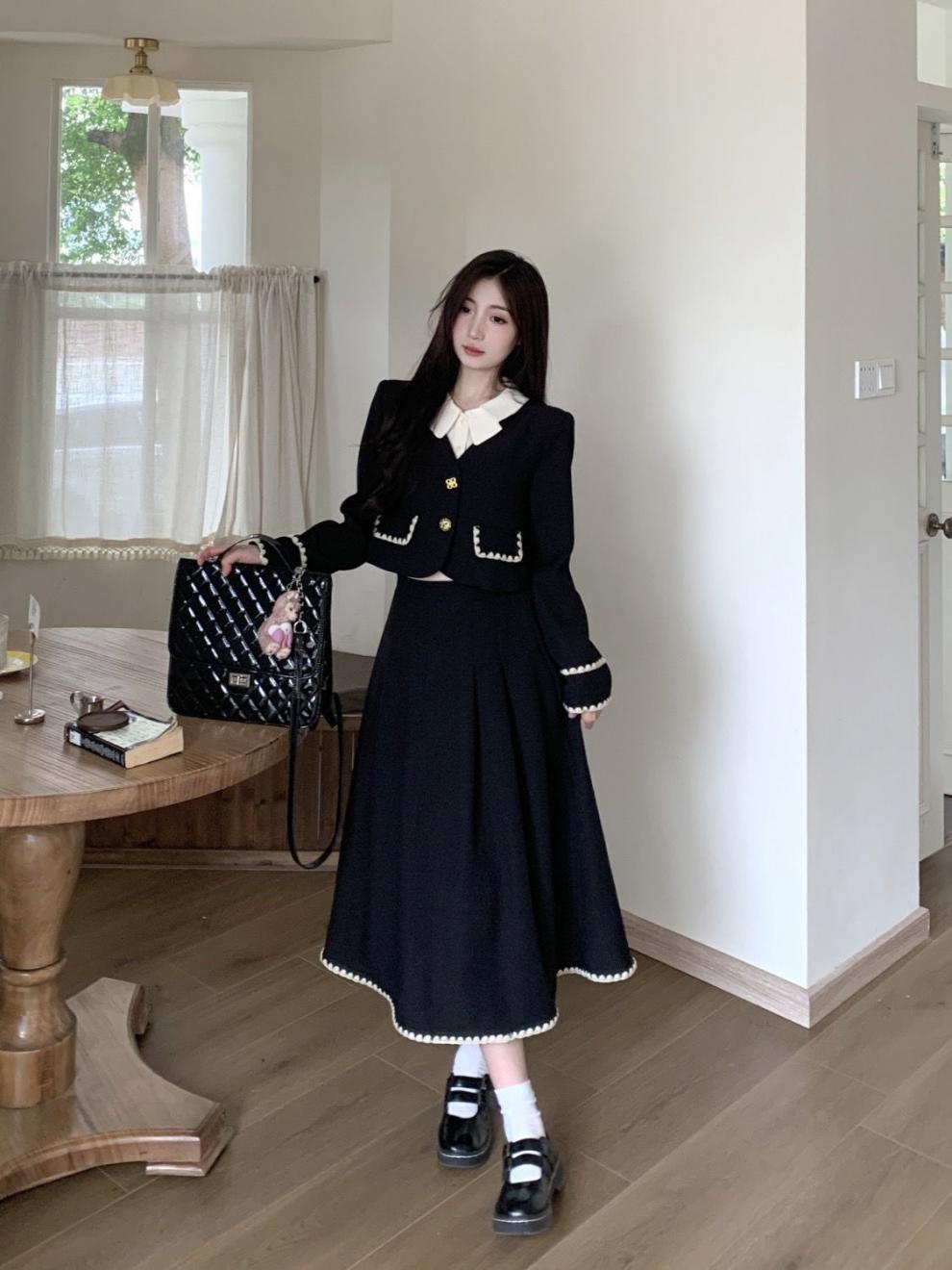 가을 샤넬 스타일 우아한 복고풍 슬리밍 다목적 프랑스 헵번 스타일 스티칭 탑 + 스커트 투피스 세트