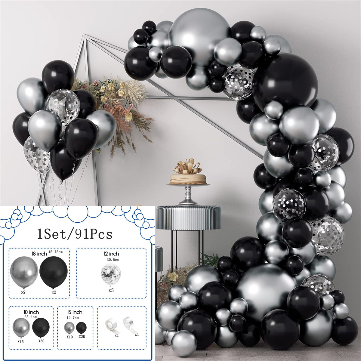 • 검은 색과 실버 풍선 세트