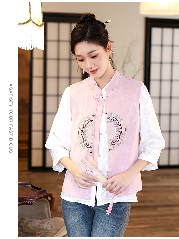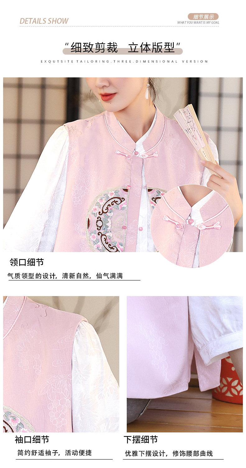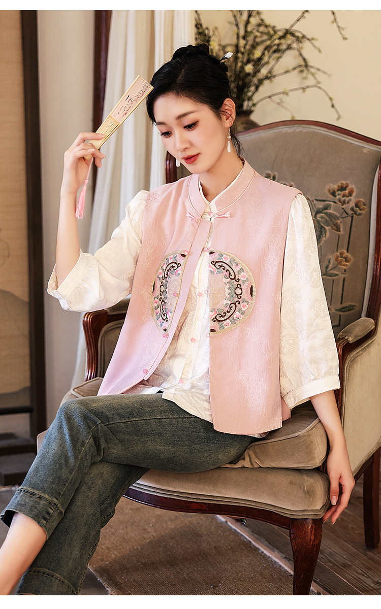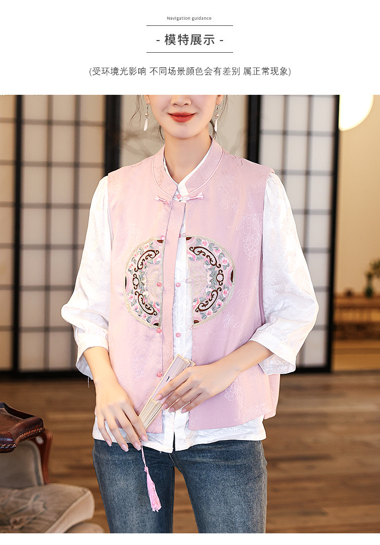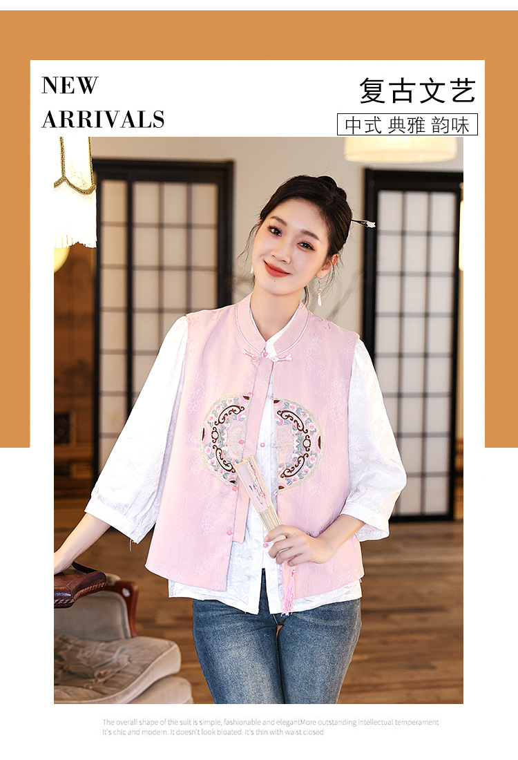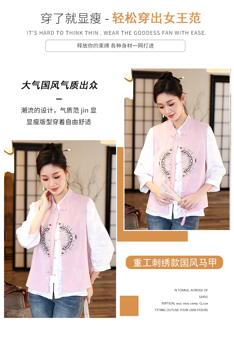 자수 조끼 여성 복고풍 중국 스타일 조끼 여성 2024 봄 새로운 중국 스타일 버클 라운드 넥 민소매 양복 조끼 탑