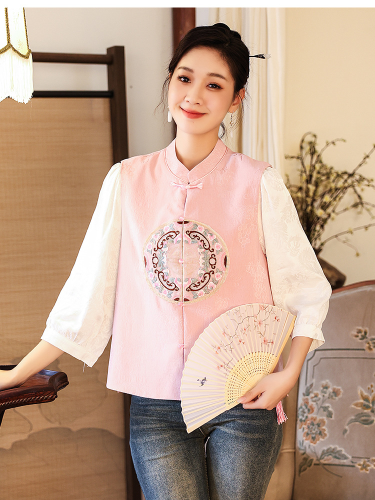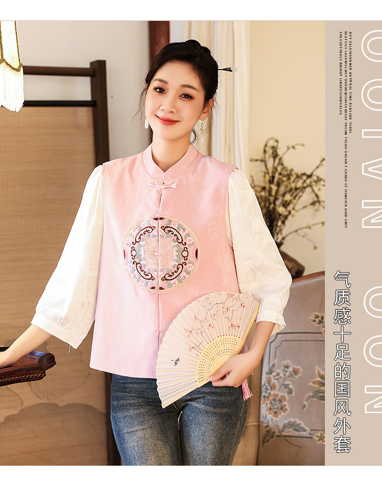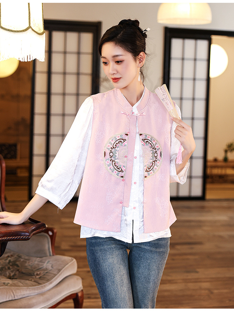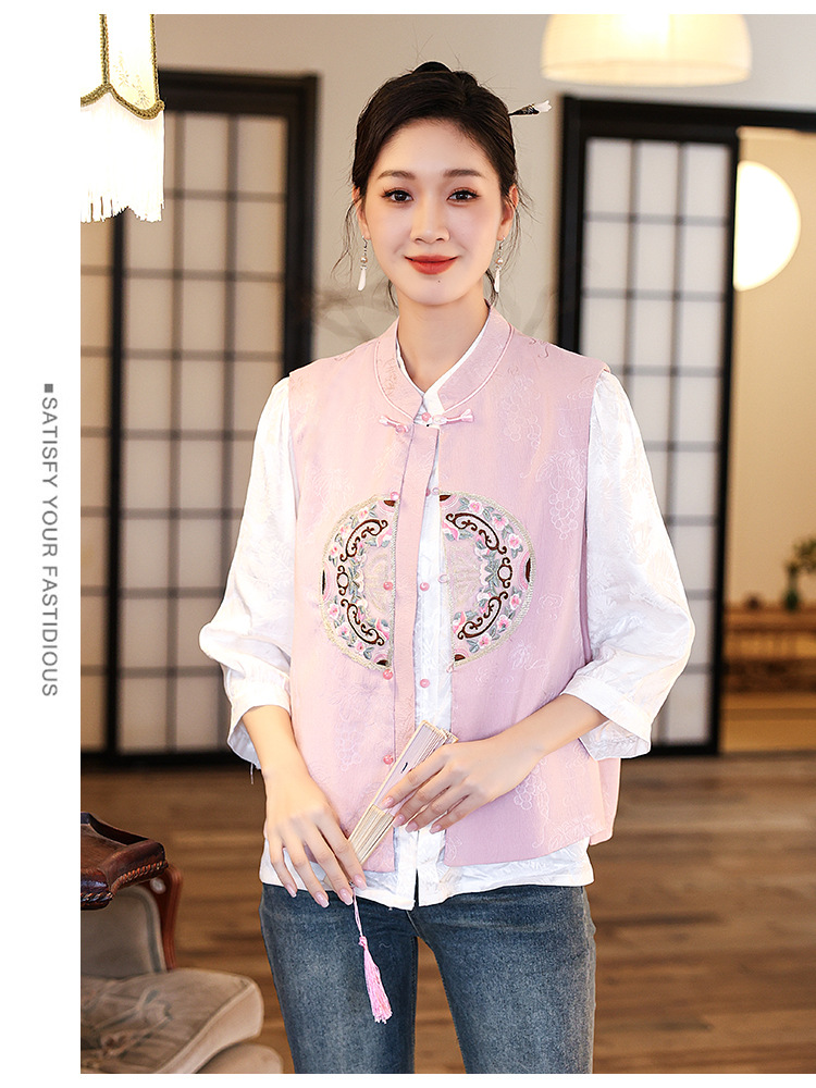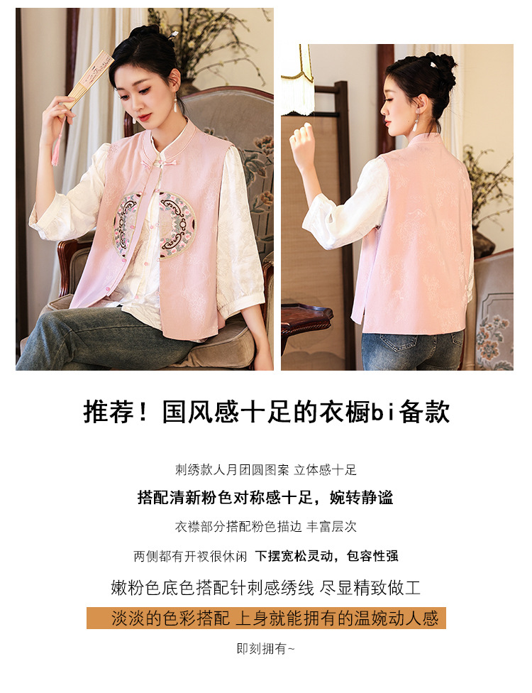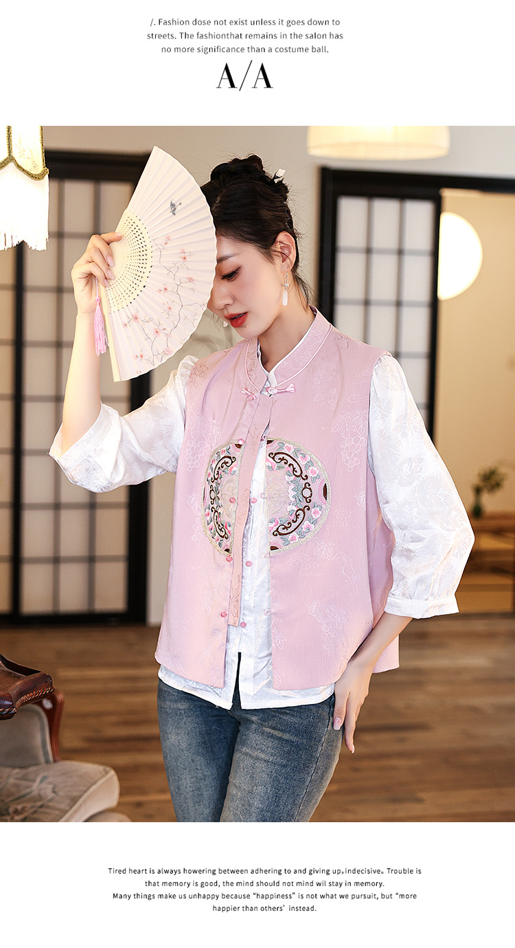 자수 조끼 여성 복고풍 중국 스타일 조끼 여성 2024 봄 새로운 중국 스타일 버클 라운드 넥 민소매 양복 조끼 탑