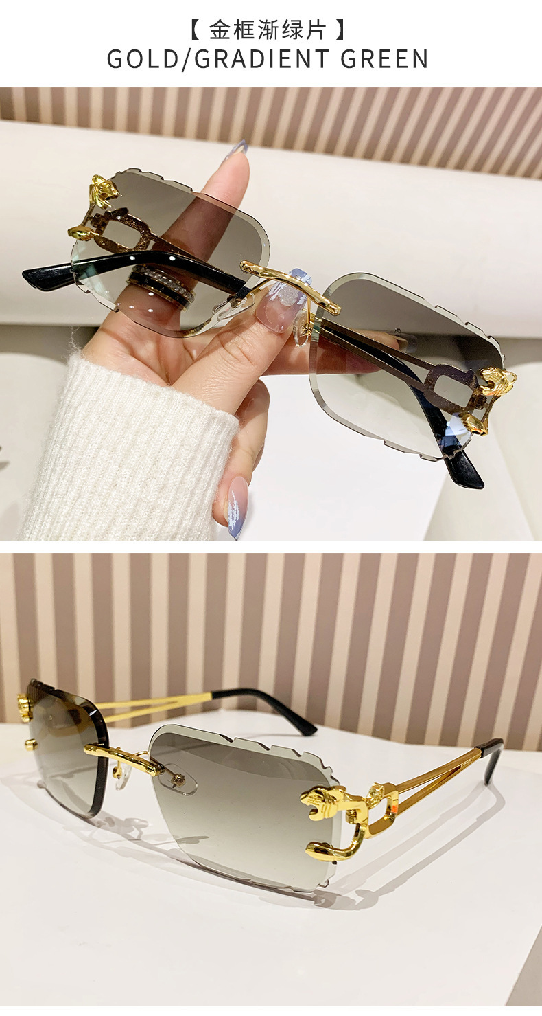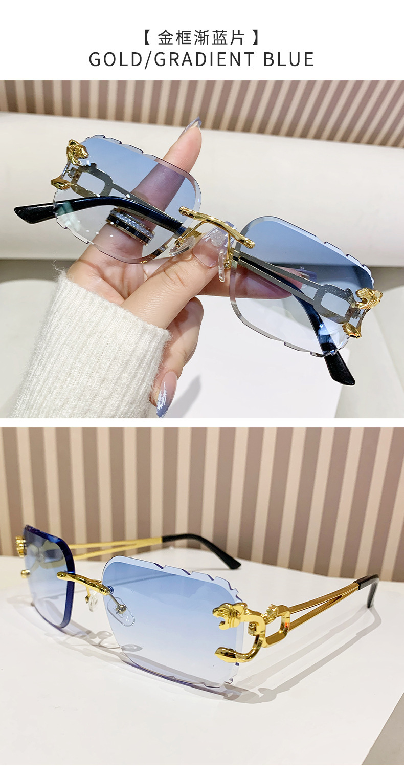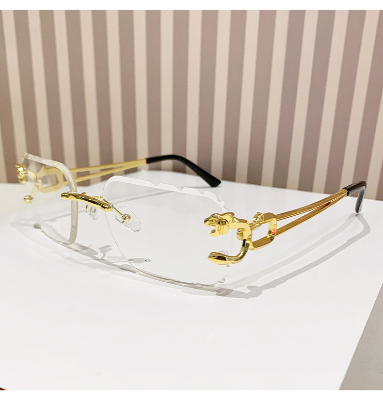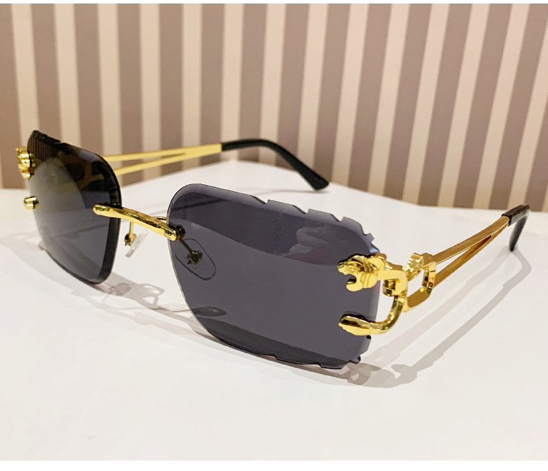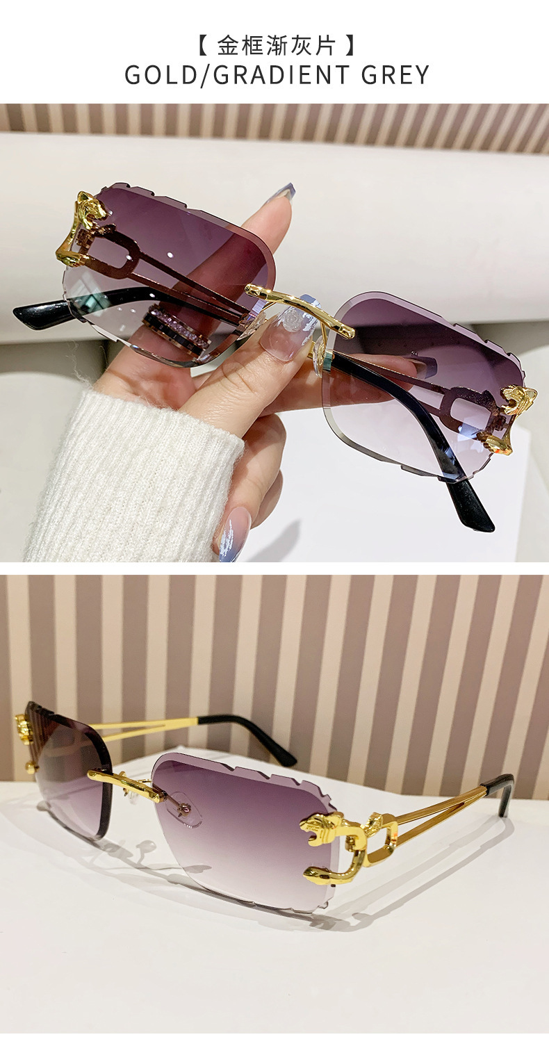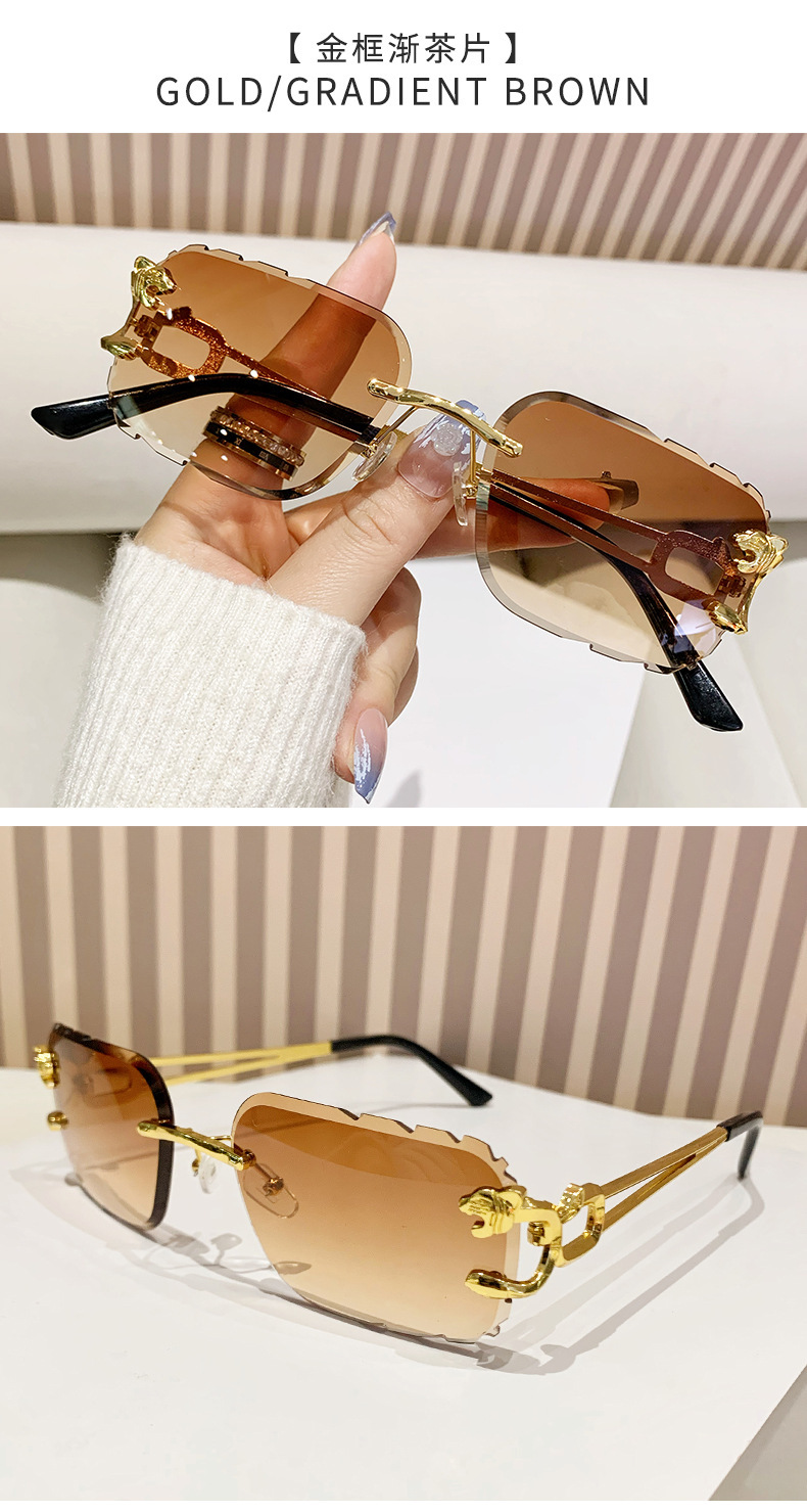 프레임리스 레오파드 헤드 선글라스 금속 선글라스 불규칙한 중공 안경 다리 선글라스 여성의 고급 일반 안경