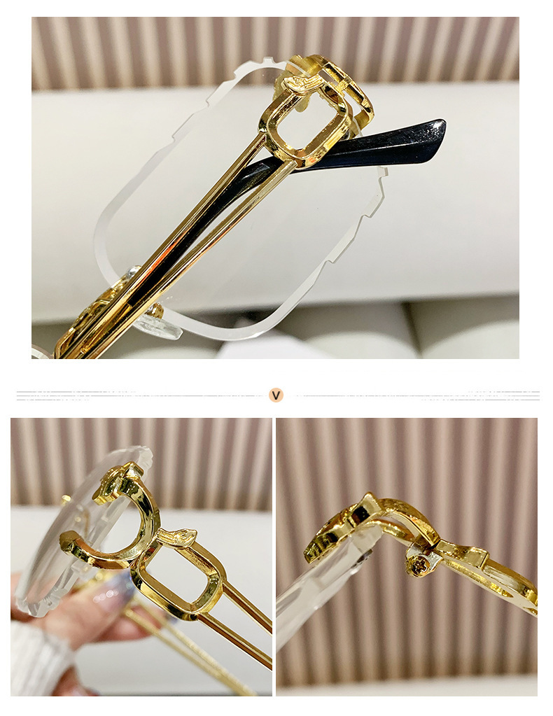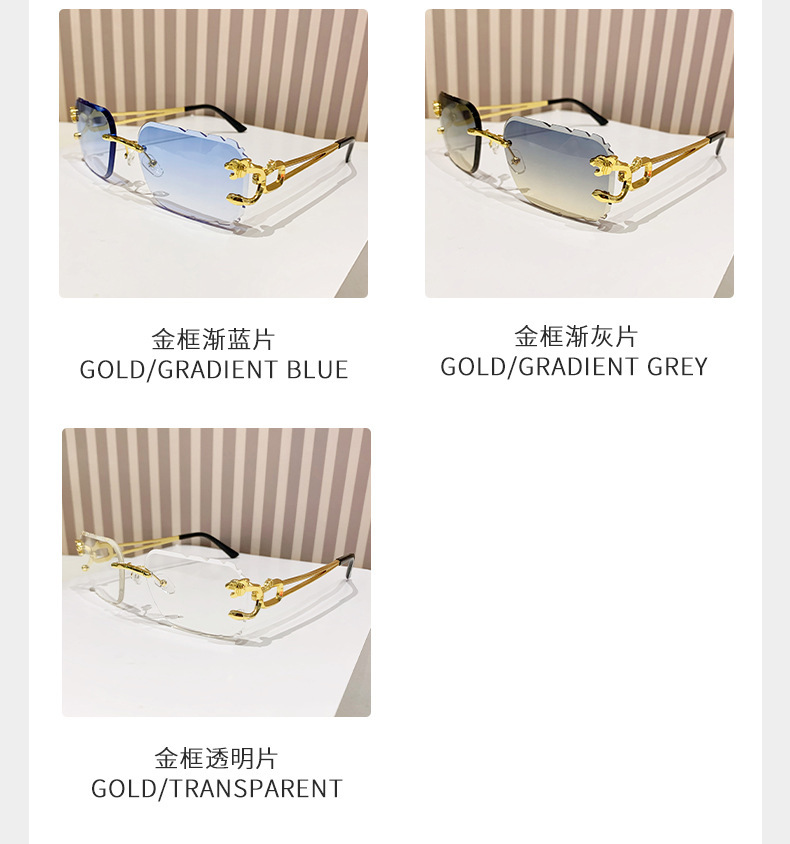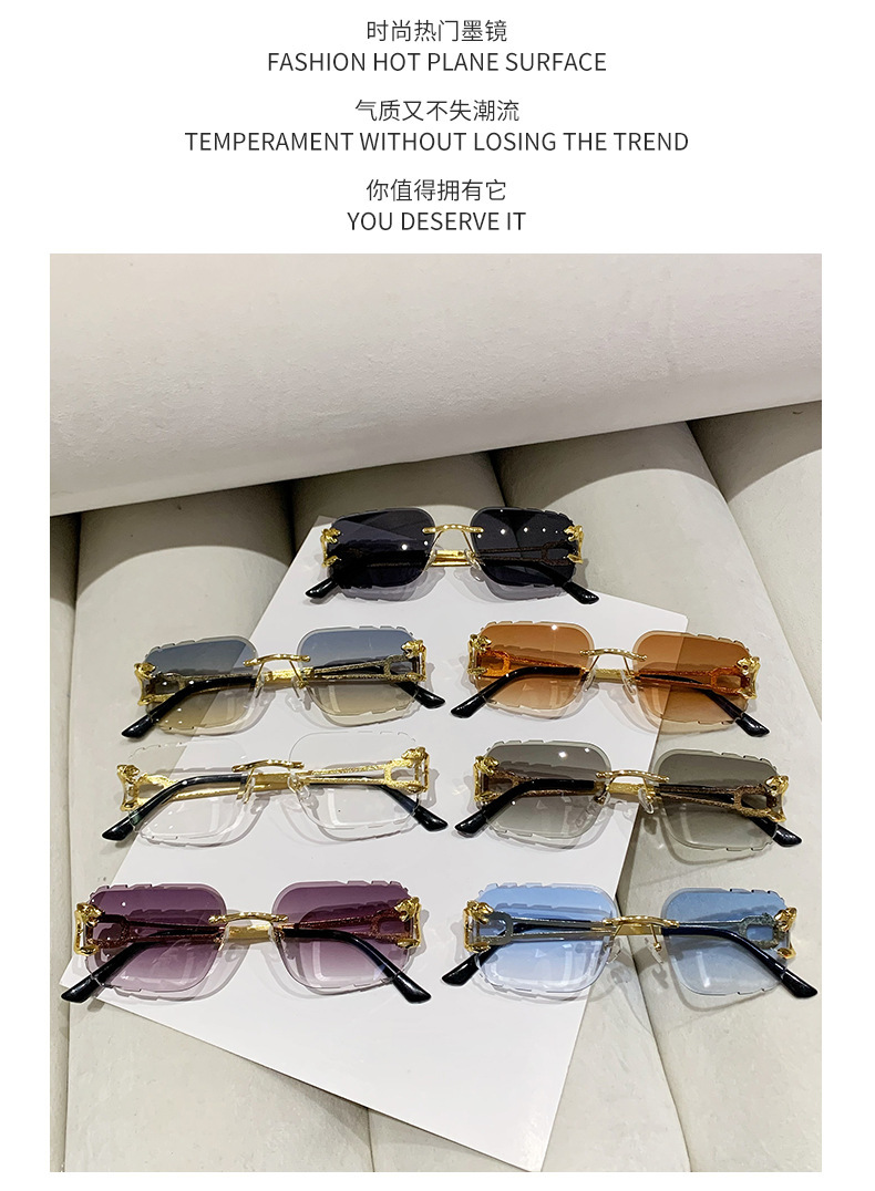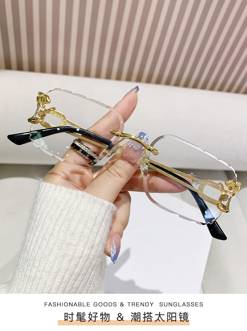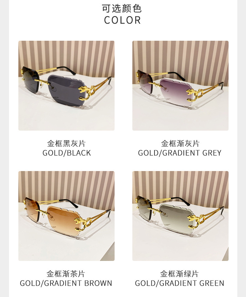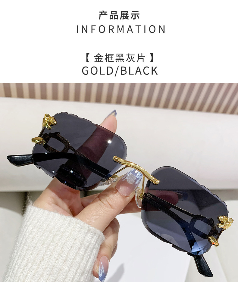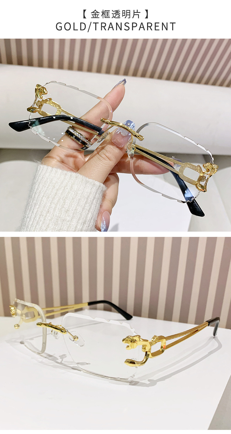 프레임리스 레오파드 헤드 선글라스 금속 선글라스 불규칙한 중공 안경 다리 선글라스 여성의 고급 일반 안경