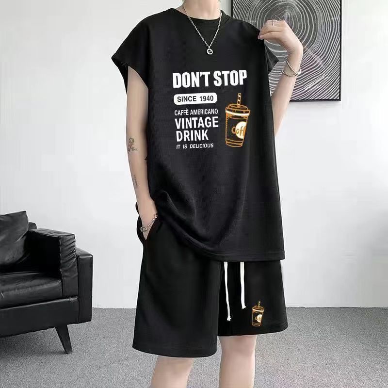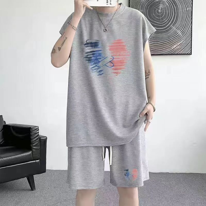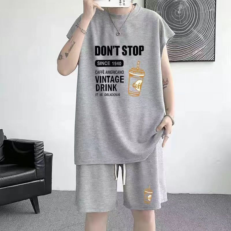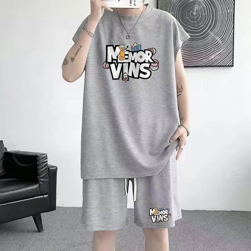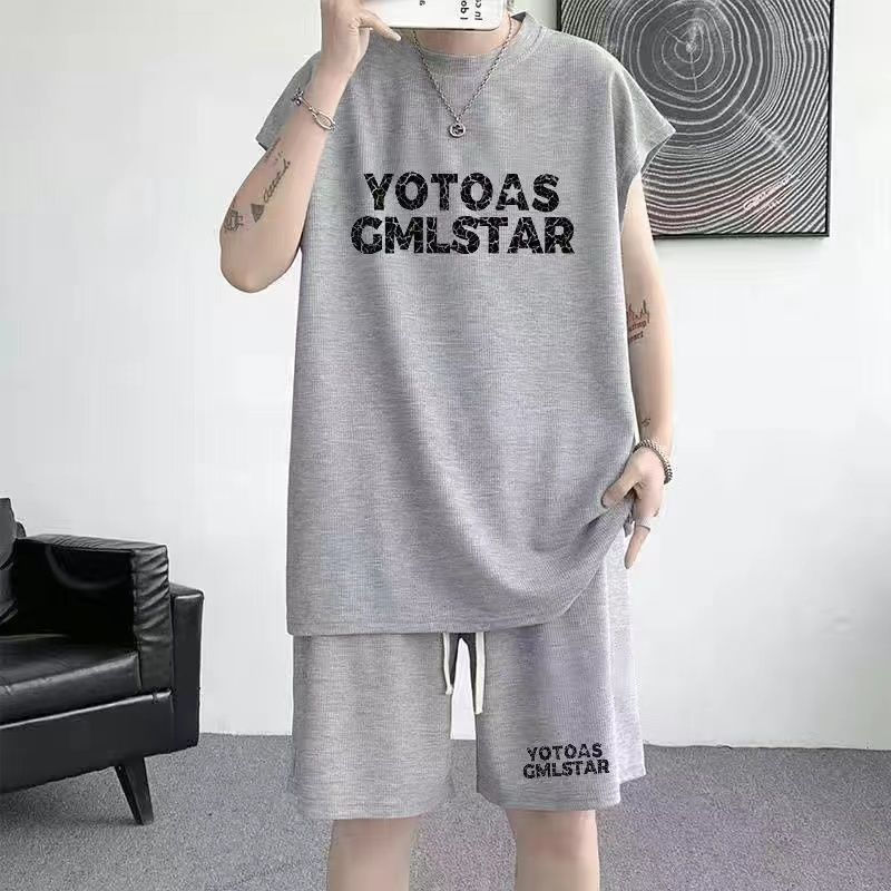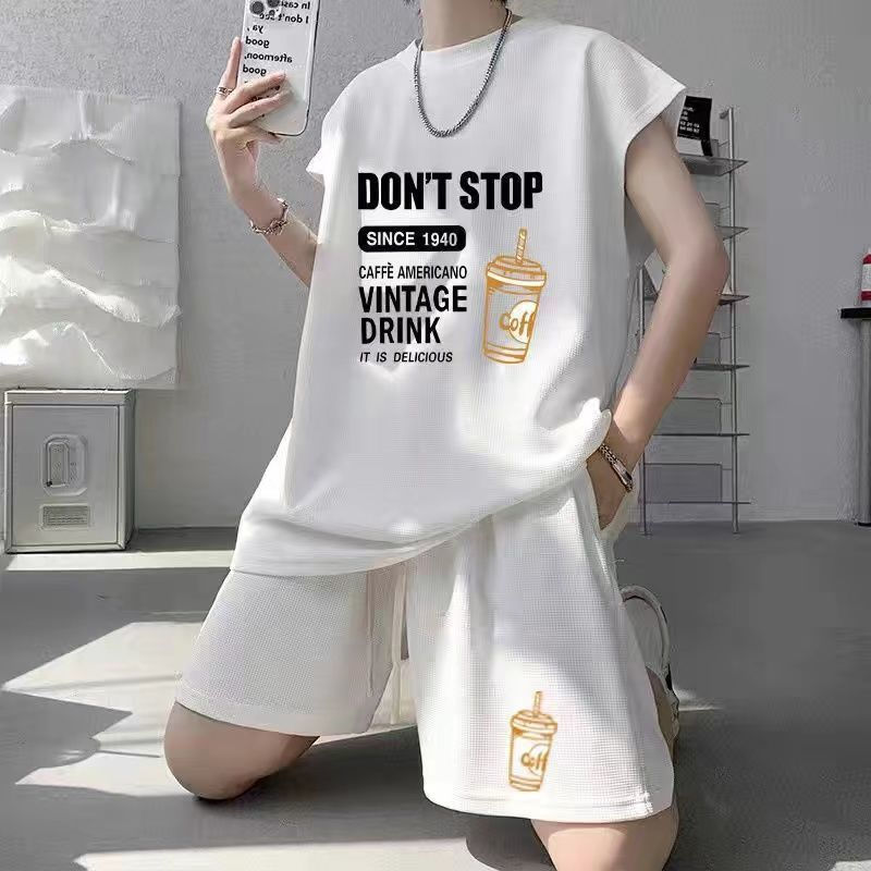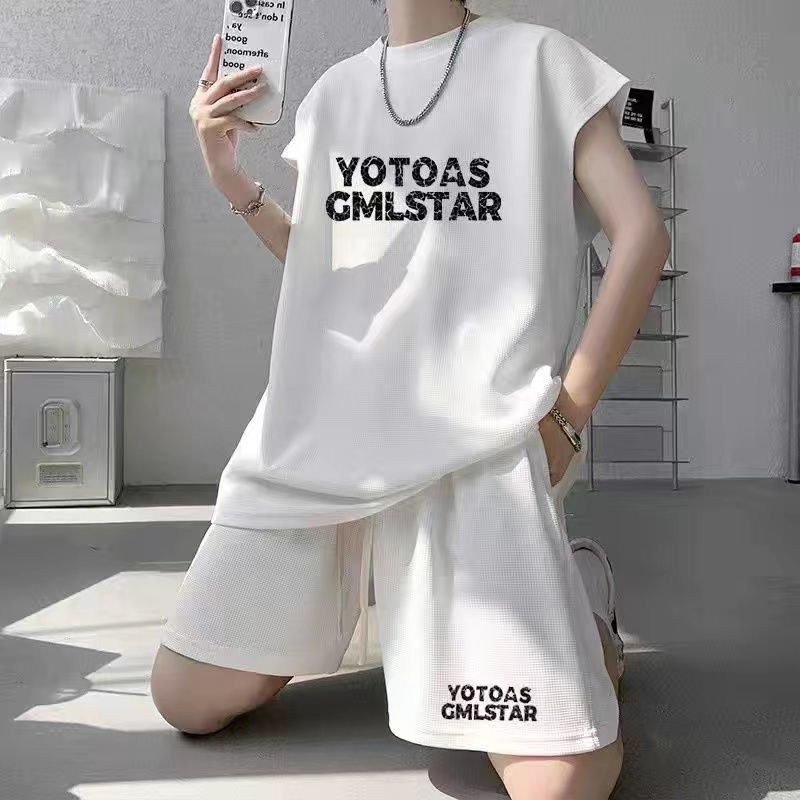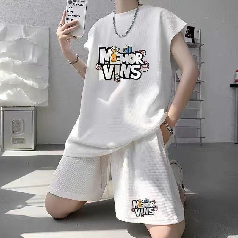 스포츠 세트 남자 여름 캐주얼 트렌디 브랜드 와플 민소매 조끼 반바지 느슨한 대형 10 대 12스토어 가기