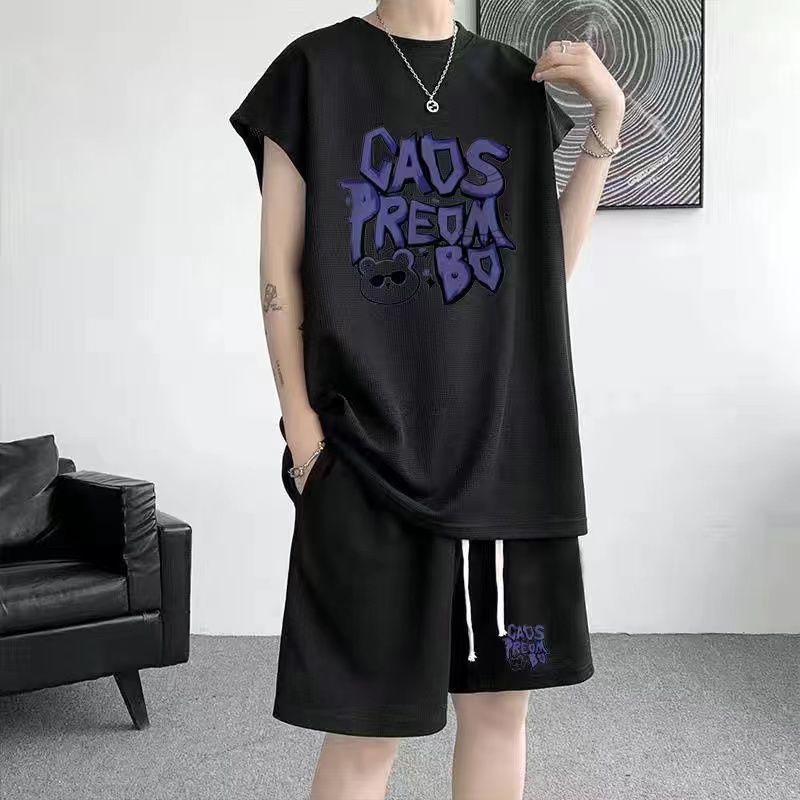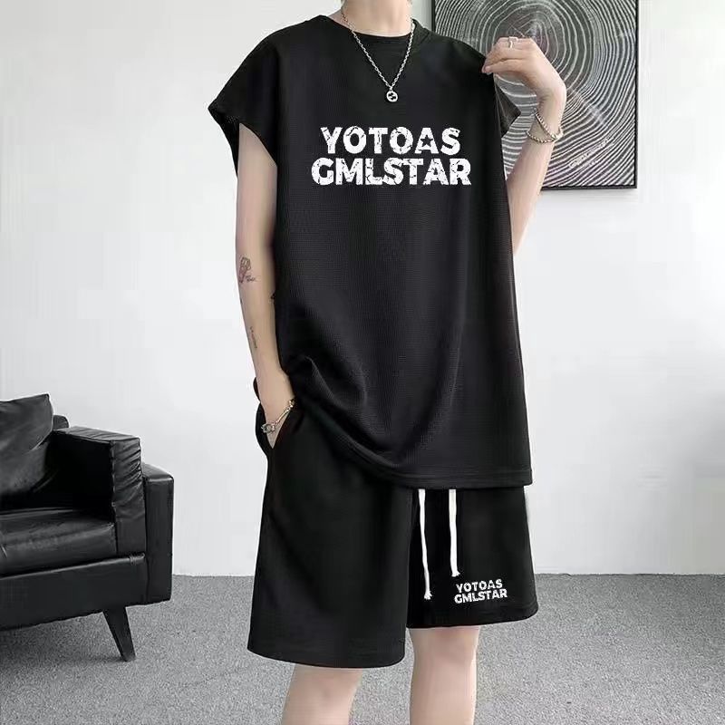 스포츠 세트 남자 여름 캐주얼 트렌디 브랜드 와플 민소매 조끼 반바지 느슨한 대형 10 대 12