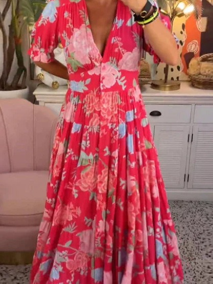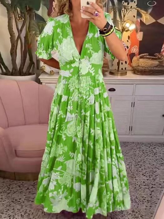 2024 새로운 플러스 사이즈 슈퍼 요정 높은 탄성 v-neck 꽃 원피스 해변 휴가 해변 원피스 느슨한 긴 치마스토어 가기