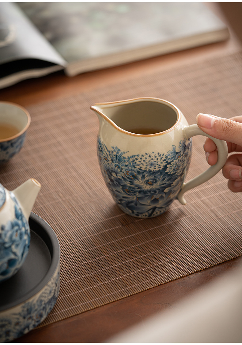 루 가마 파란색과 흰색 용 패턴 페어 컵 베이지 색 루 도자기 차 바다 가정용 쿵푸 차 세트 차 분리기를 올릴 수 있습니다.