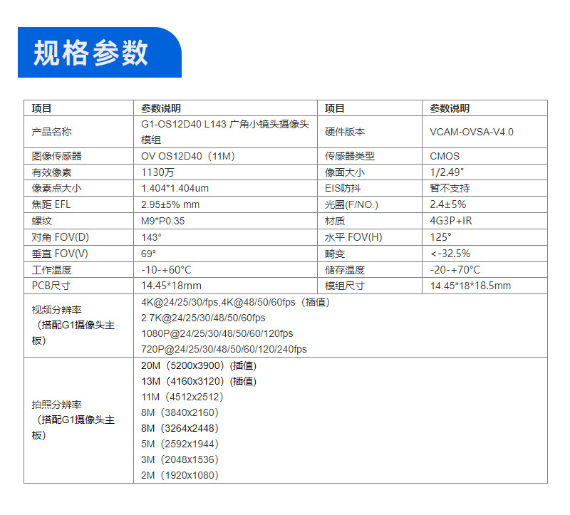 G1-OS12D40 작은 렌즈 카메라 모듈 1,100 만 픽셀 작은 광각 렌즈 4K 해상도스토어 가기