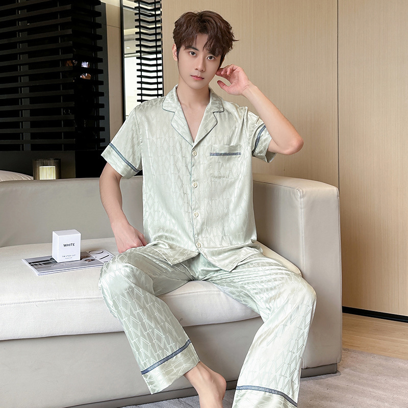 2024 봄 커플 아이스 실크 파자마 남녀 반팔 바지 자카드 얇은 홈웨어 투피스 세트 배달