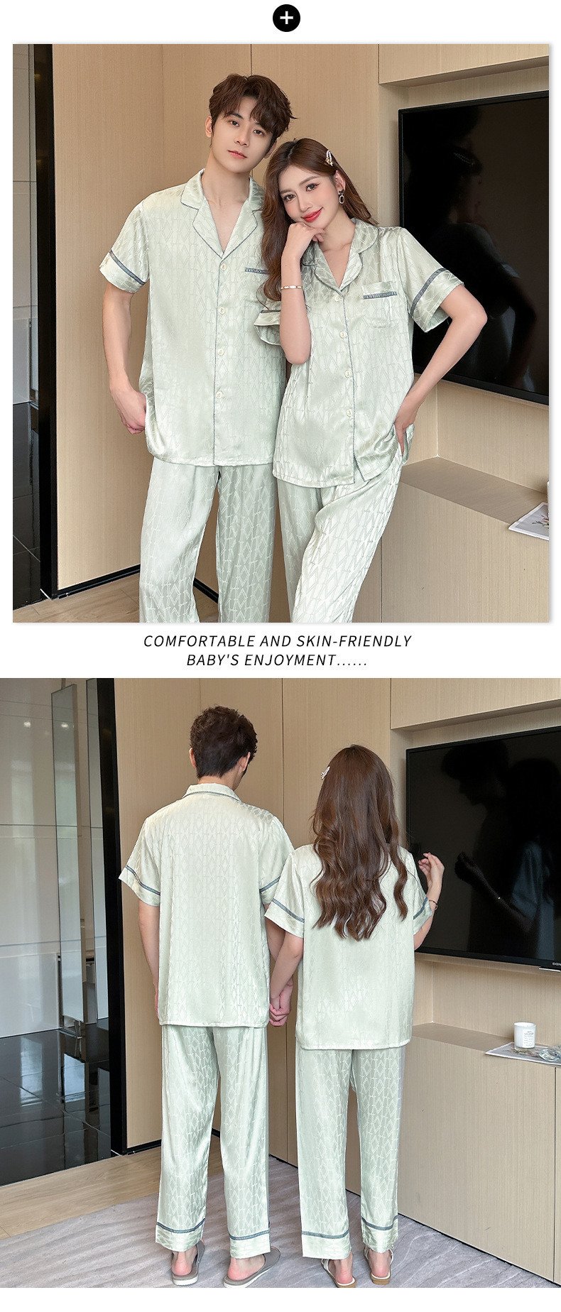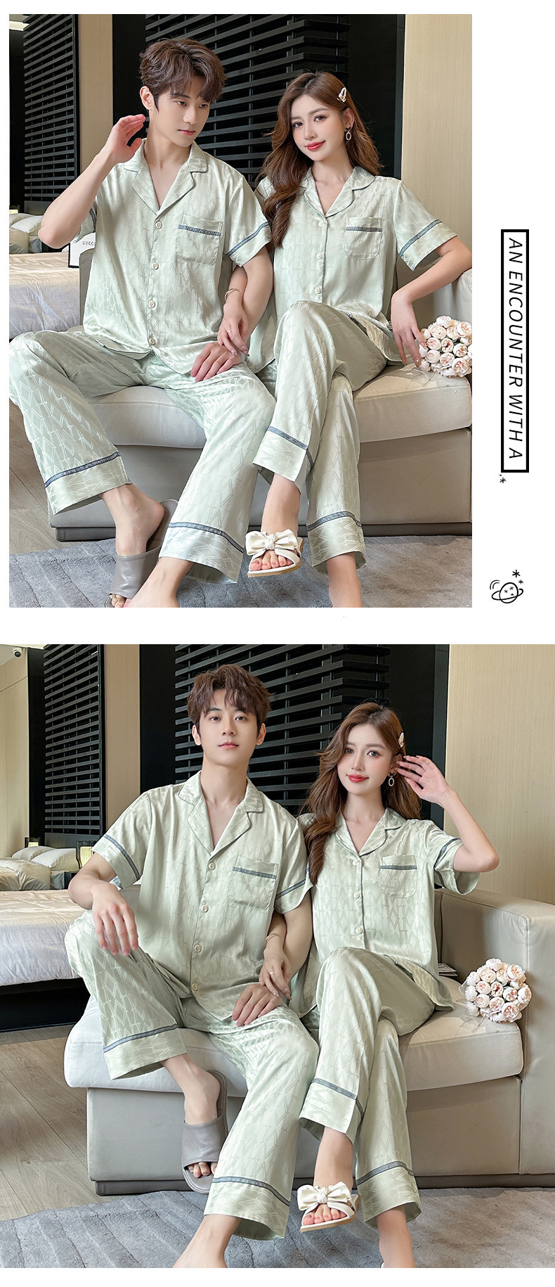 2024 봄 커플 아이스 실크 파자마 남녀 반팔 바지 자카드 얇은 홈웨어 투피스 세트 배달스토어 가기