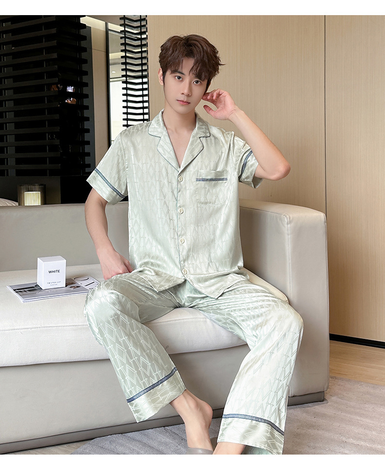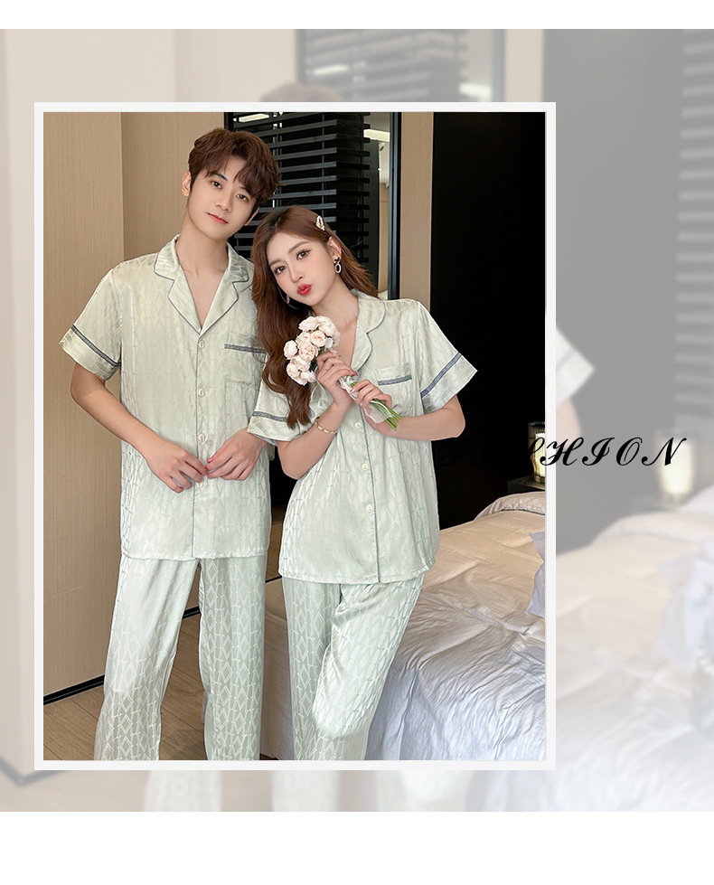 2024春季情侣款冰丝睡衣男女士短袖长裤提花薄款家居服两件套代发