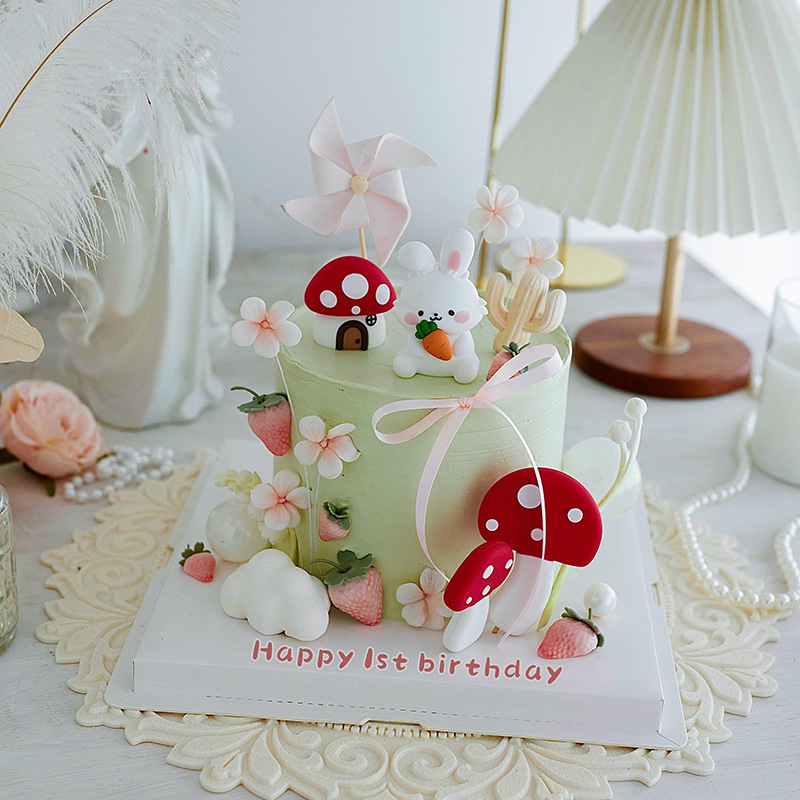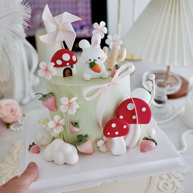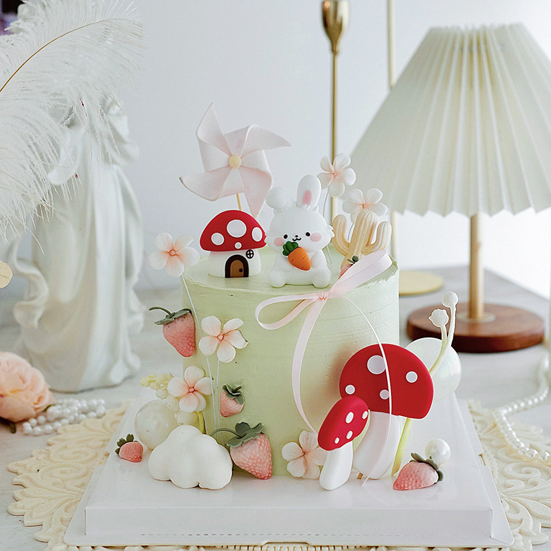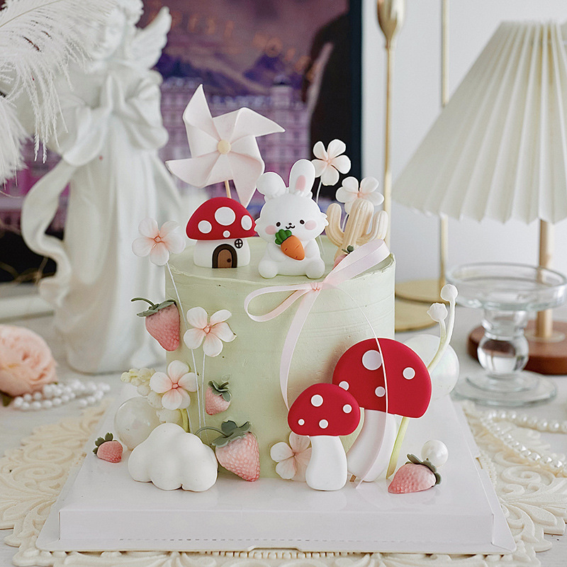 저작권 목가적 인 스타일 케이크 장식 귀여운 토끼 아기 년 장식 모리 버섯 생일 케이크 플러그인스토어 가기