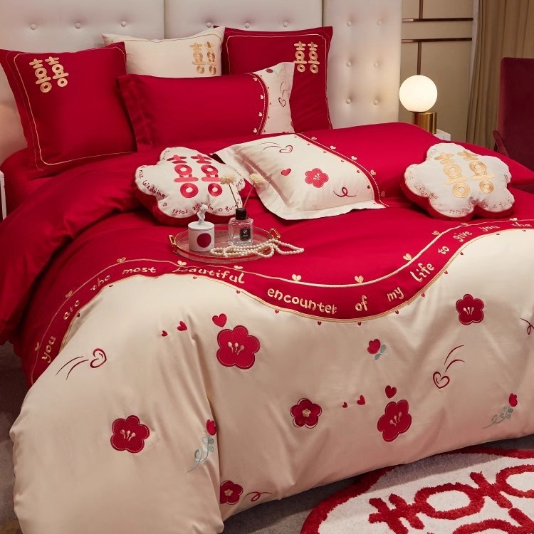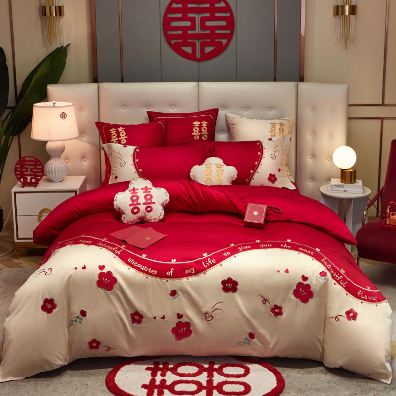 레드 웨딩 60 긴 스테이플 코튼 4 피스 세트 로맨틱 플라워 자수 코튼 퀼트 커버 순수한면 웨딩 침구스토어 가기