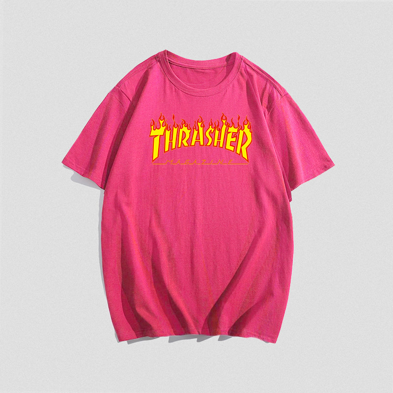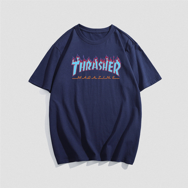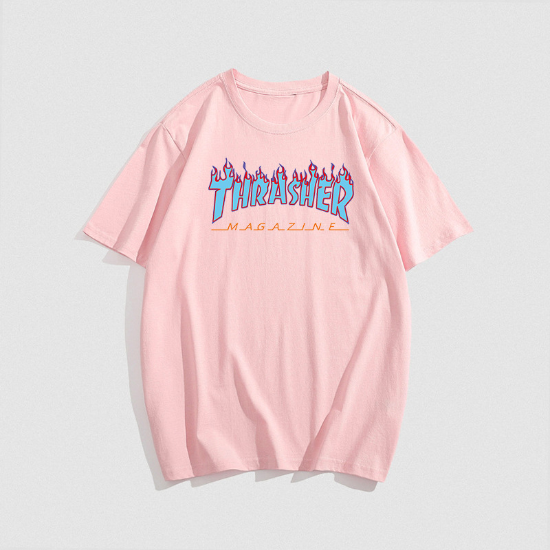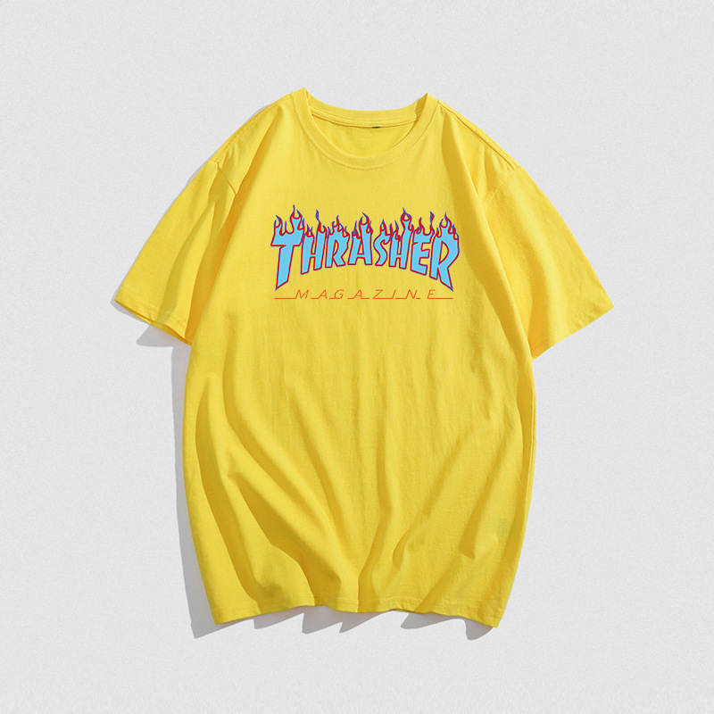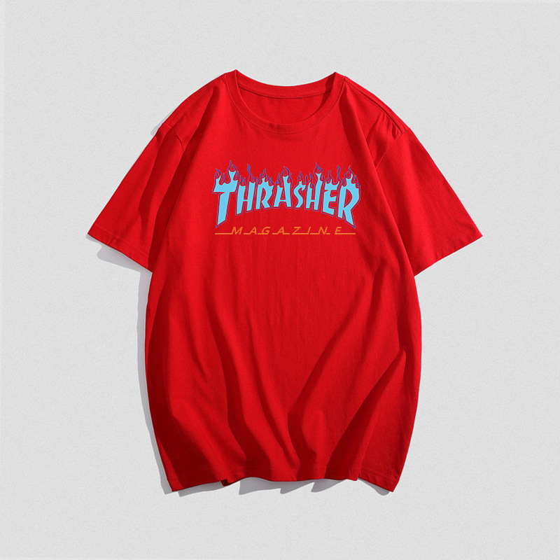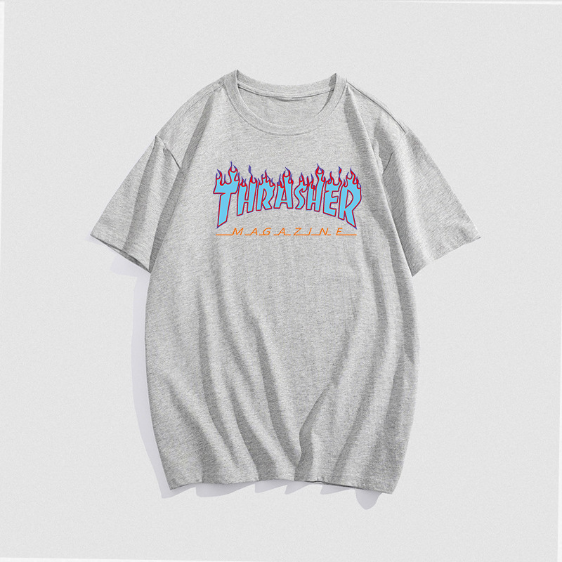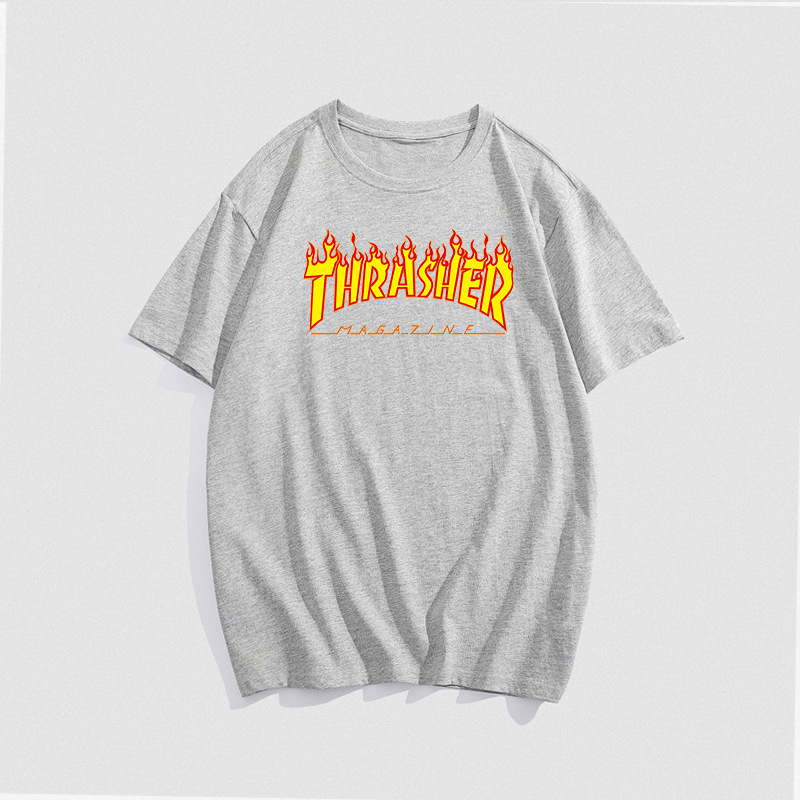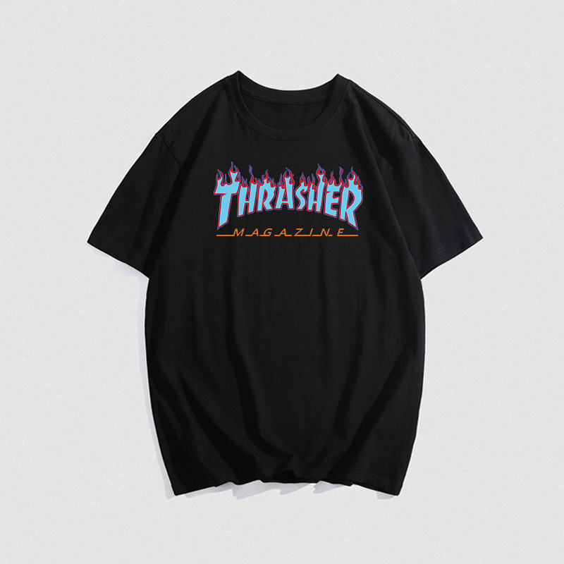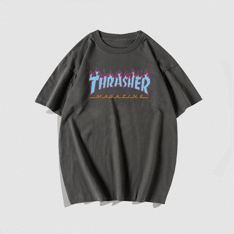 여름 새로운 남성 티셔츠 THRASHER 불꽃 대외 무역 레저 스포츠 순수한면 티셔츠 제조업체 재고