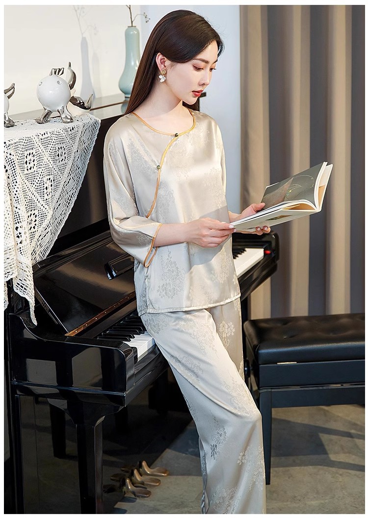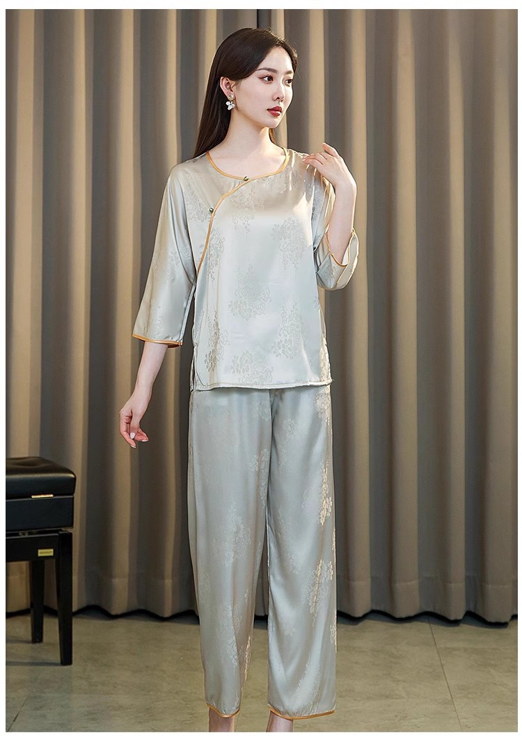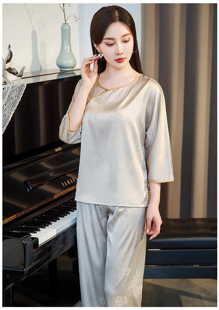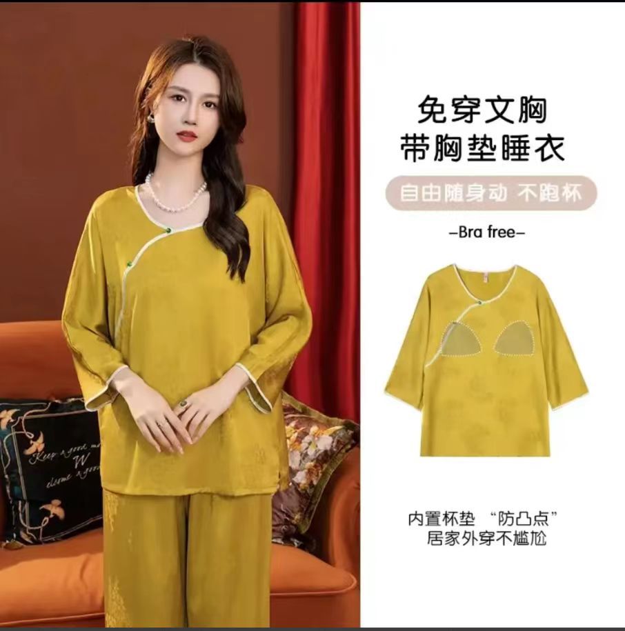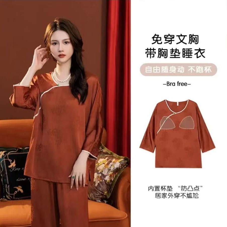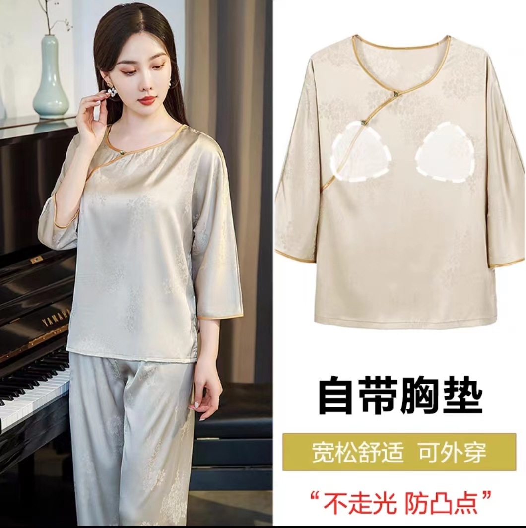 상하이 스토리 새로운 중국 스타일 잠옷 아이스 실크 여성용 빈티지 홈 의류 가슴 패드 실크 풀오버 실크 얇은 실크