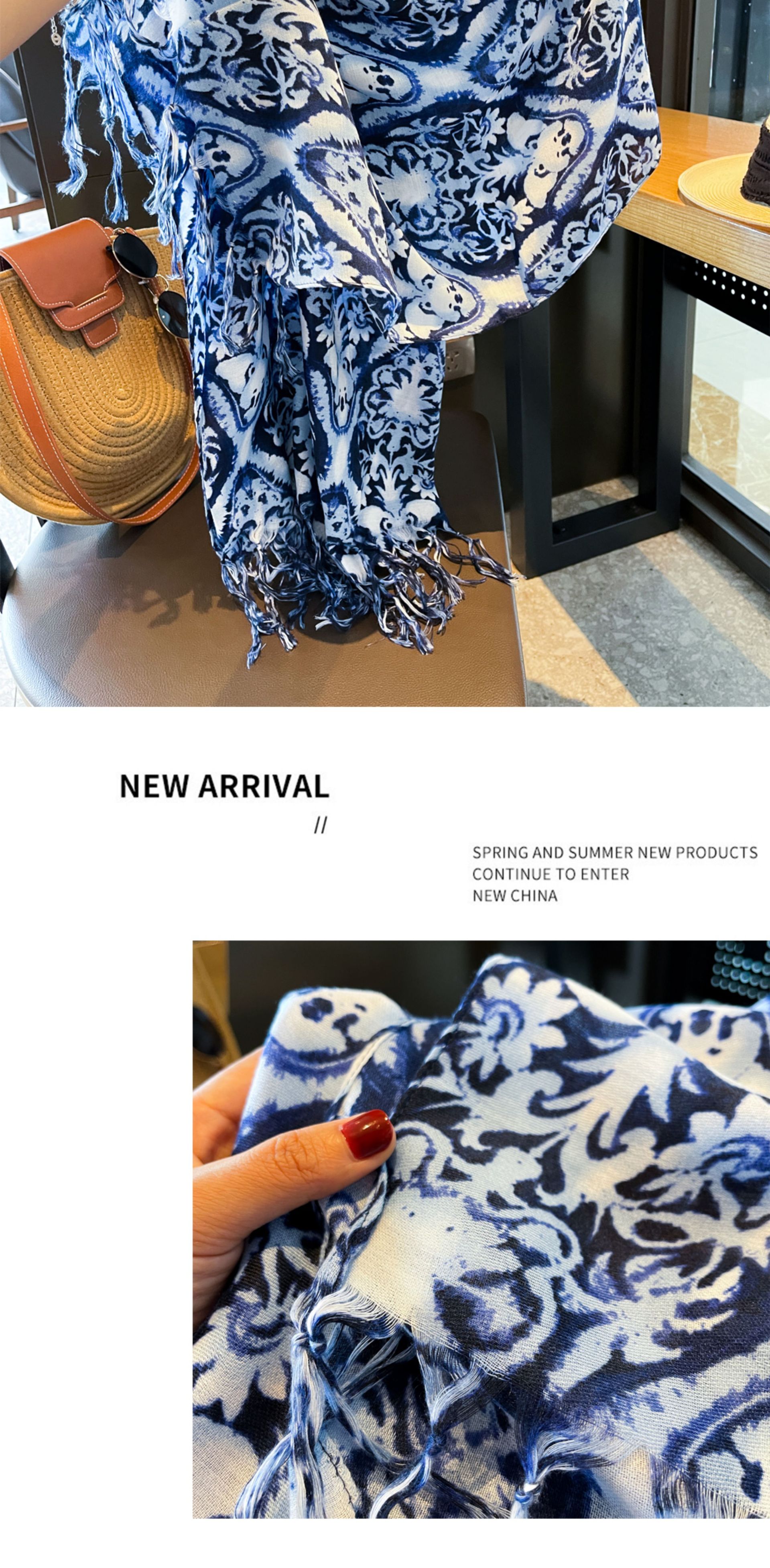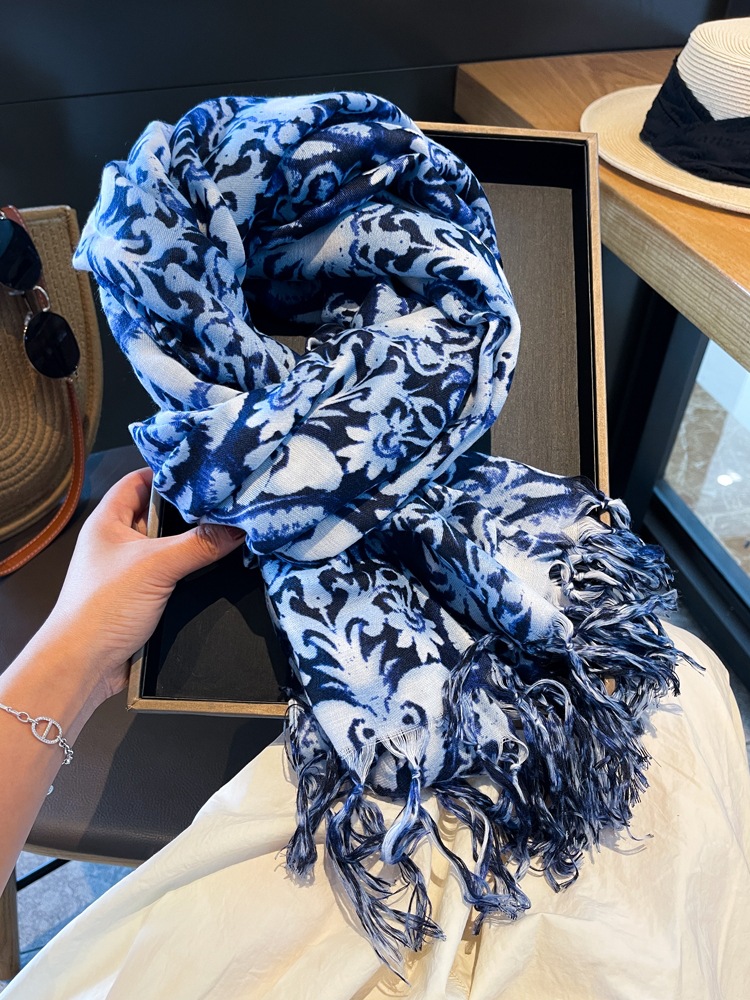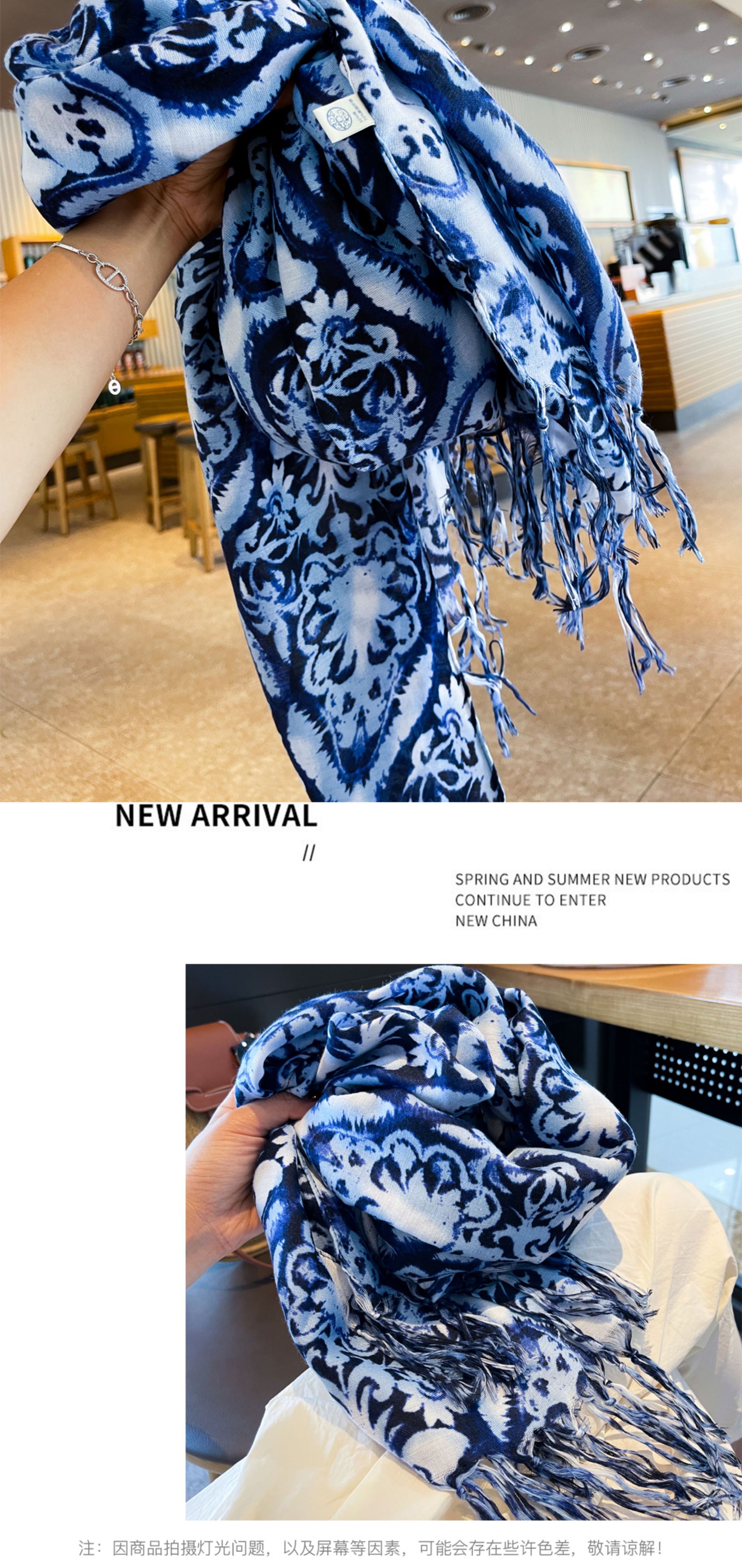 Ethnic Fengyun South Ancient Town 넥타이 염색 파란색과 흰색 도자면과 린넨 스카프 여성의 봄과 가을 특대 겨울 긴 목도리 예술적 스카프스토어 가기