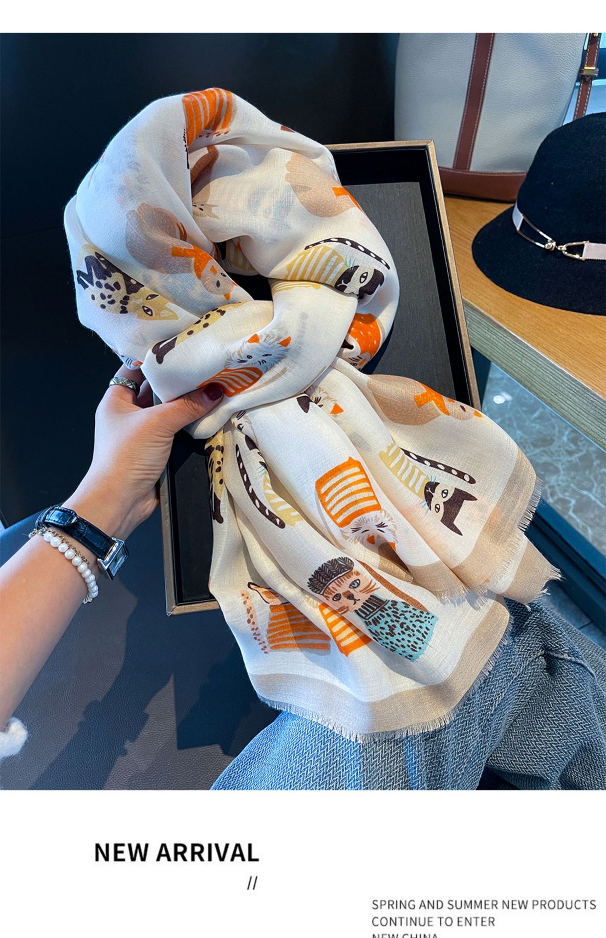 실크 스카프 여름 한국 스타일의 다재다능한 얇은 스카프 태양 방지면 및 린넨 스카프 여성 만화 고양이 해변 수건 태양 방지 긴 목도리