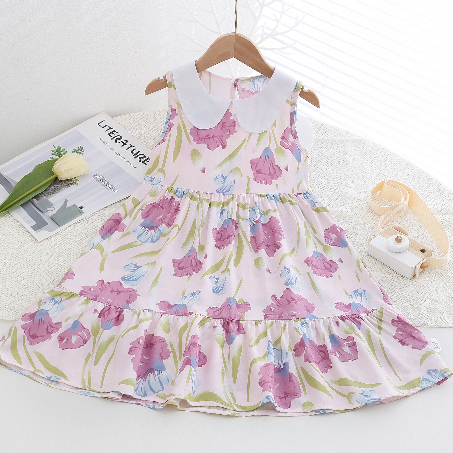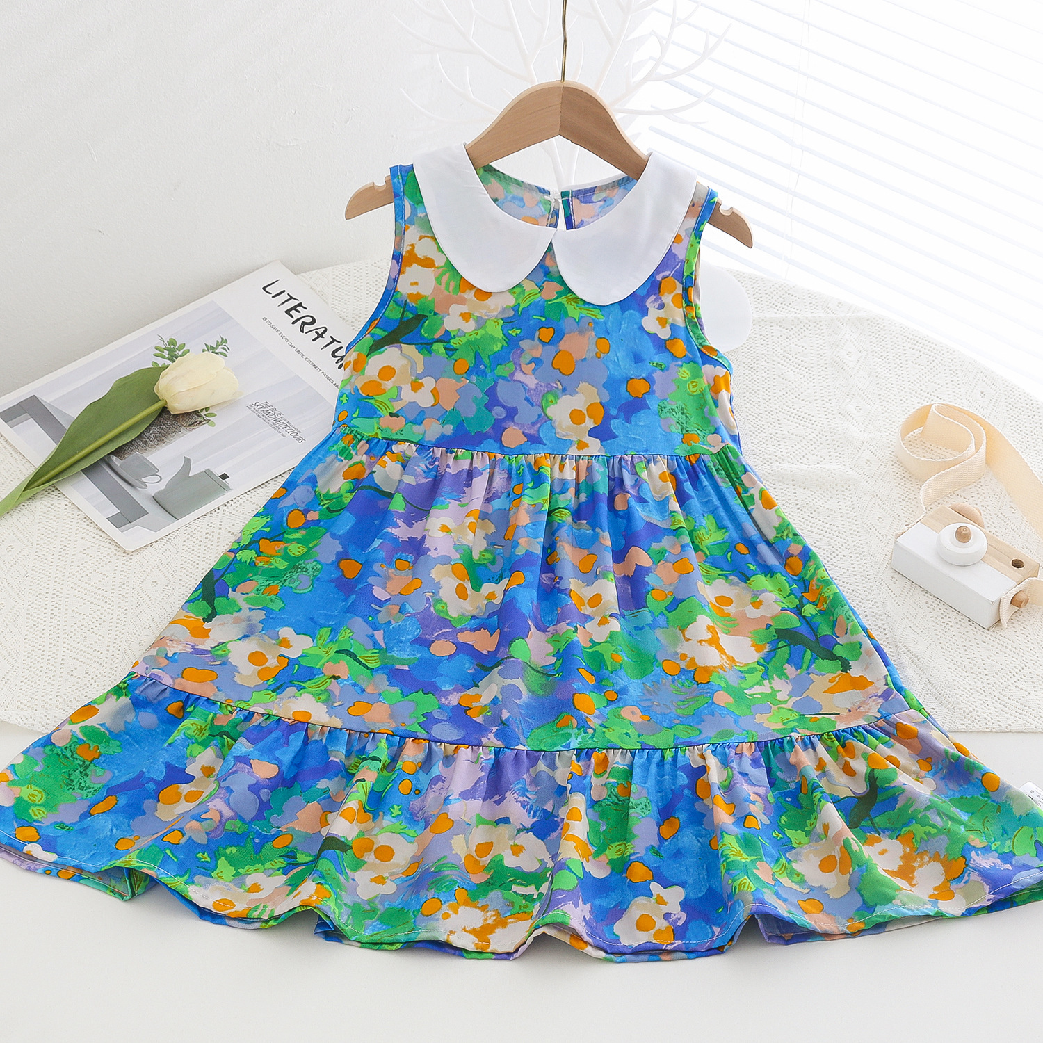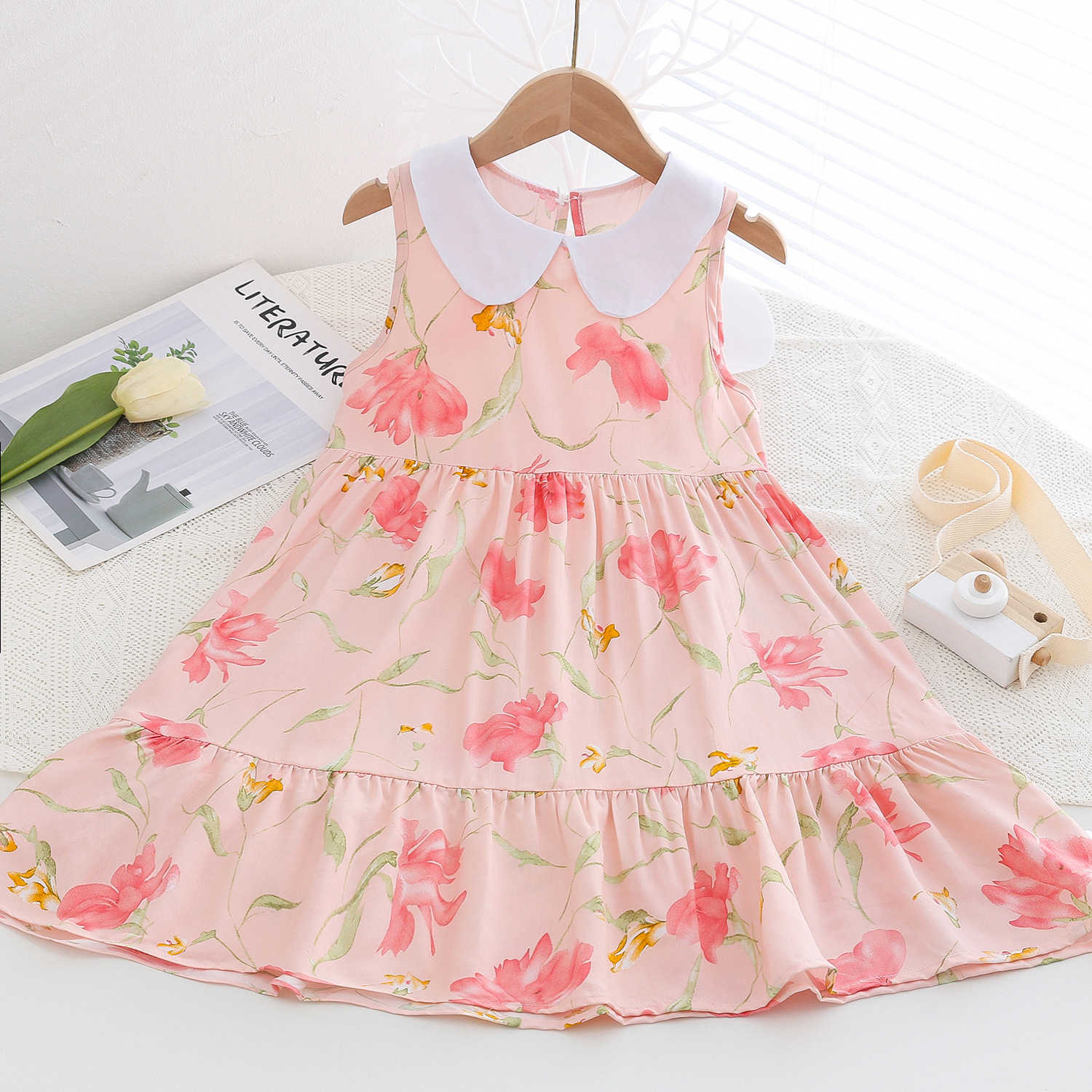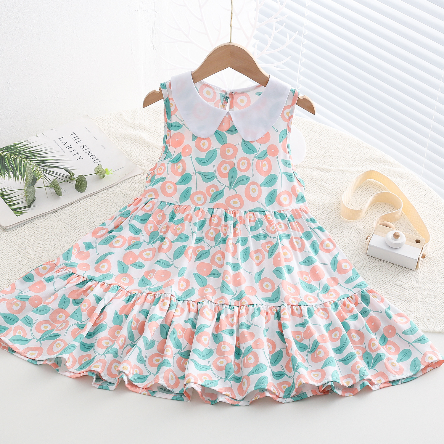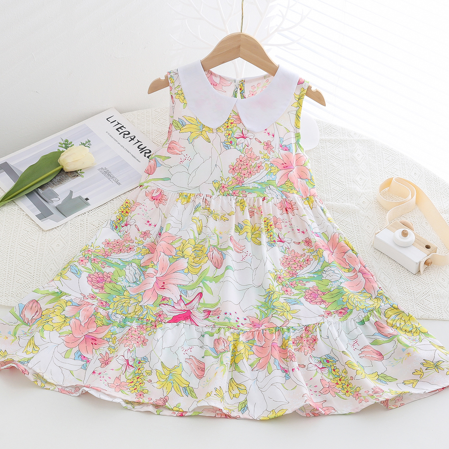상쾌한 부드러운 찹스러운 소녀 옷깃면 실크 원피스 여름 얇은 미디어와 큰 어린이 꽃 무늬 큰 치마 인공 면화 비치 스커트