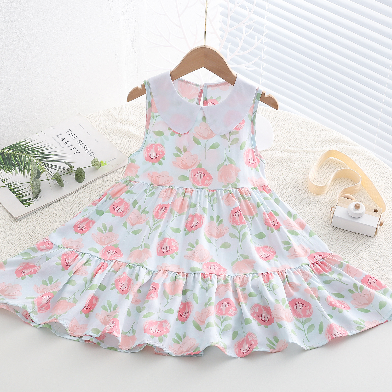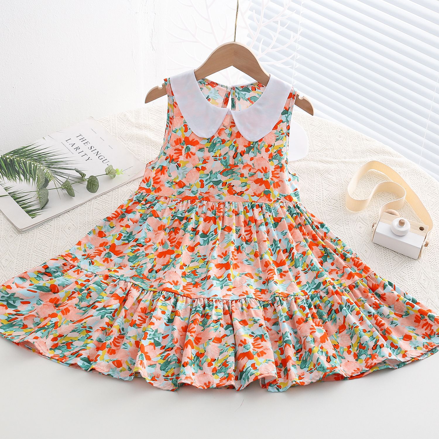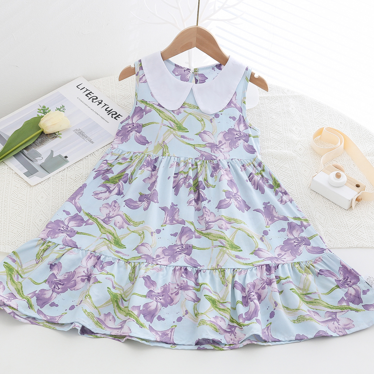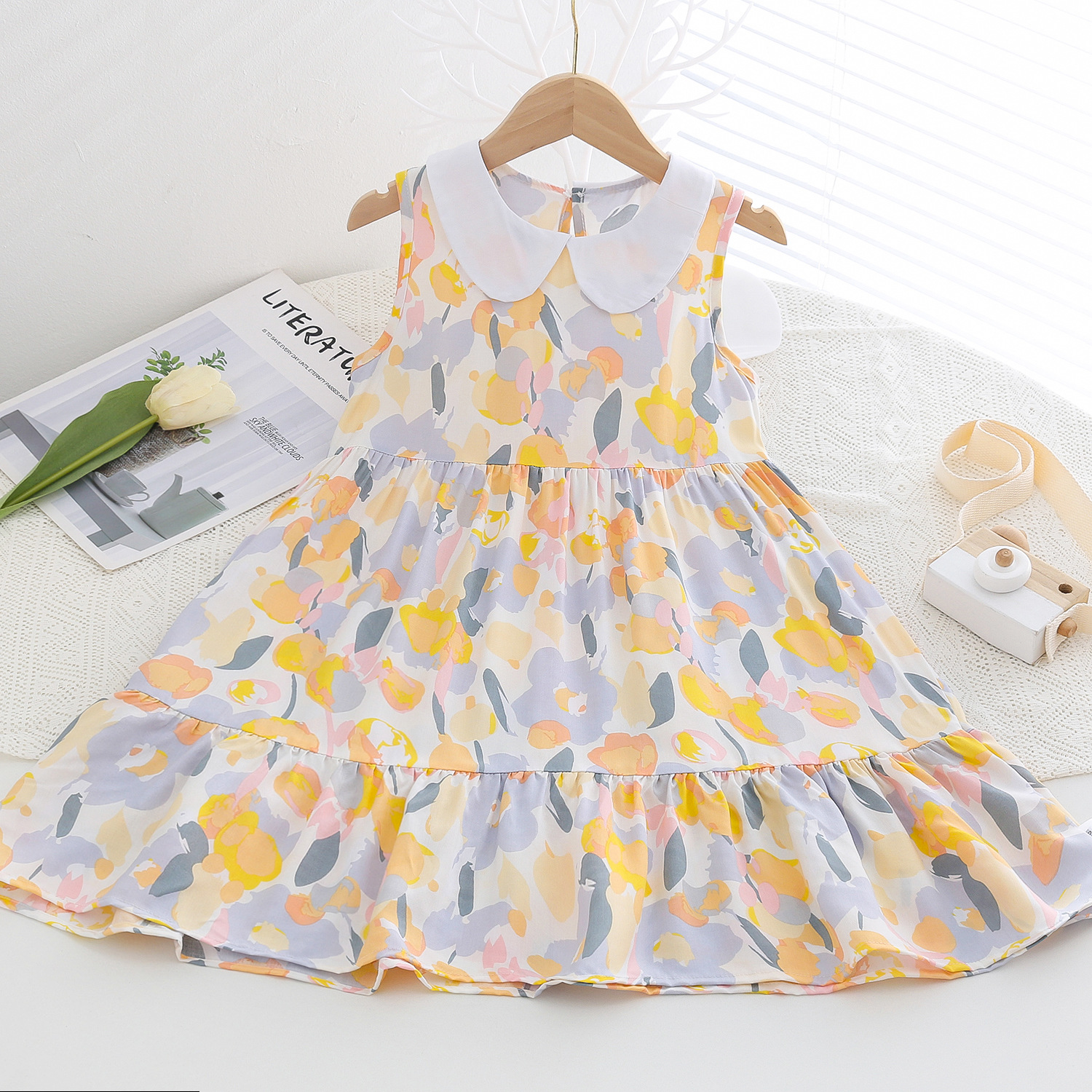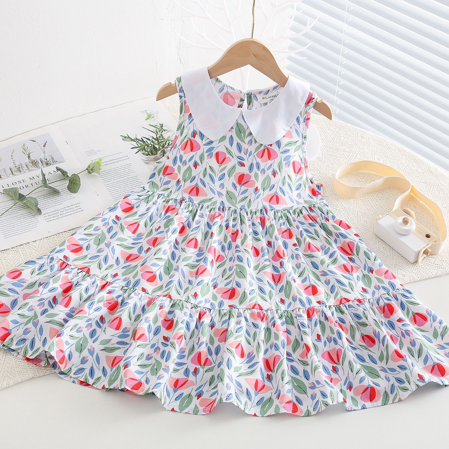 상쾌한 부드러운 찹스러운 소녀 옷깃면 실크 원피스 여름 얇은 미디어와 큰 어린이 꽃 무늬 큰 치마 인공 면화 비치 스커트