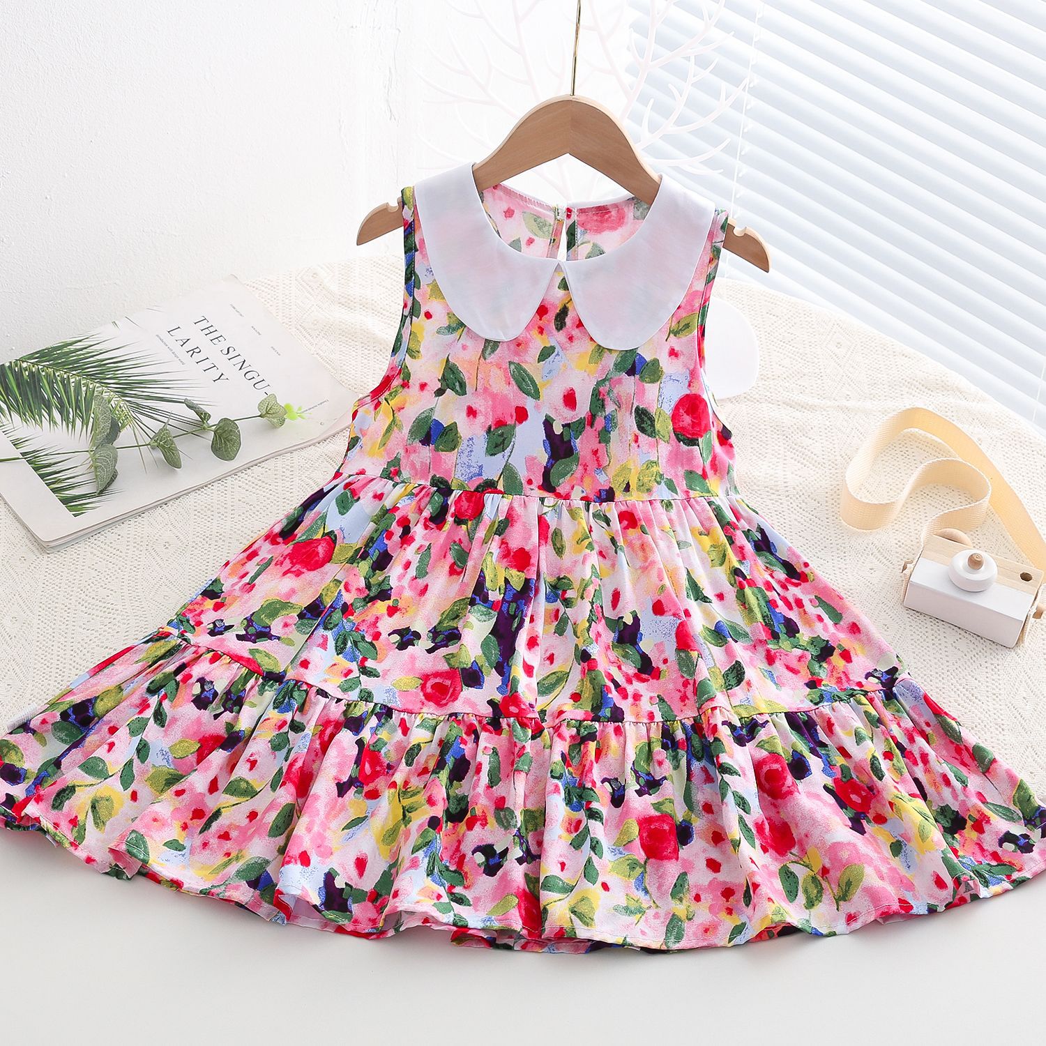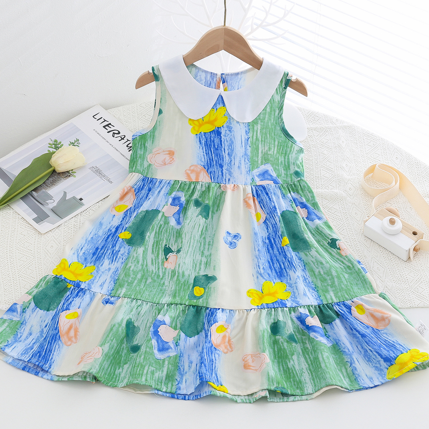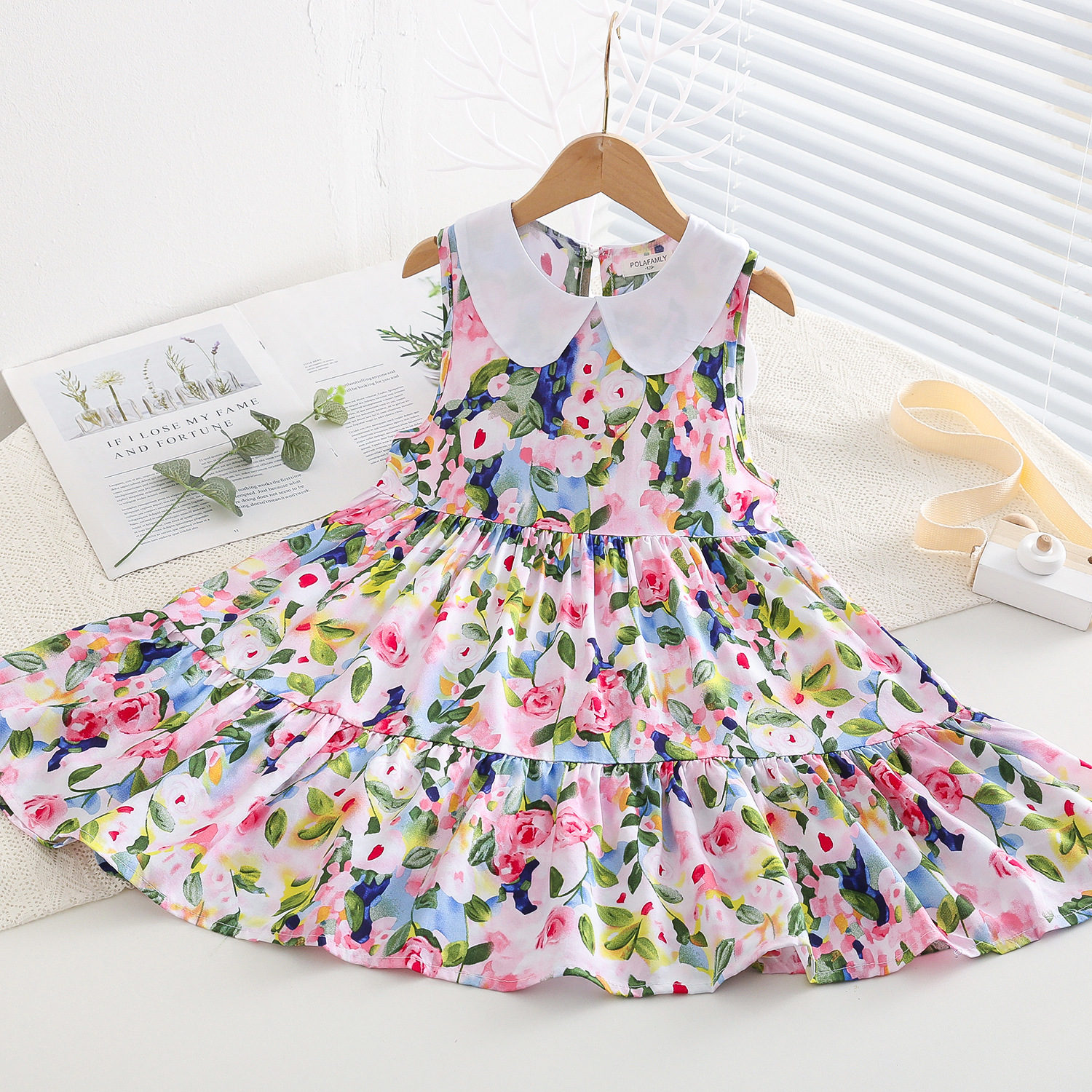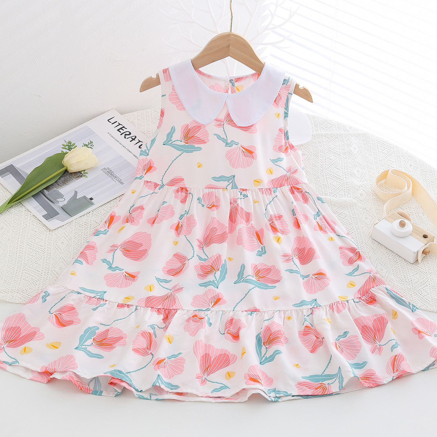 상쾌한 부드러운 찹스러운 소녀 옷깃면 실크 원피스 여름 얇은 미디어와 큰 어린이 꽃 무늬 큰 치마 인공 면화 비치 스커트