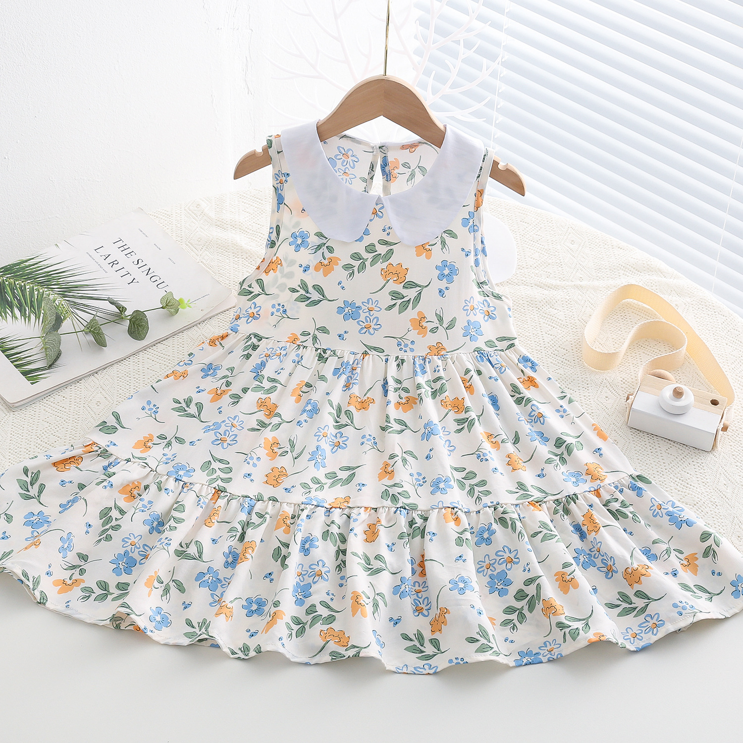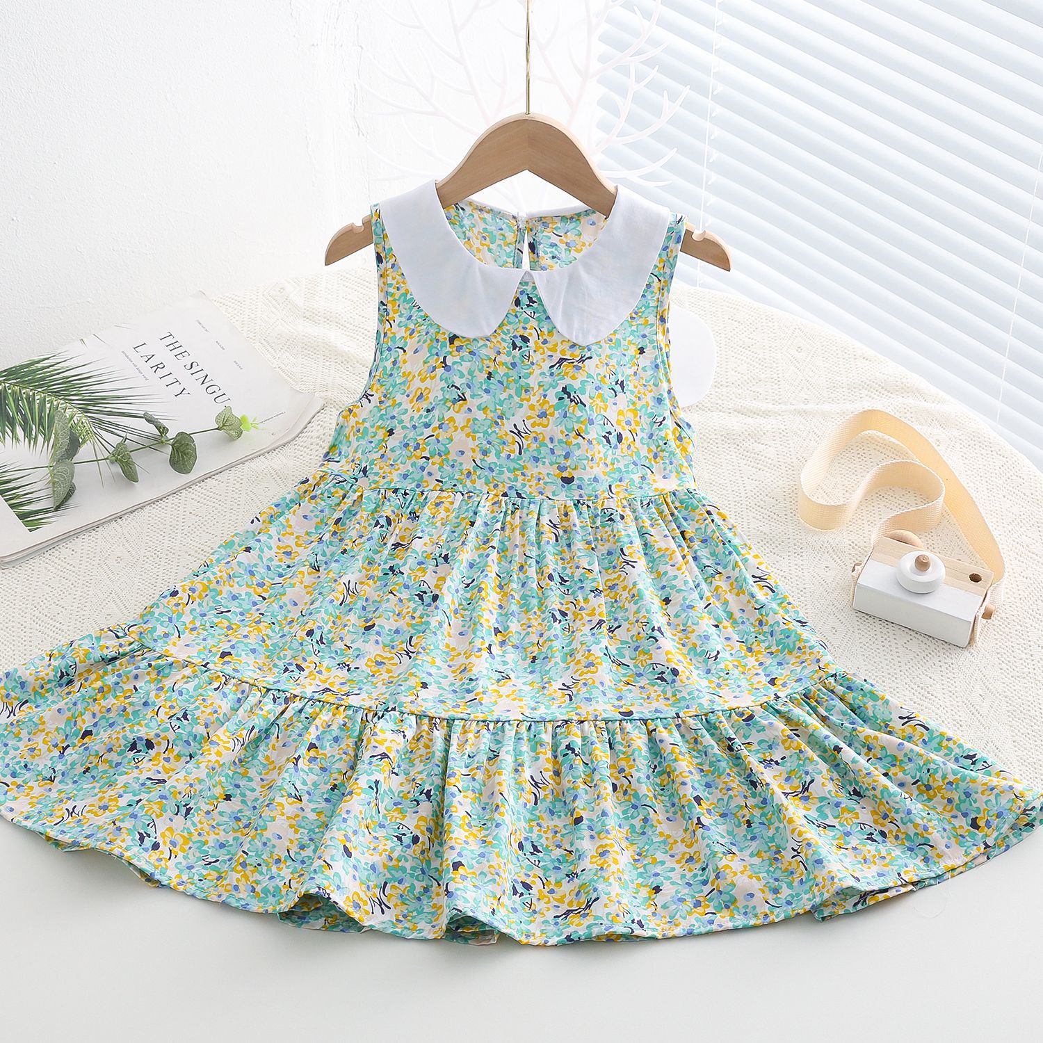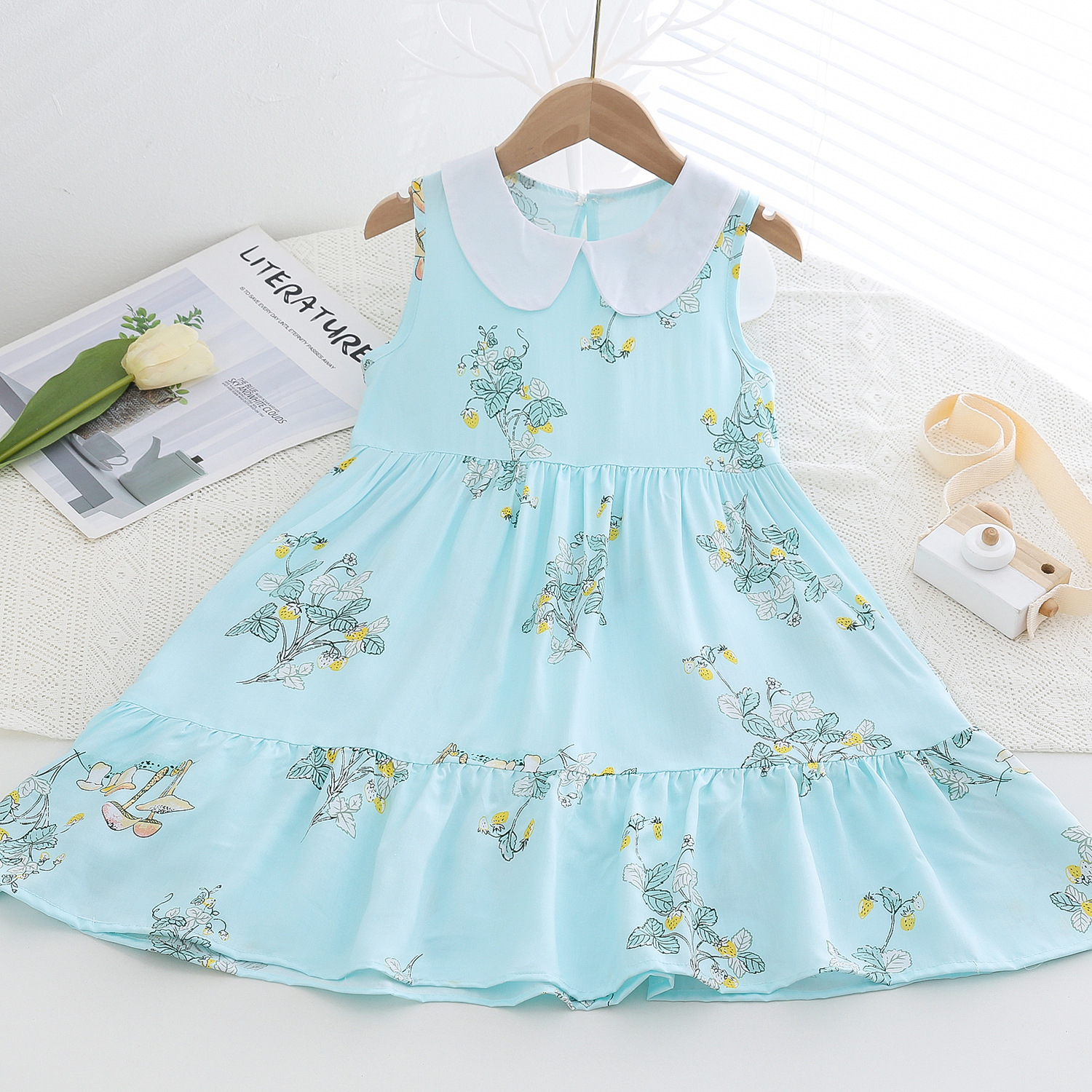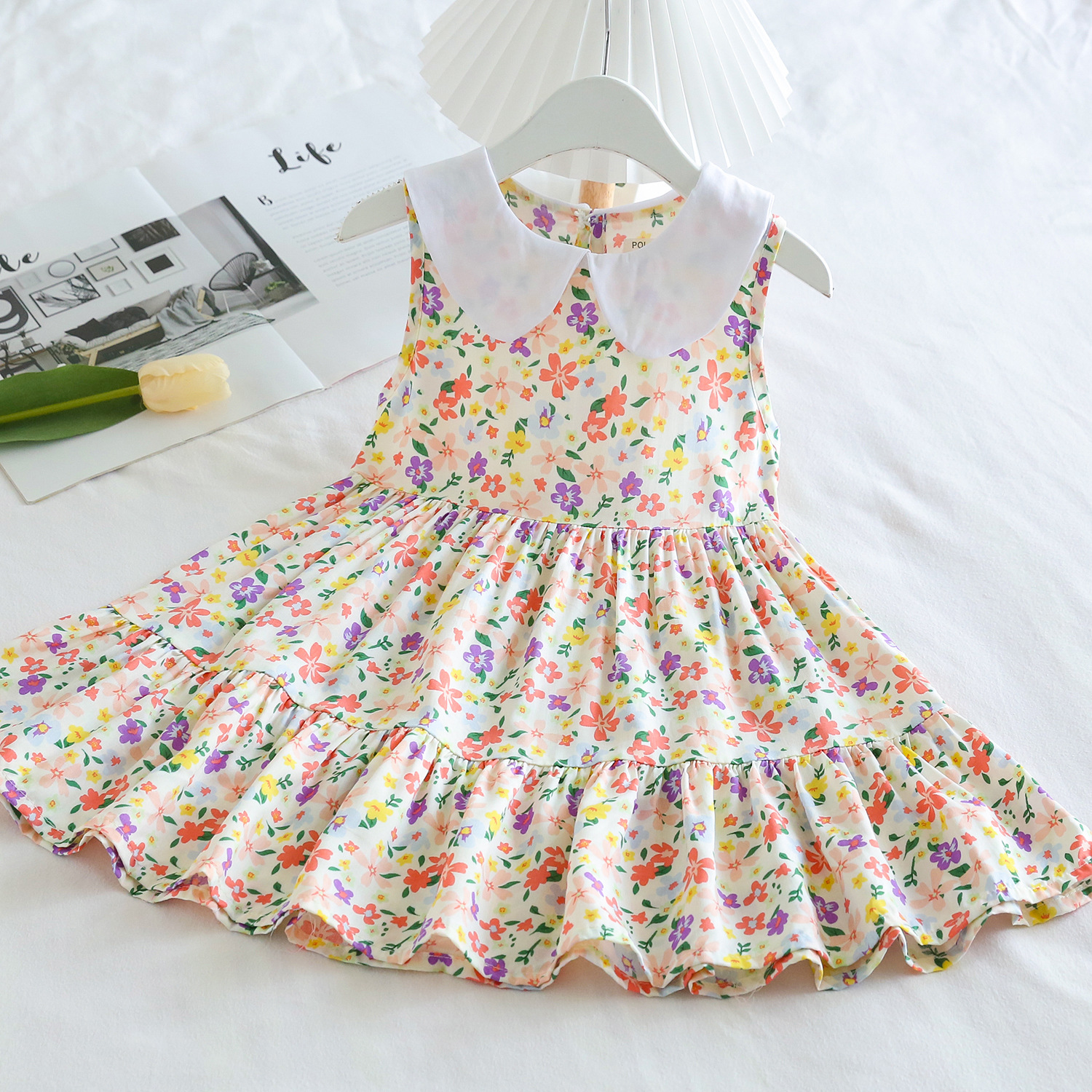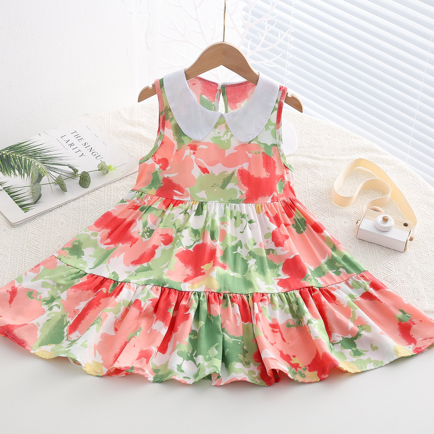 상쾌한 부드러운 찹스러운 소녀 옷깃면 실크 원피스 여름 얇은 미디어와 큰 어린이 꽃 무늬 큰 치마 인공 면화 비치 스커트