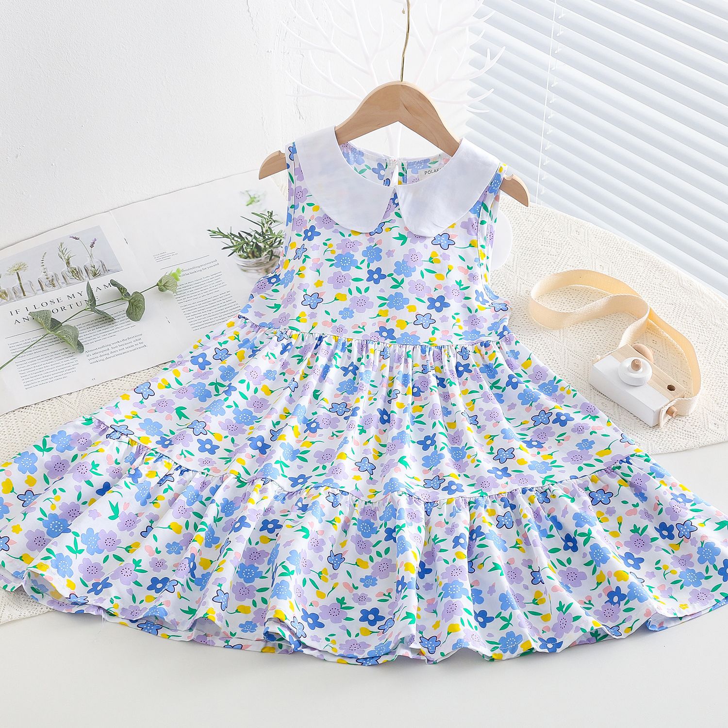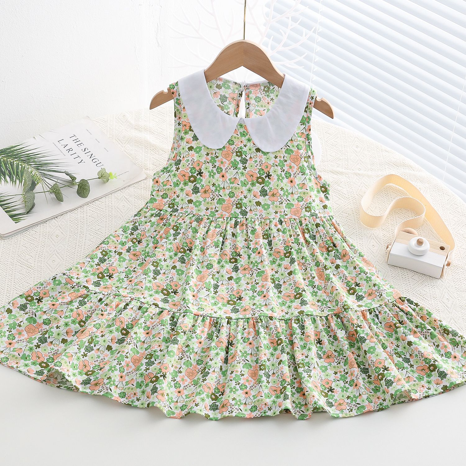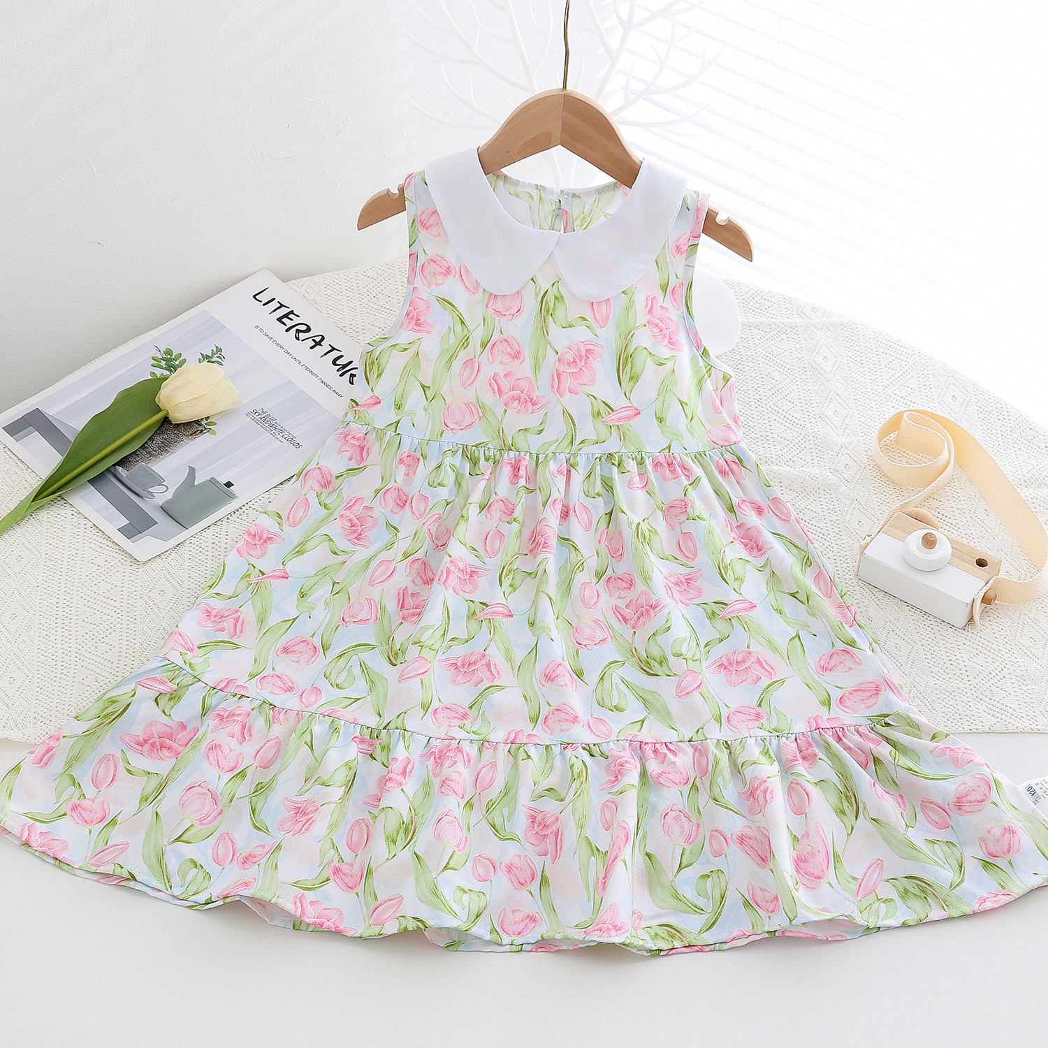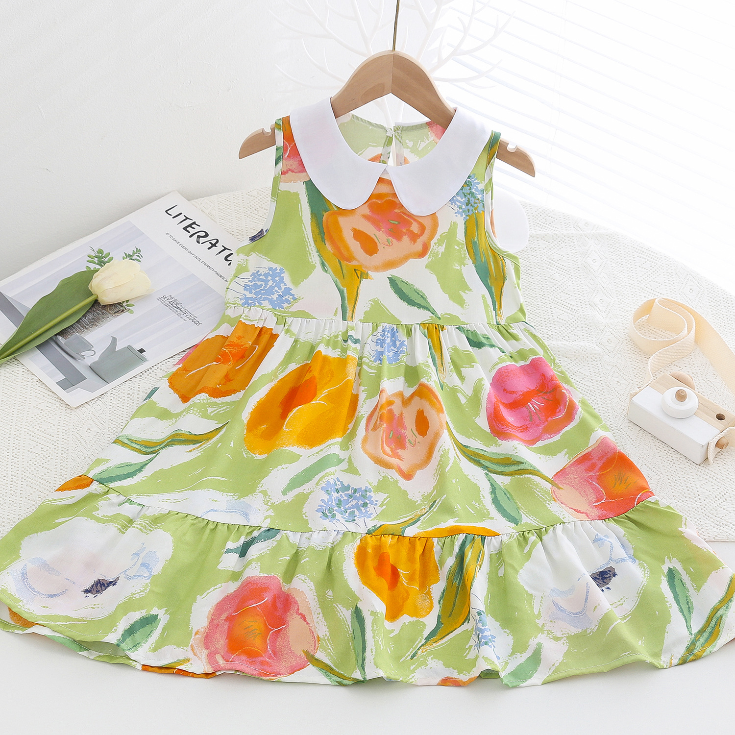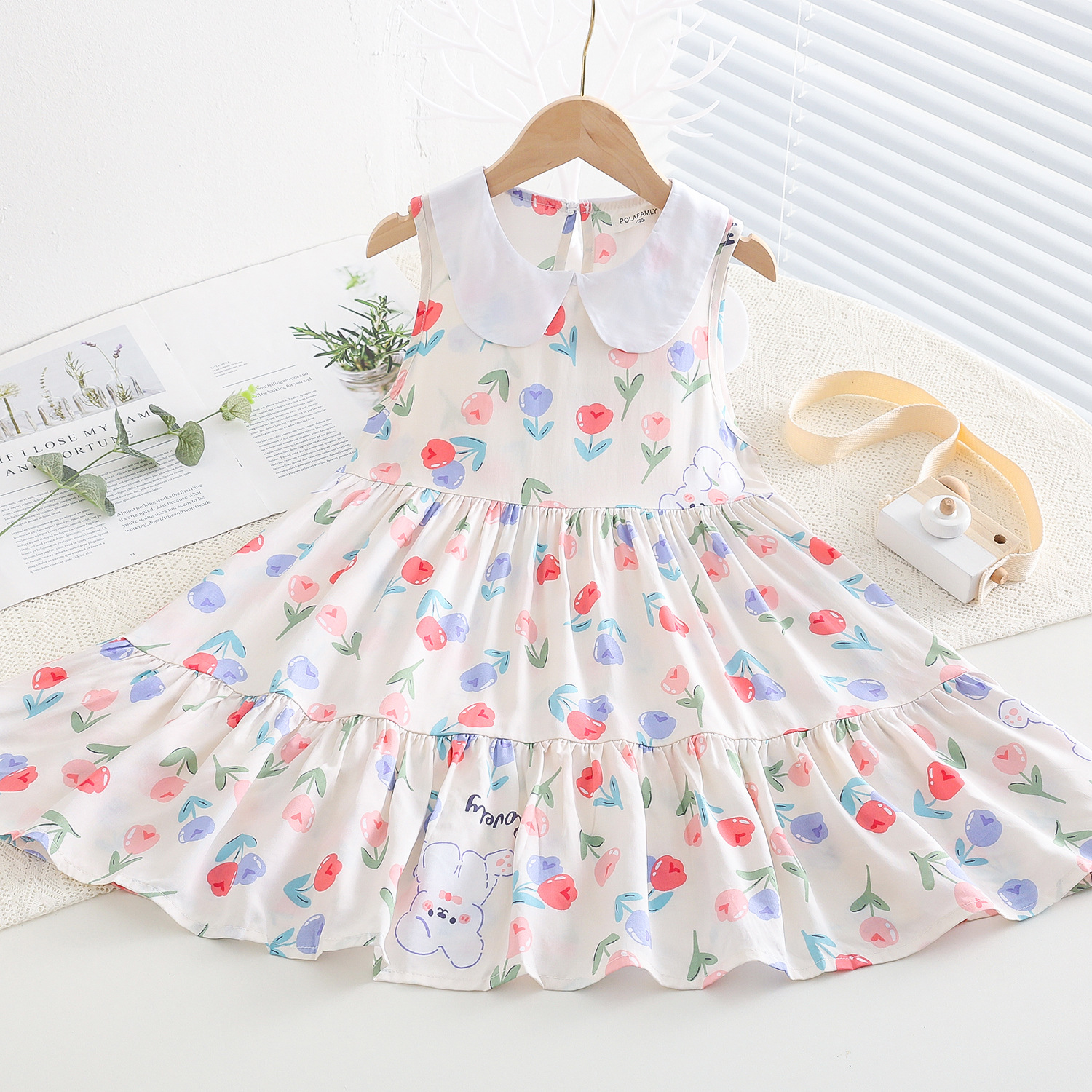 상쾌한 부드러운 찹스러운 소녀 옷깃면 실크 원피스 여름 얇은 미디어와 큰 어린이 꽃 무늬 큰 치마 인공 면화 비치 스커트
