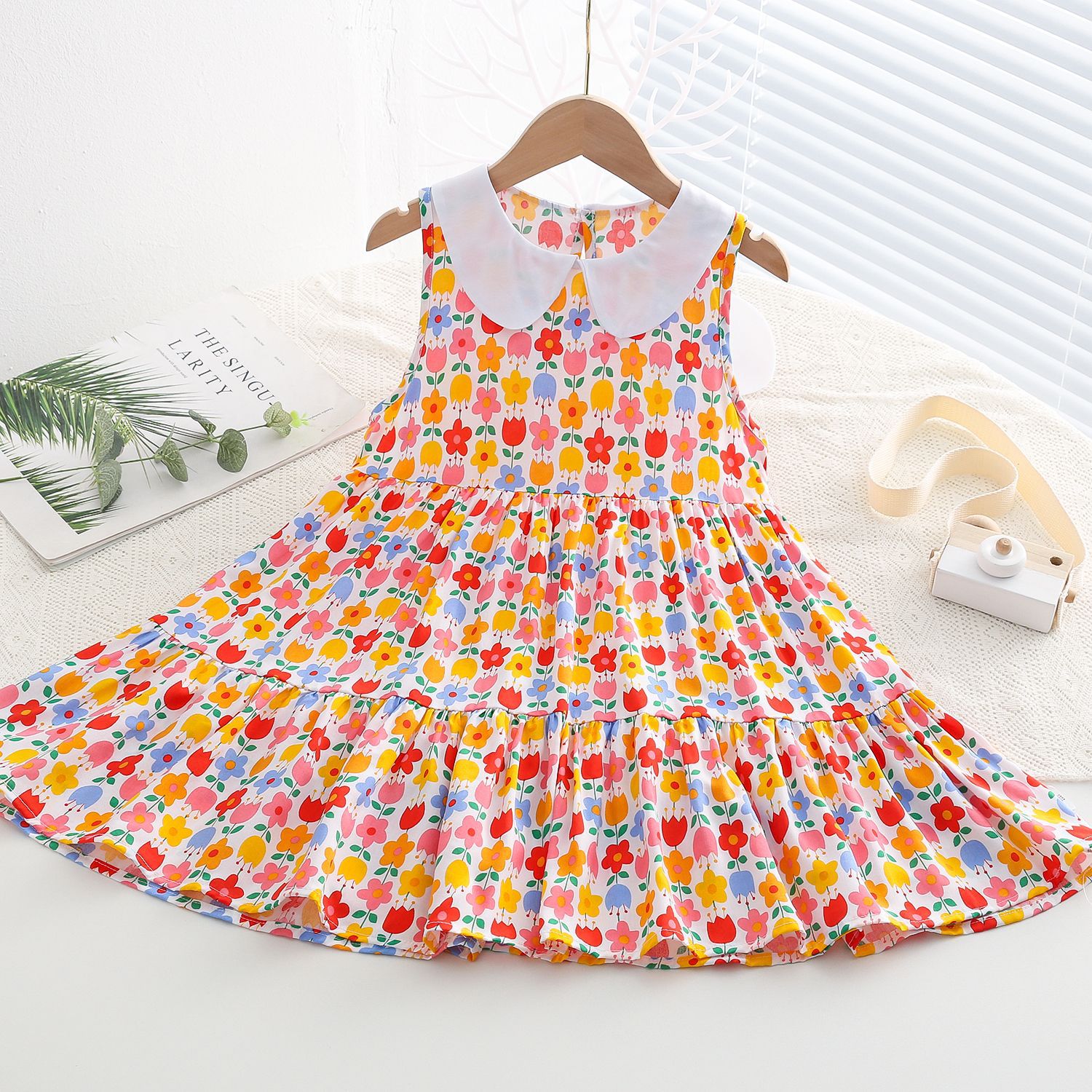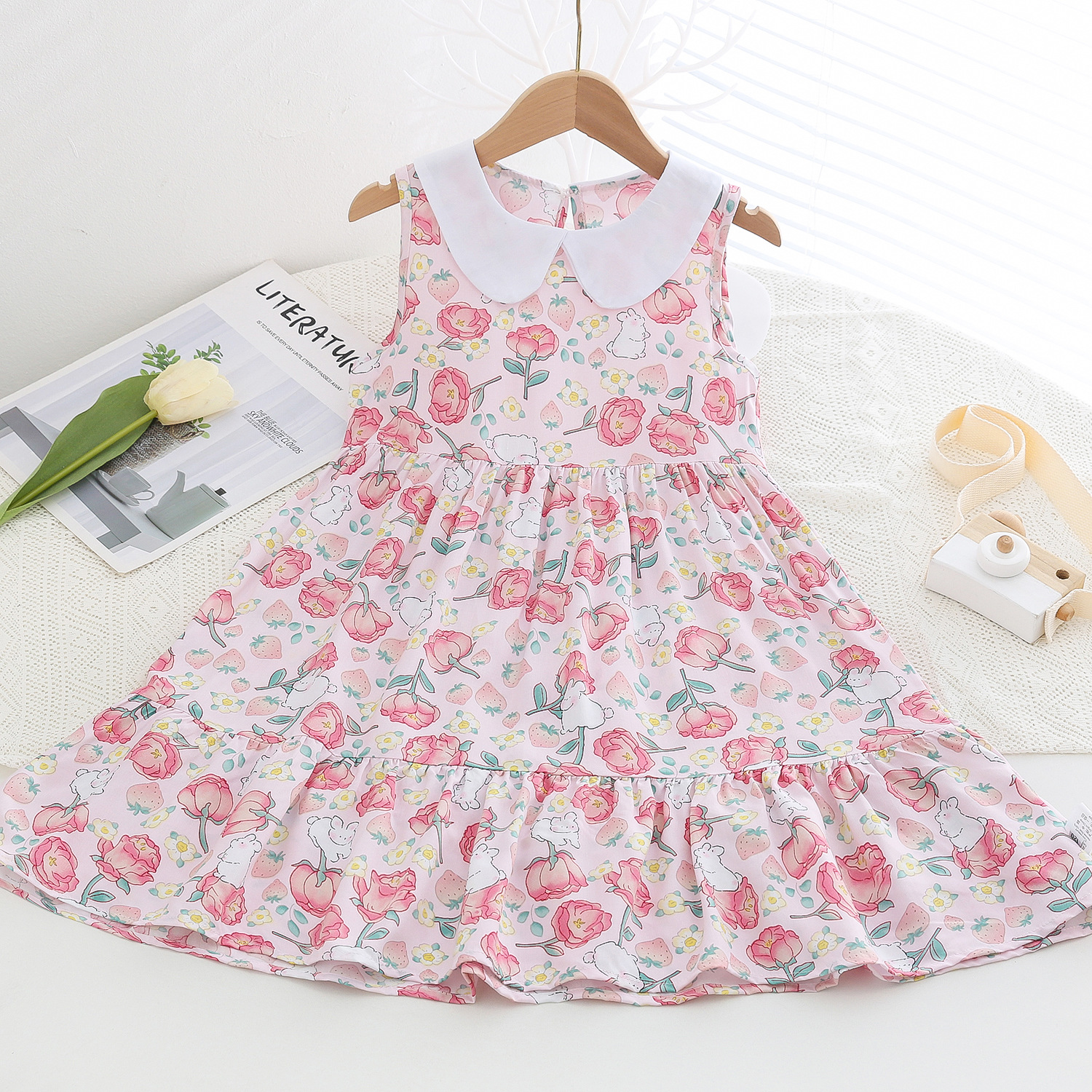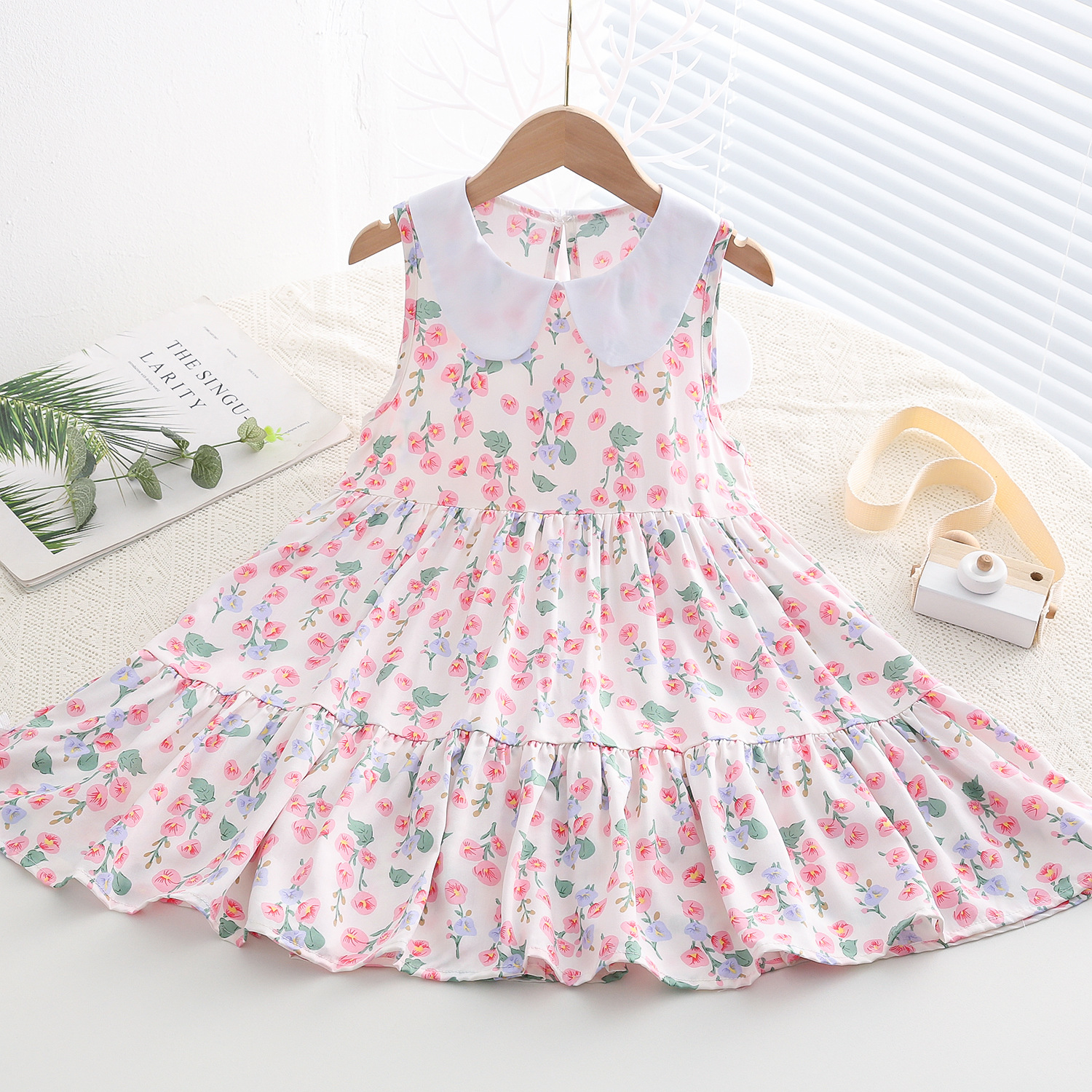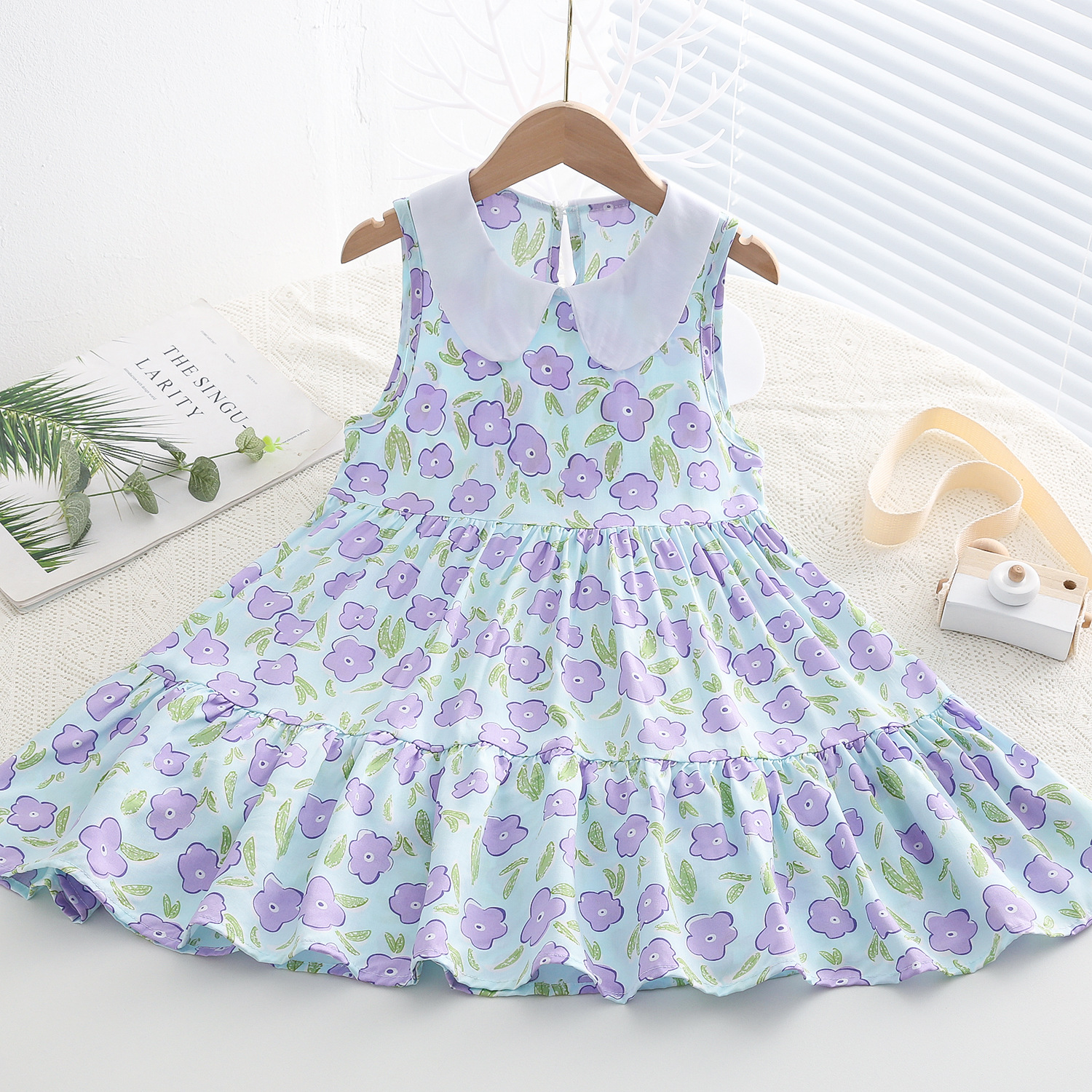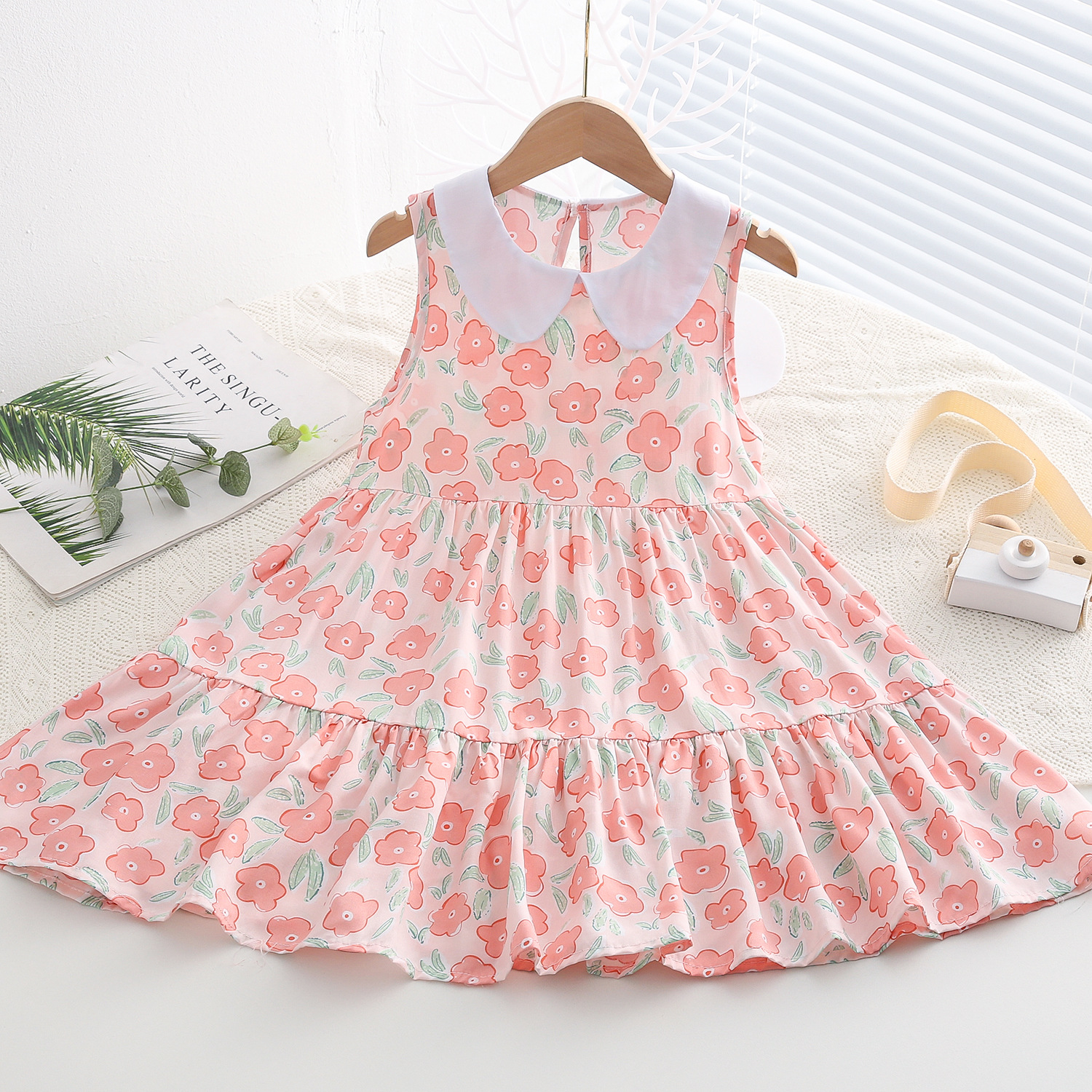 상쾌한 부드러운 찹스러운 소녀 옷깃면 실크 원피스 여름 얇은 미디어와 큰 어린이 꽃 무늬 큰 치마 인공 면화 비치 스커트