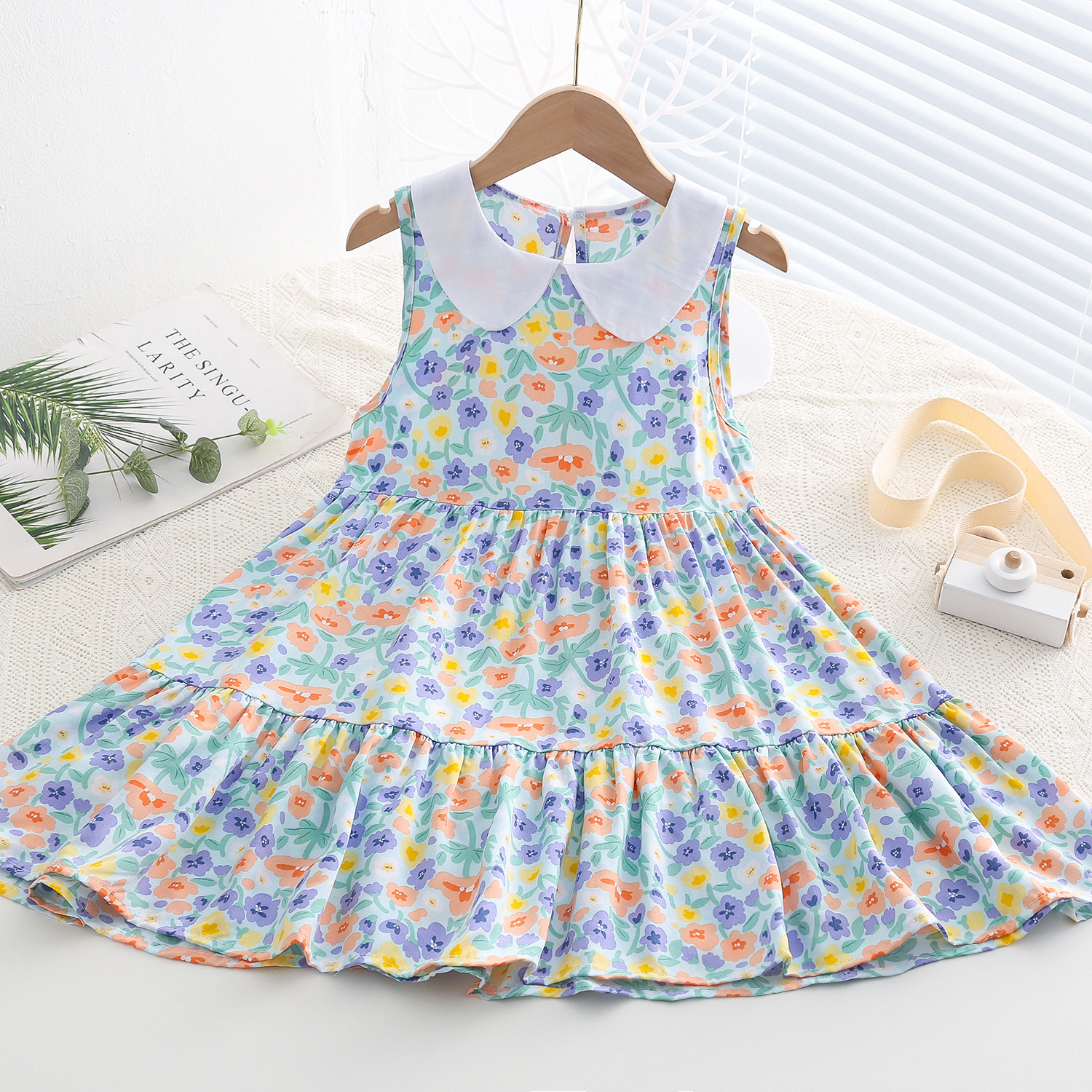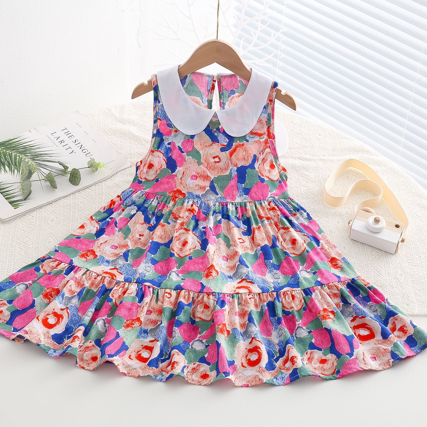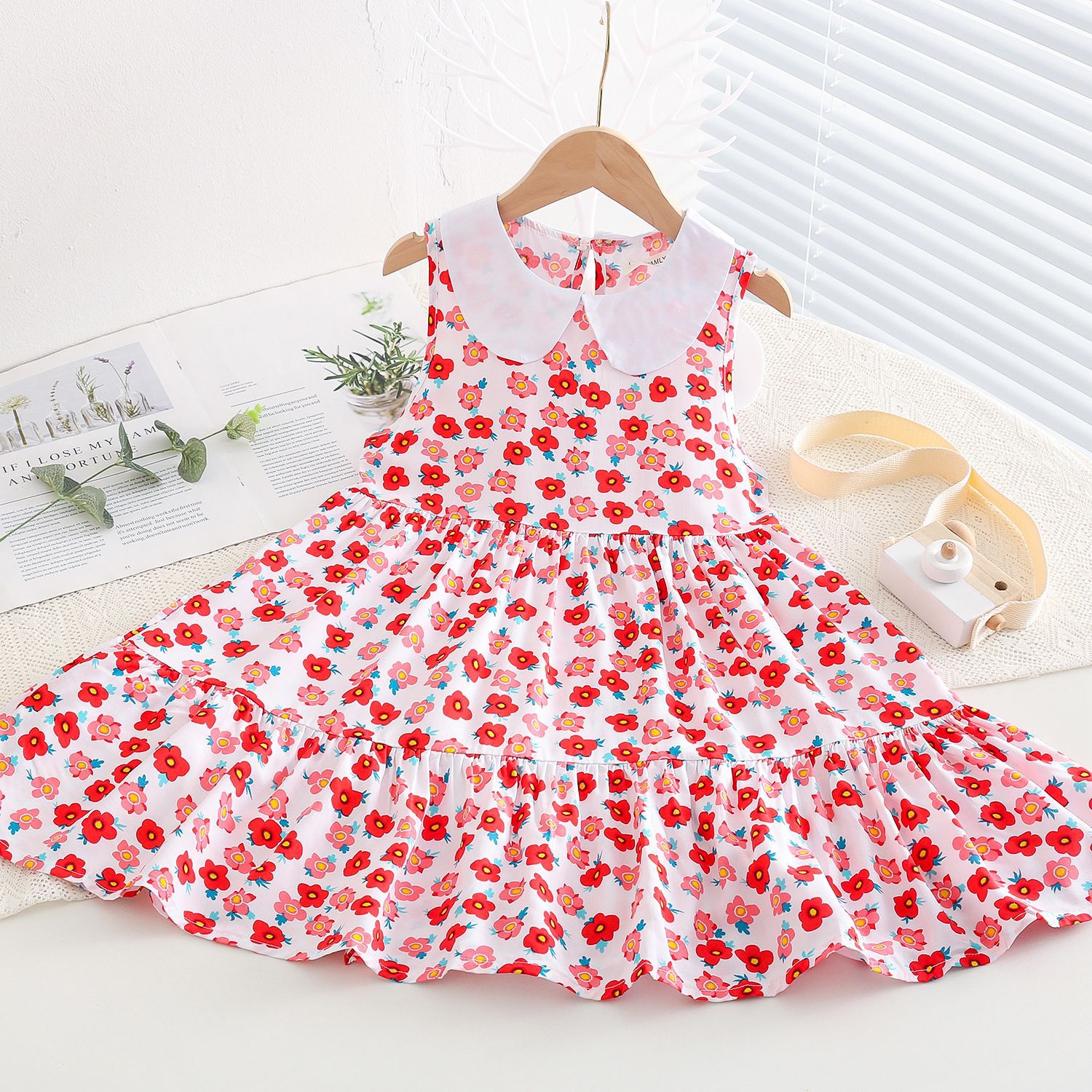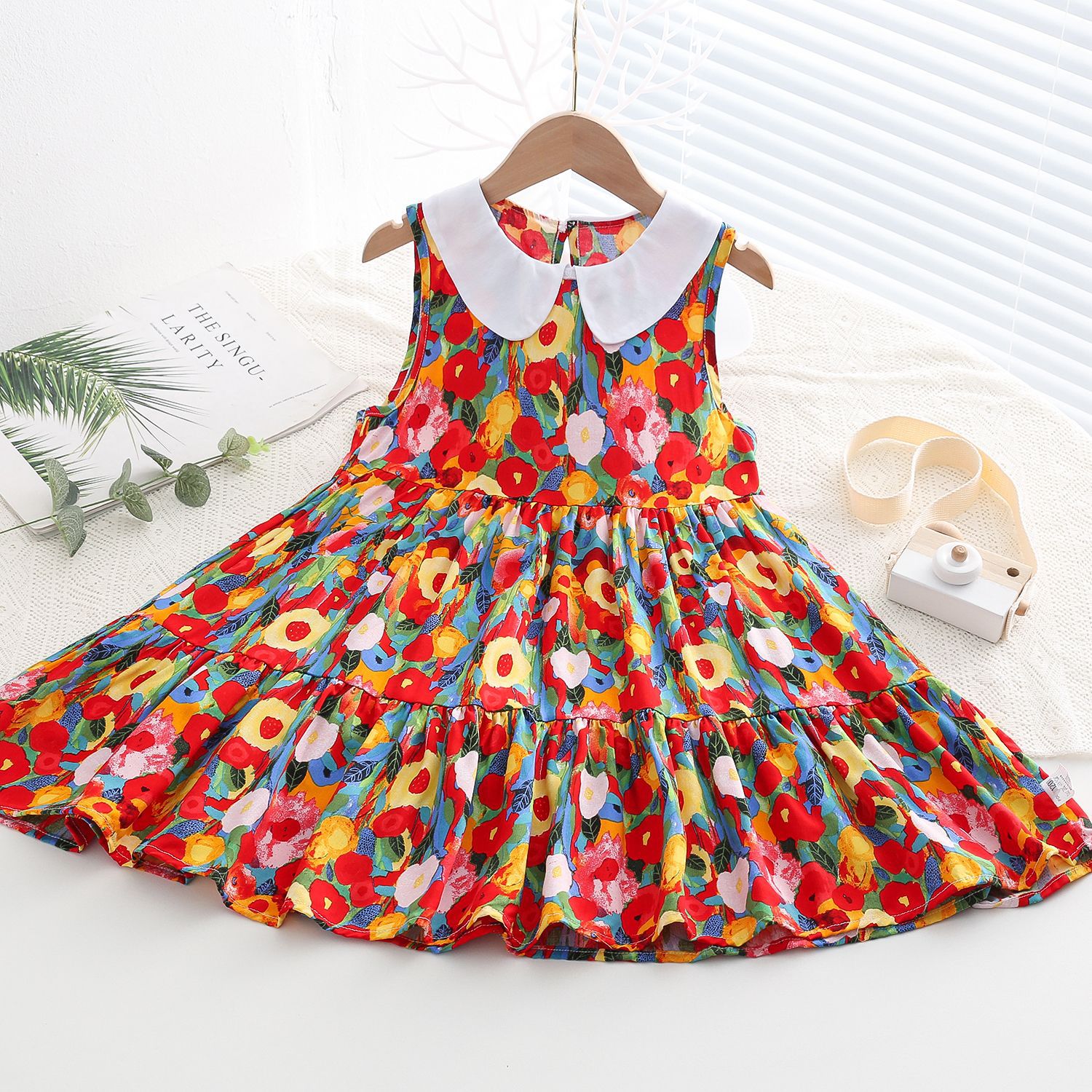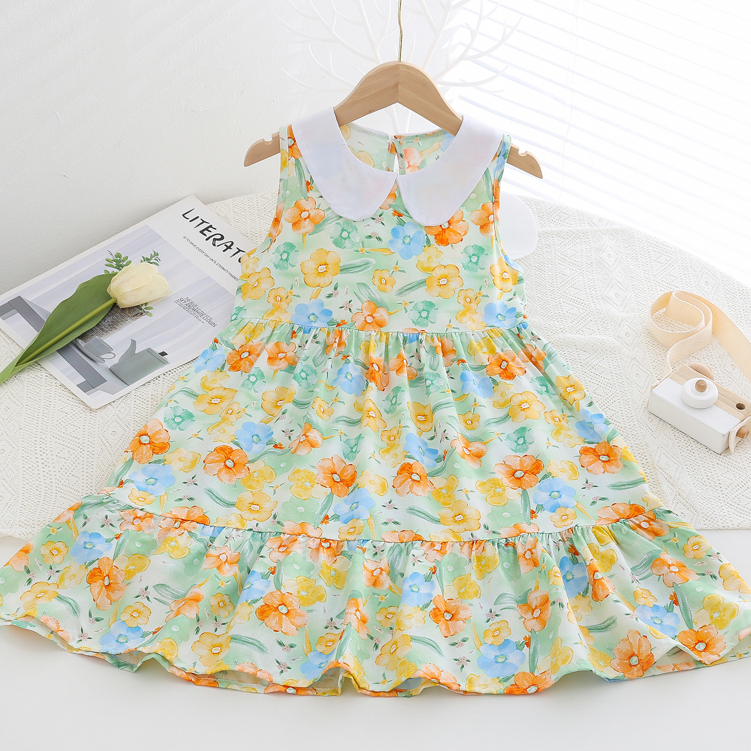 상쾌한 부드러운 찹스러운 소녀 옷깃면 실크 원피스 여름 얇은 미디어와 큰 어린이 꽃 무늬 큰 치마 인공 면화 비치 스커트