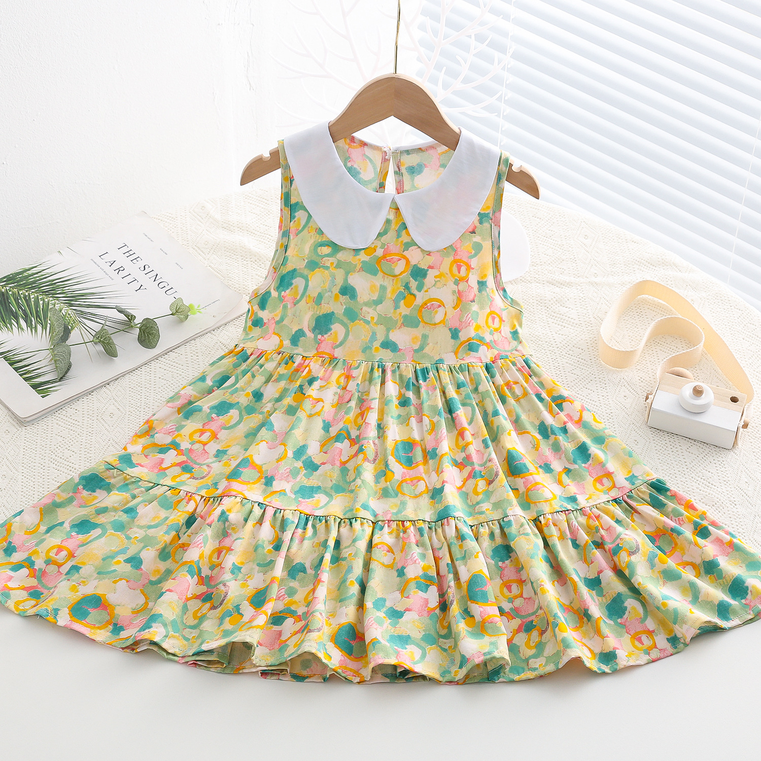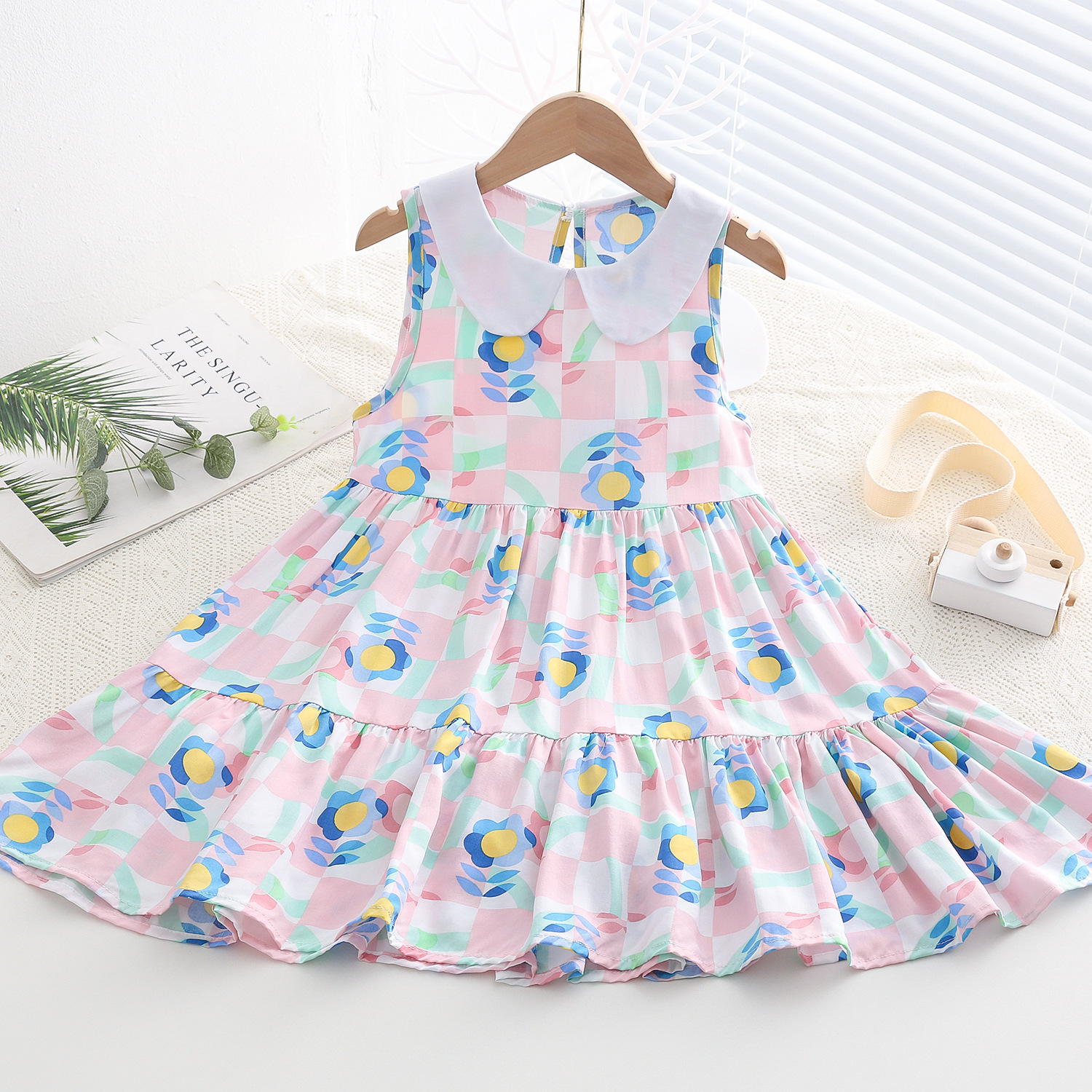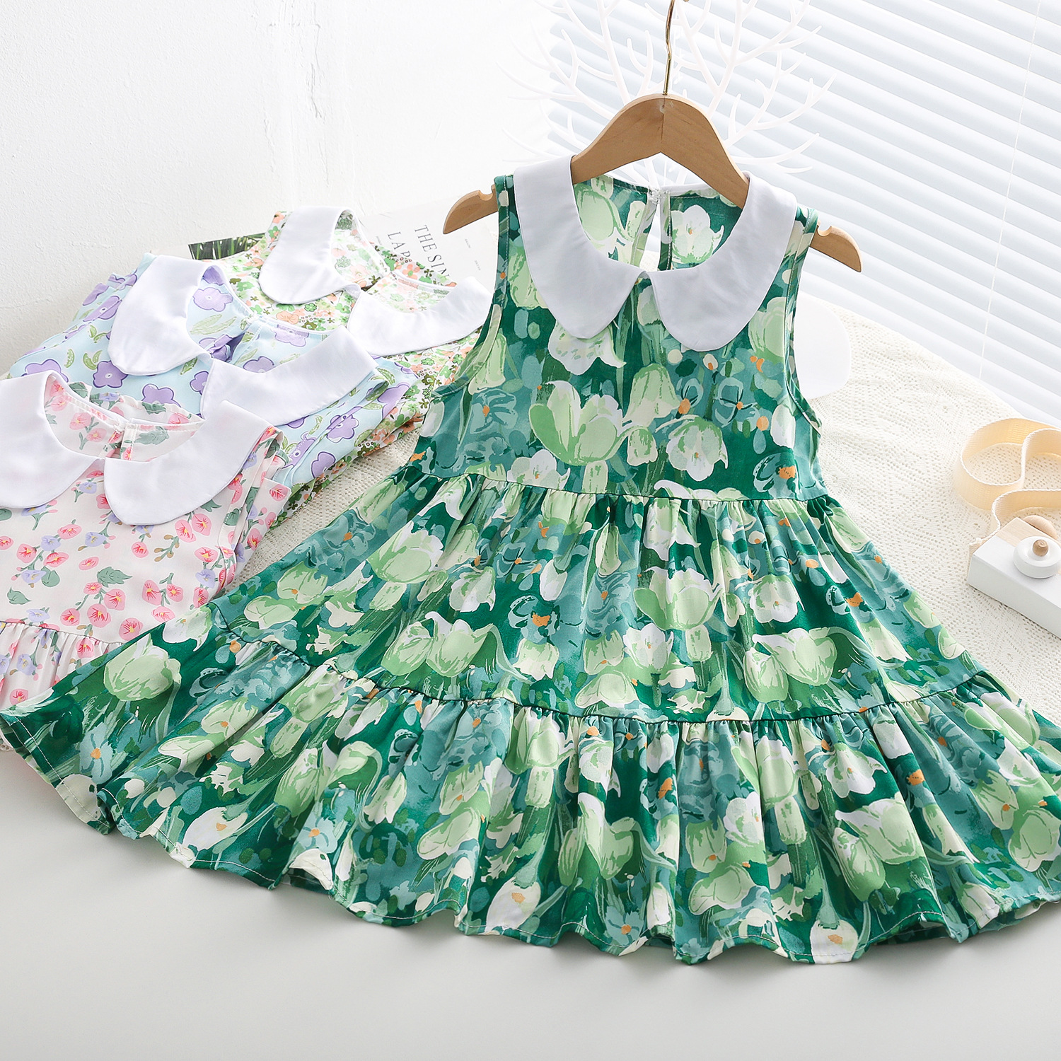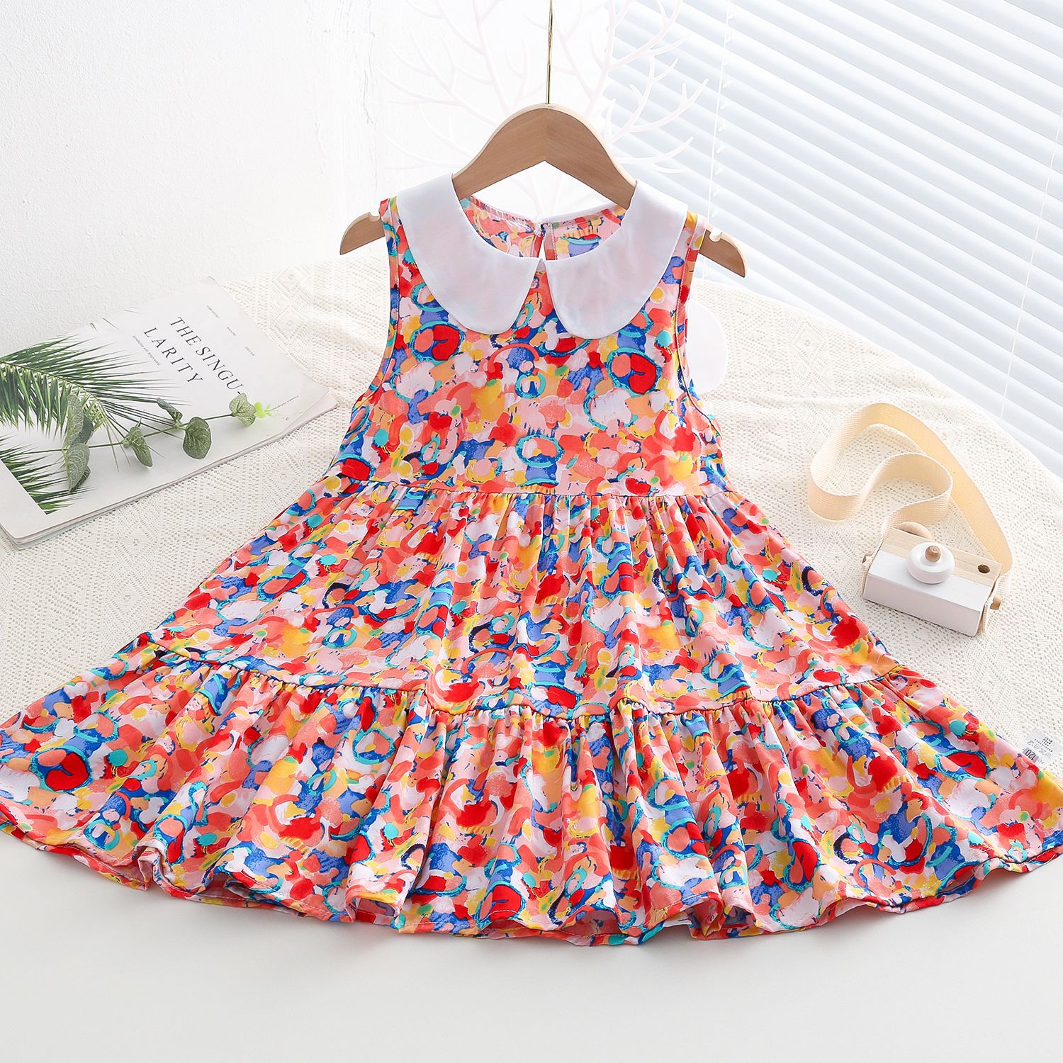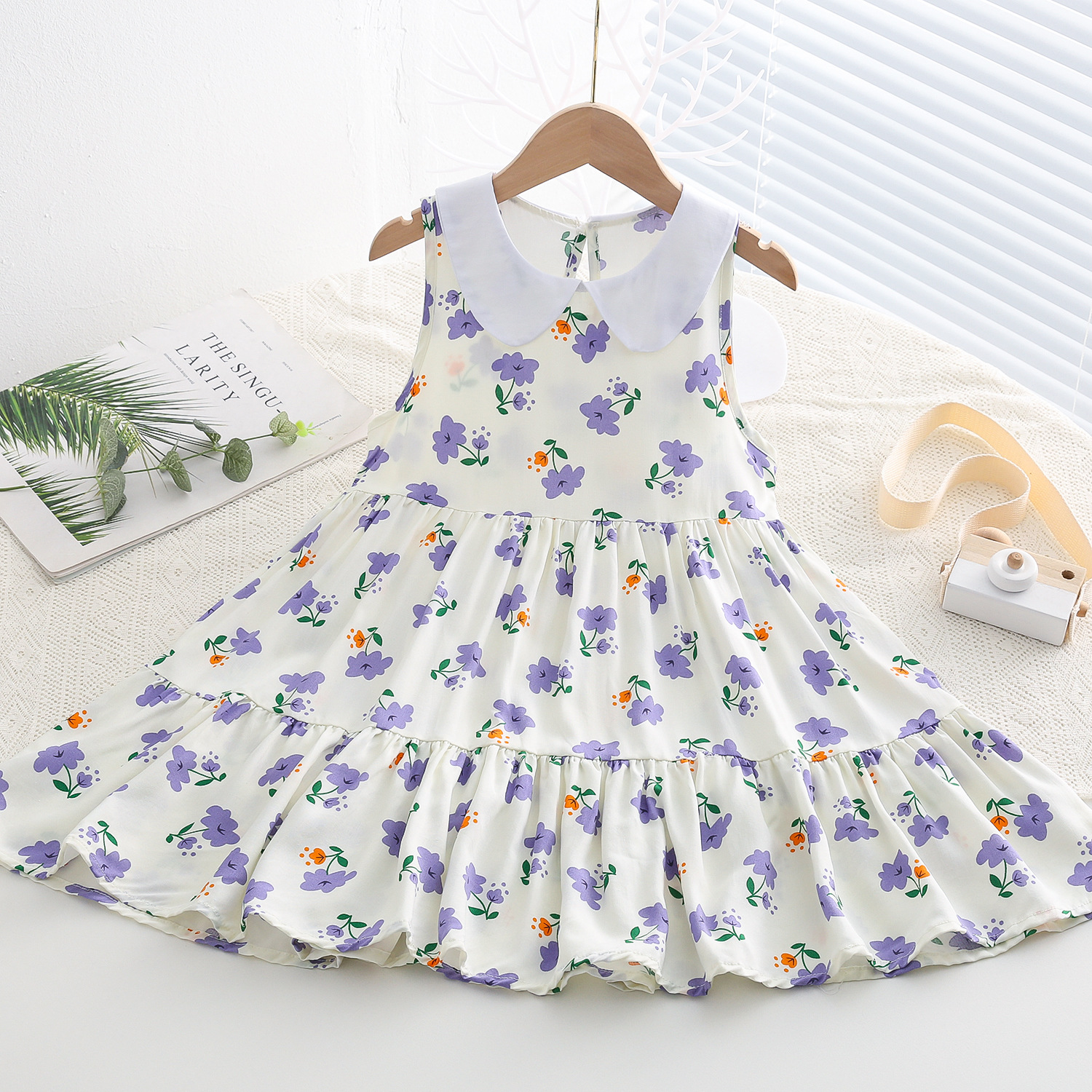 상쾌한 부드러운 찹스러운 소녀 옷깃면 실크 원피스 여름 얇은 미디어와 큰 어린이 꽃 무늬 큰 치마 인공 면화 비치 스커트