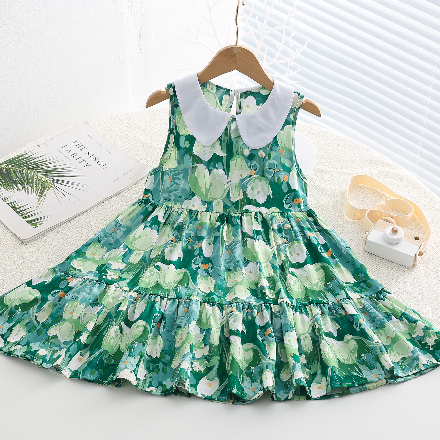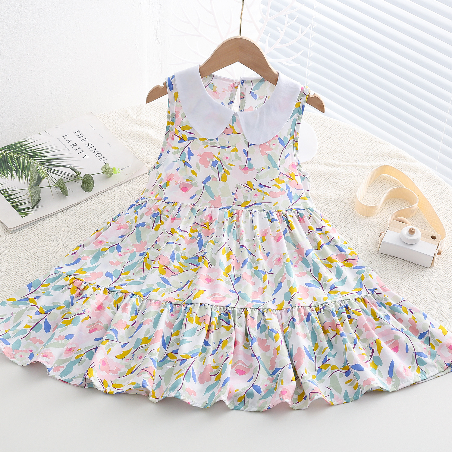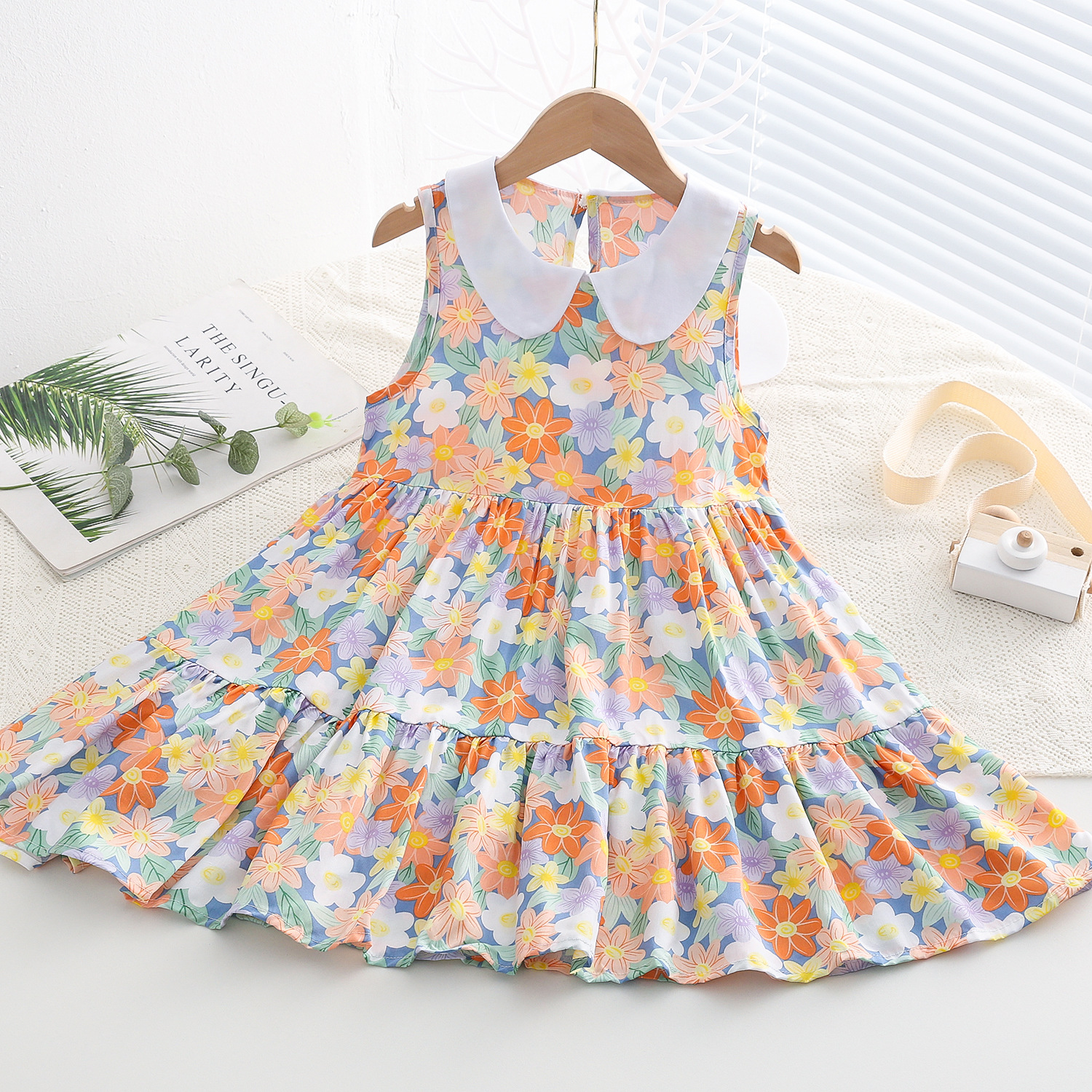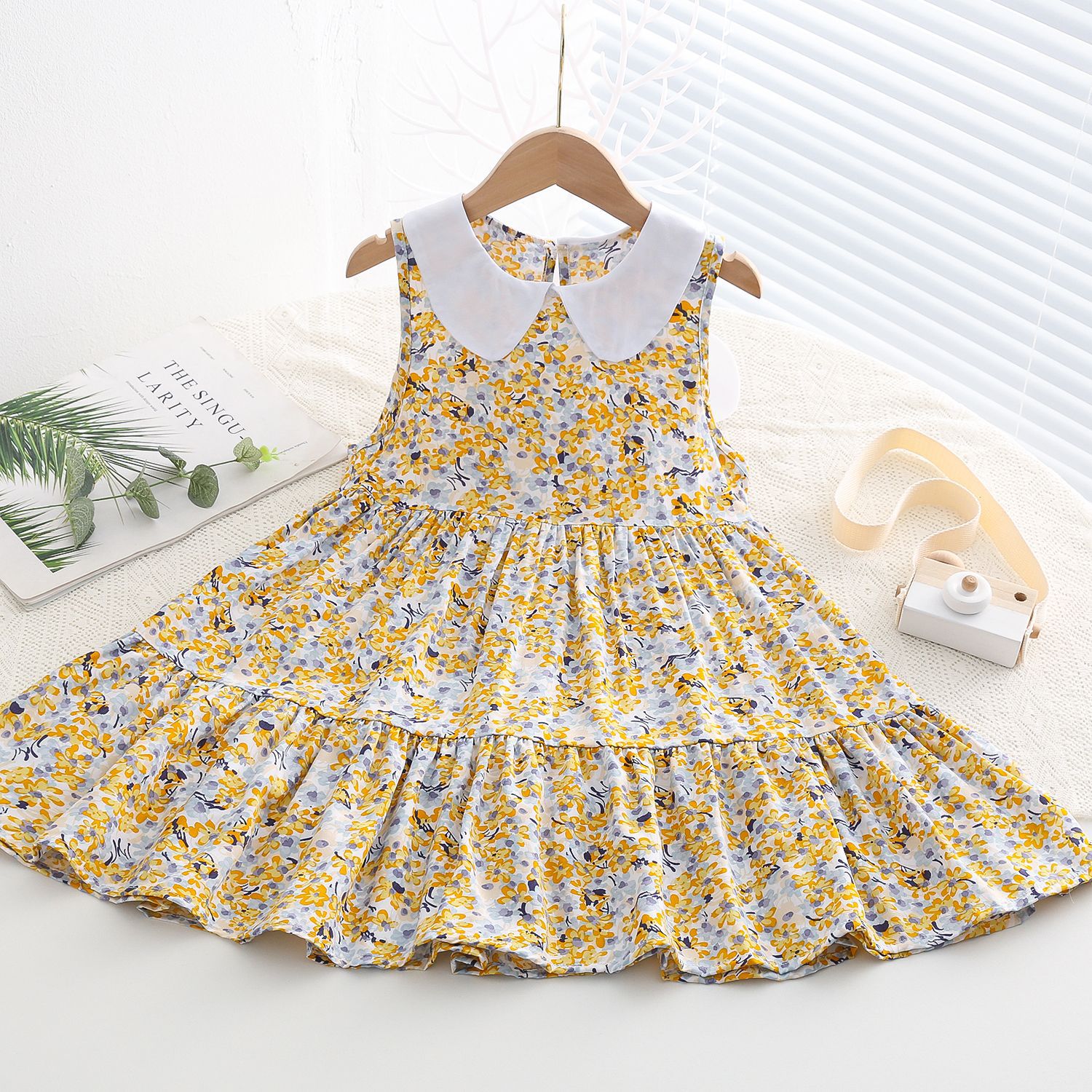 상쾌한 부드러운 찹스러운 소녀 옷깃면 실크 원피스 여름 얇은 미디어와 큰 어린이 꽃 무늬 큰 치마 인공 면화 비치 스커트