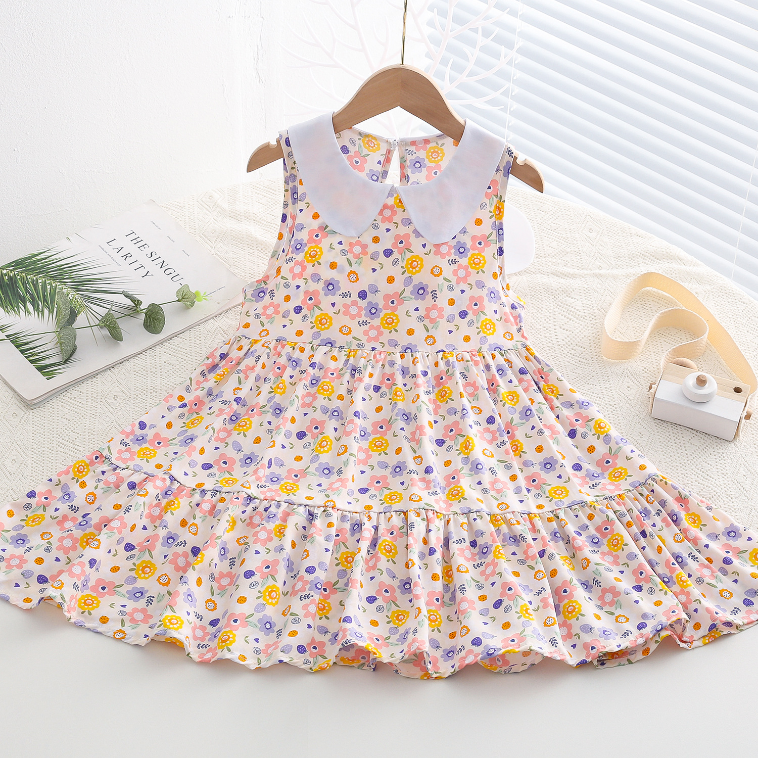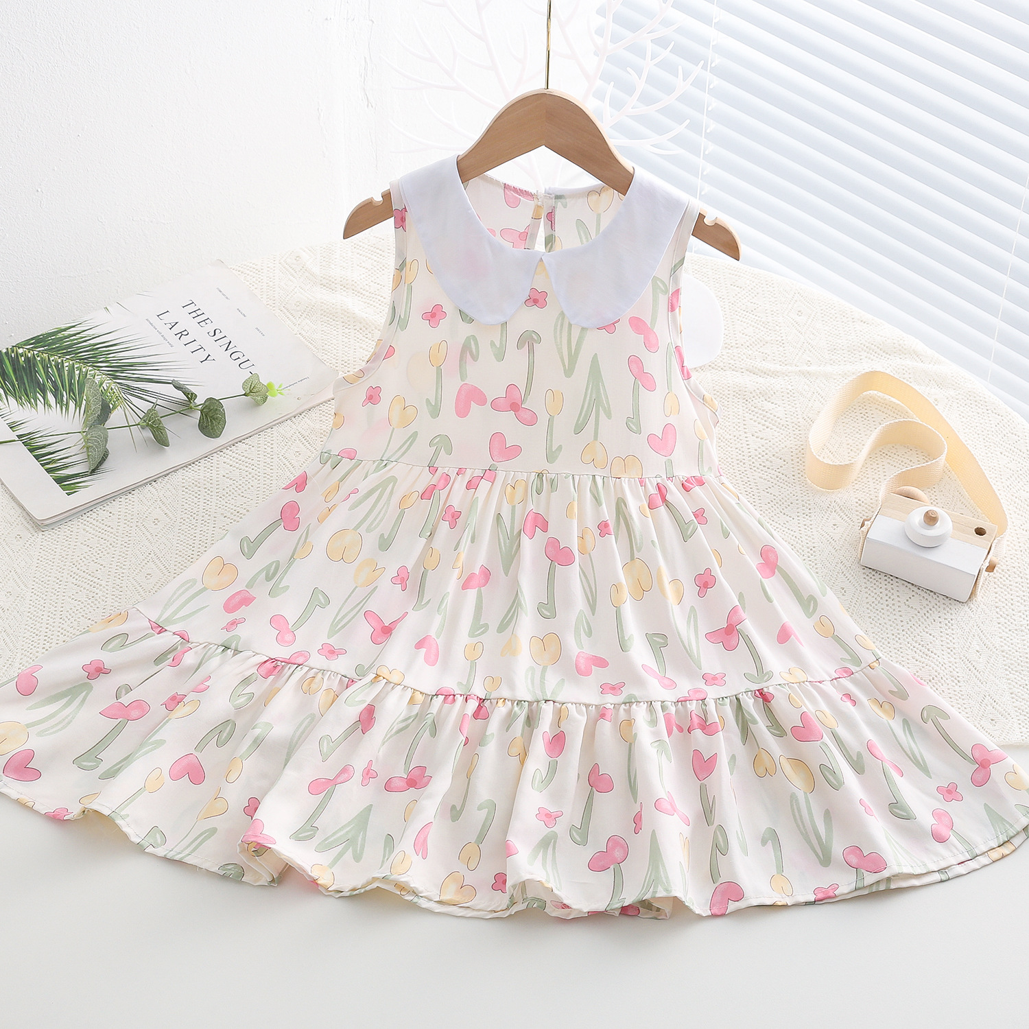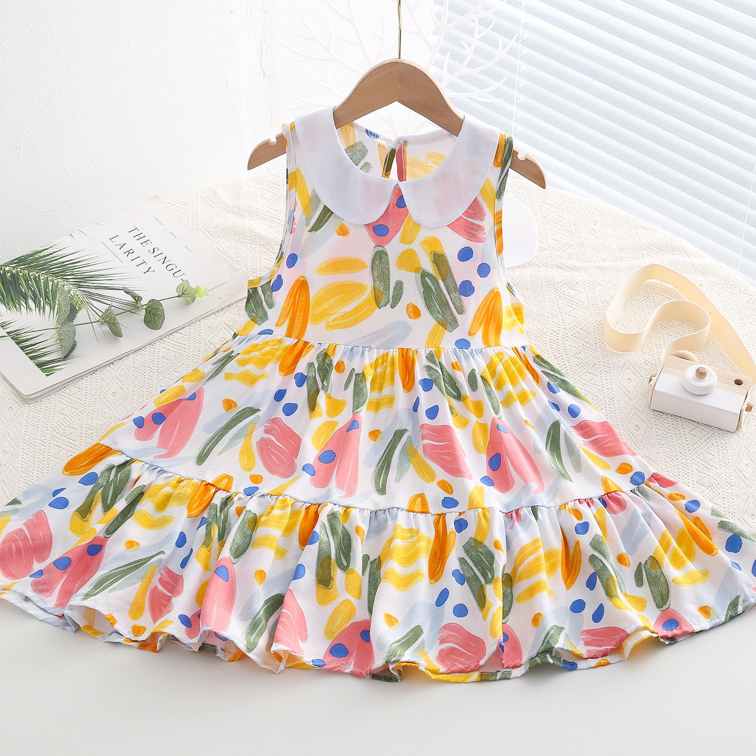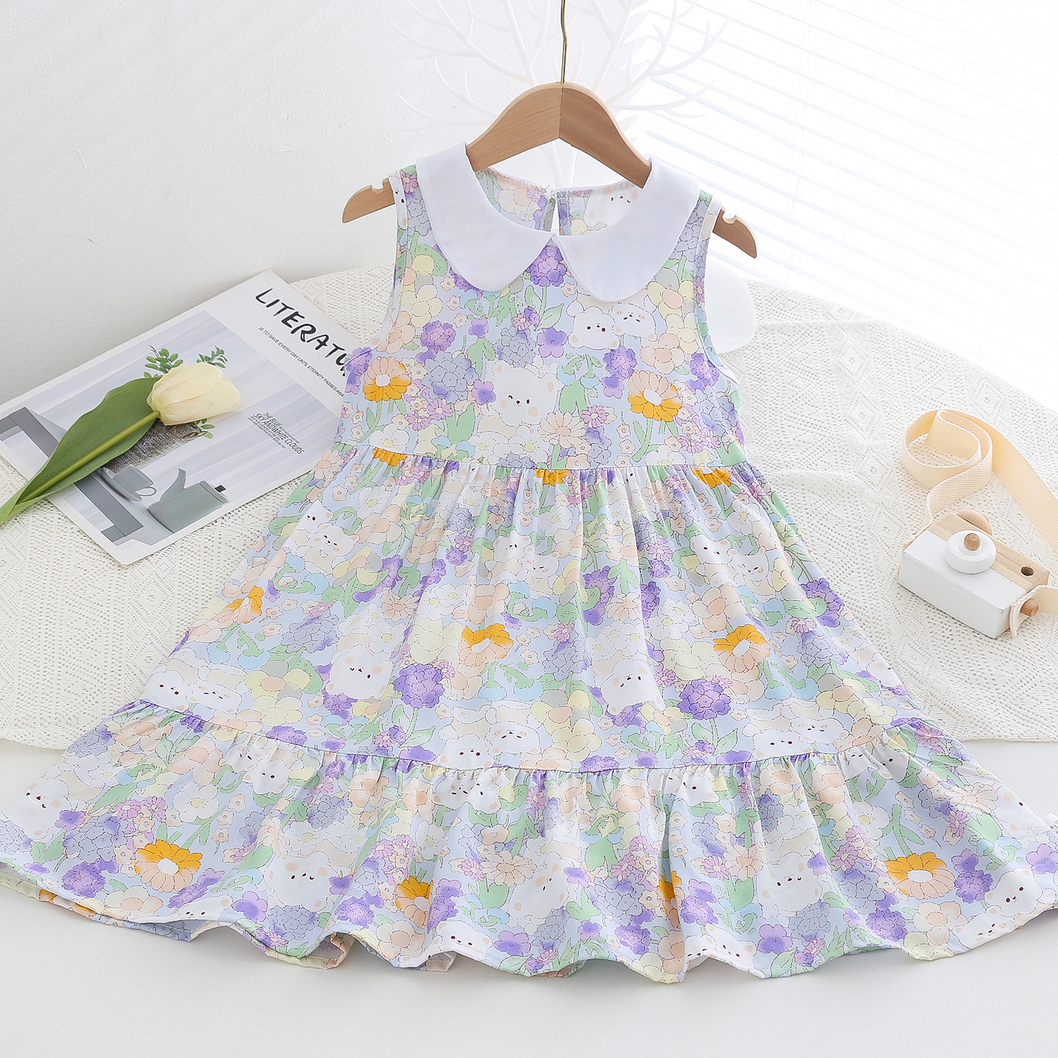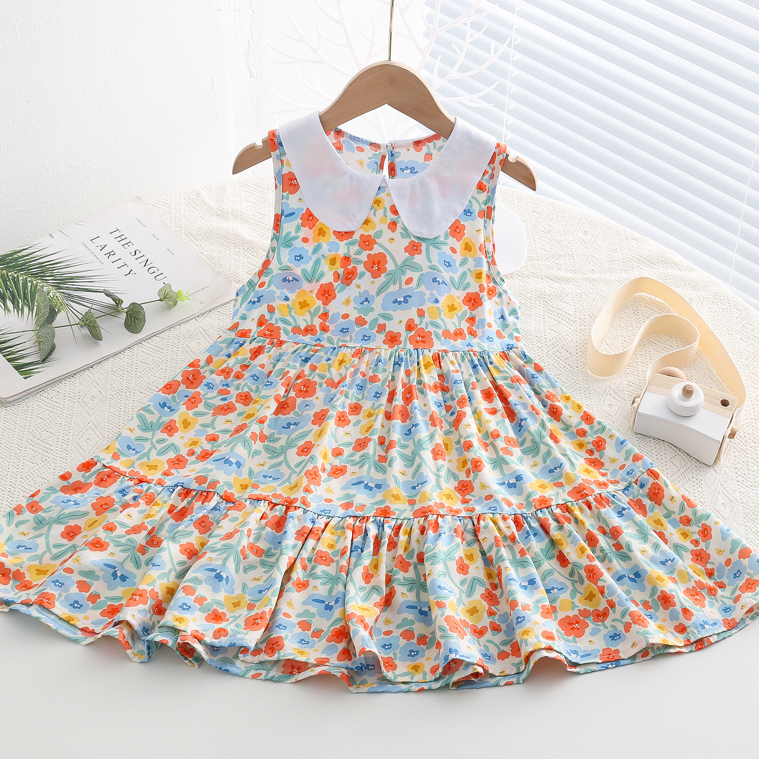 상쾌한 부드러운 찹스러운 소녀 옷깃면 실크 원피스 여름 얇은 미디어와 큰 어린이 꽃 무늬 큰 치마 인공 면화 비치 스커트
