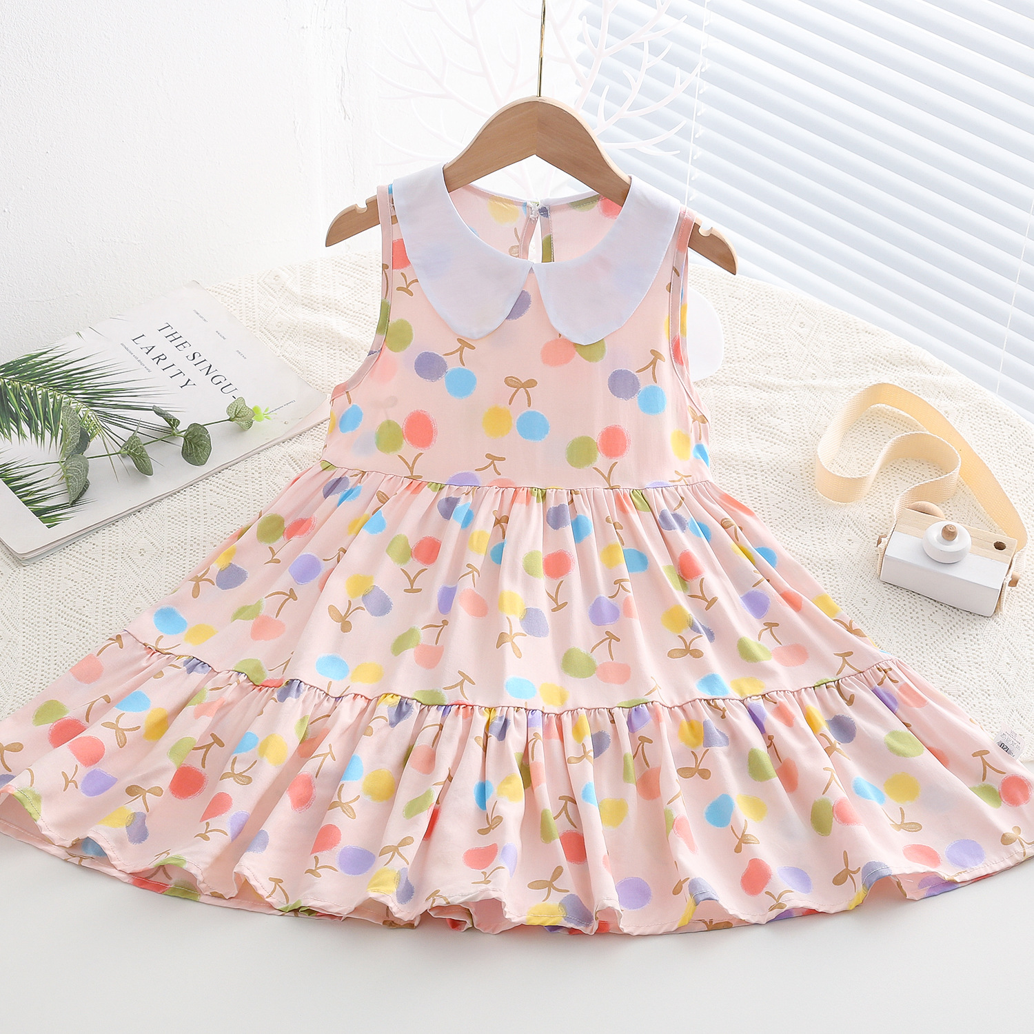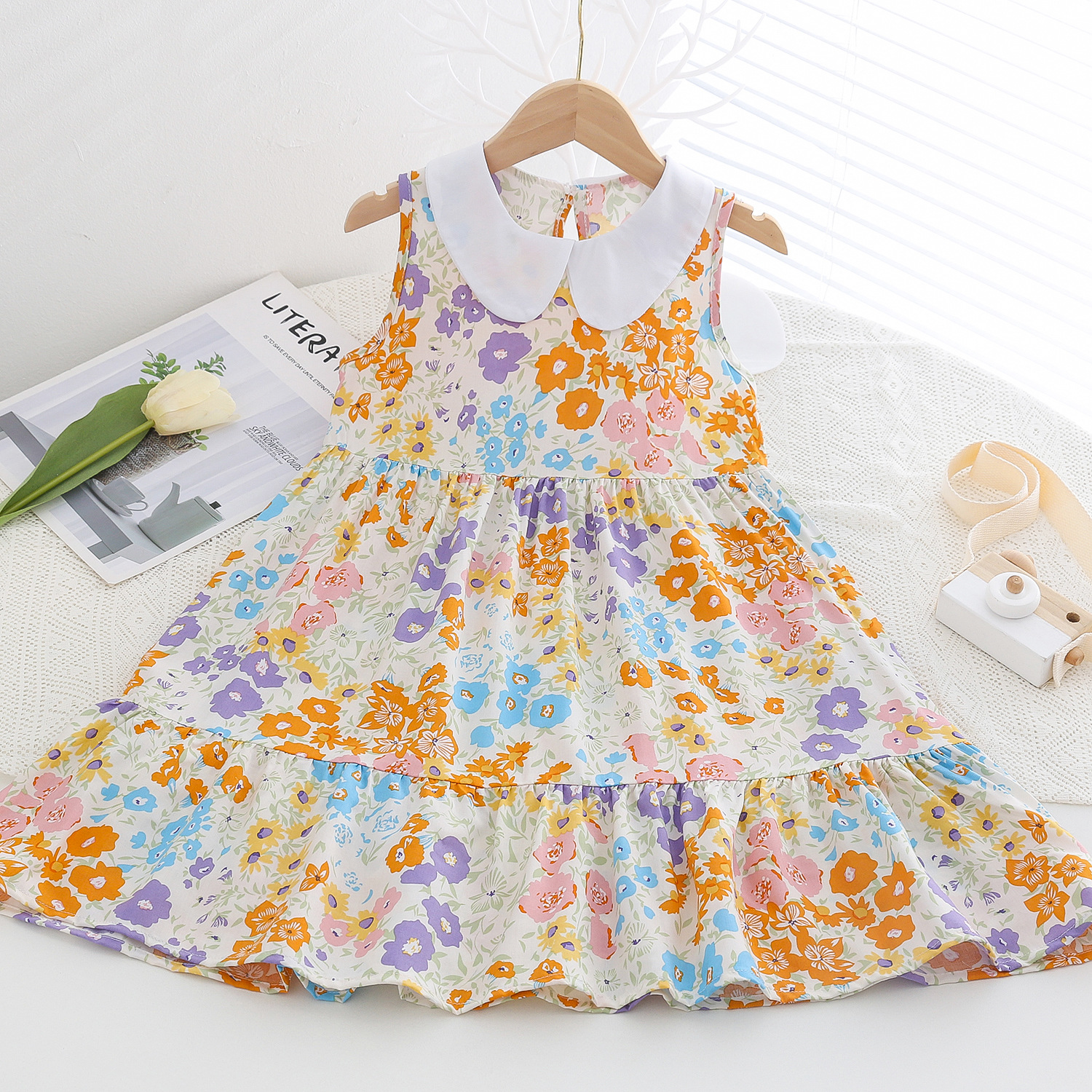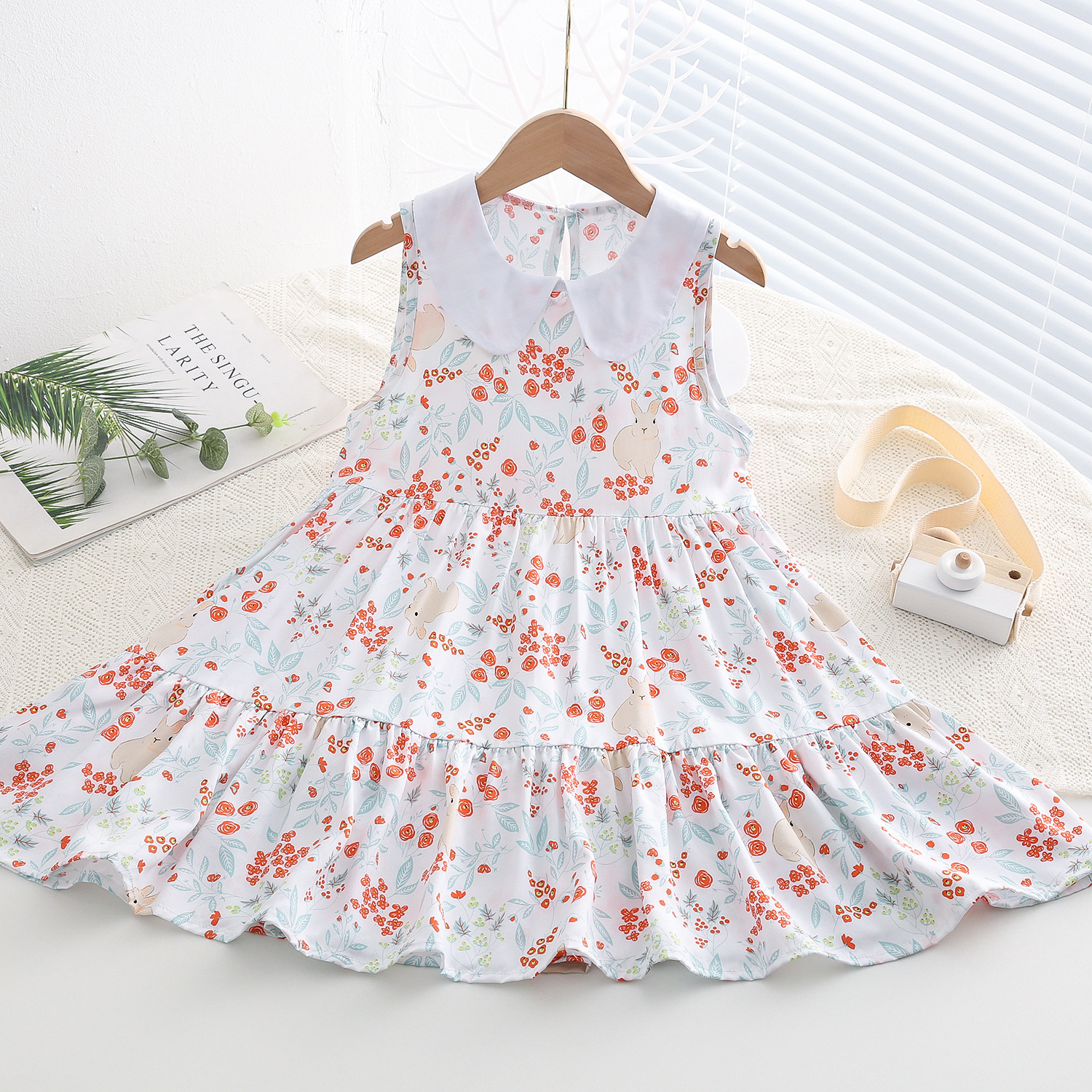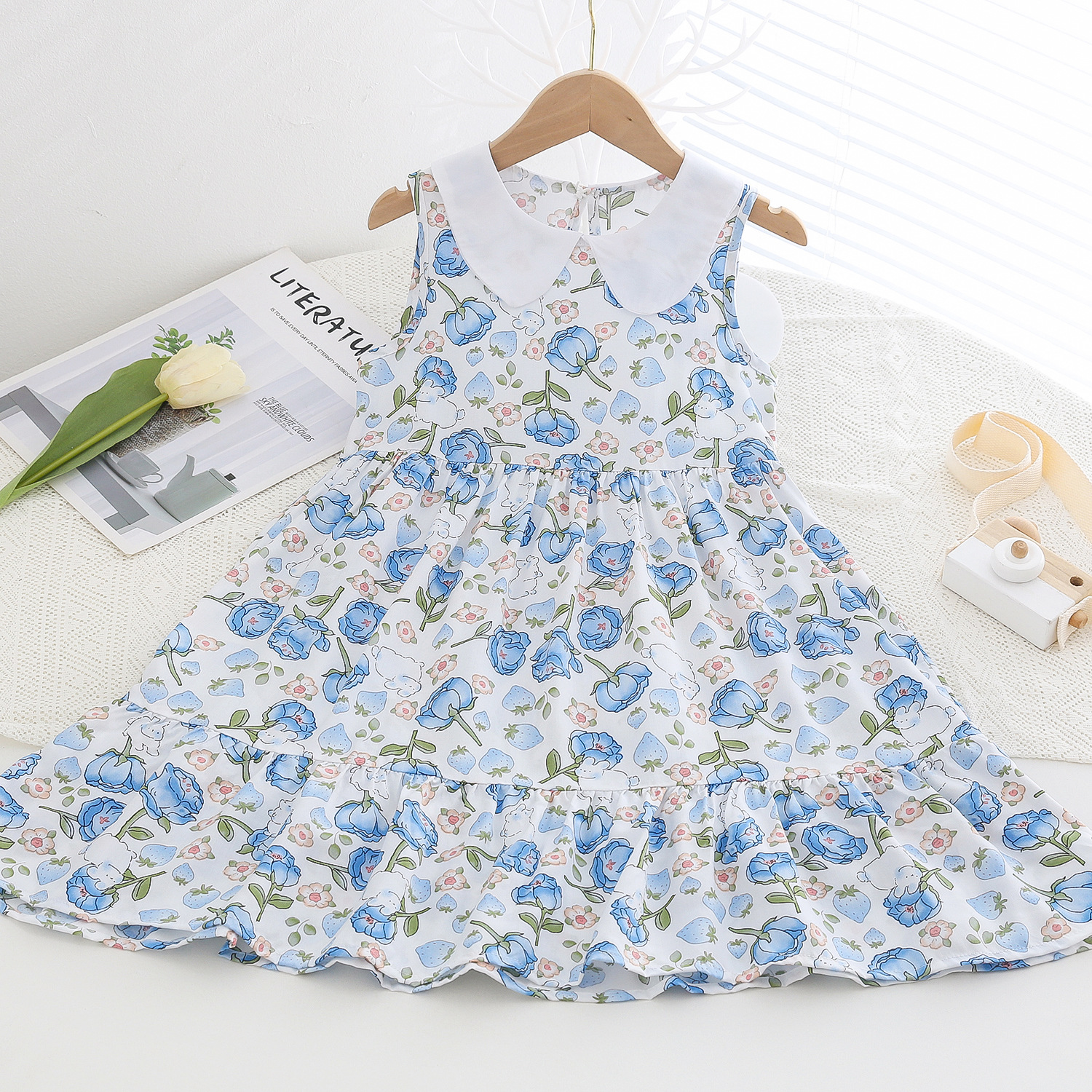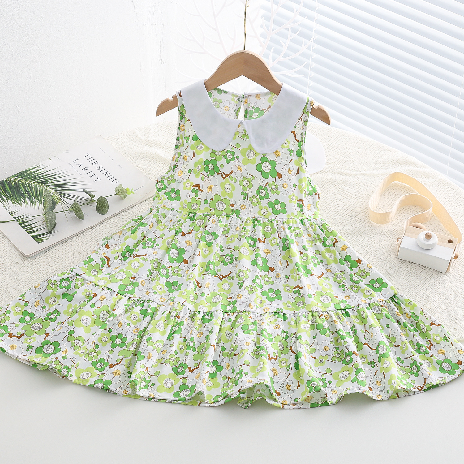 상쾌한 부드러운 찹스러운 소녀 옷깃면 실크 원피스 여름 얇은 미디어와 큰 어린이 꽃 무늬 큰 치마 인공 면화 비치 스커트