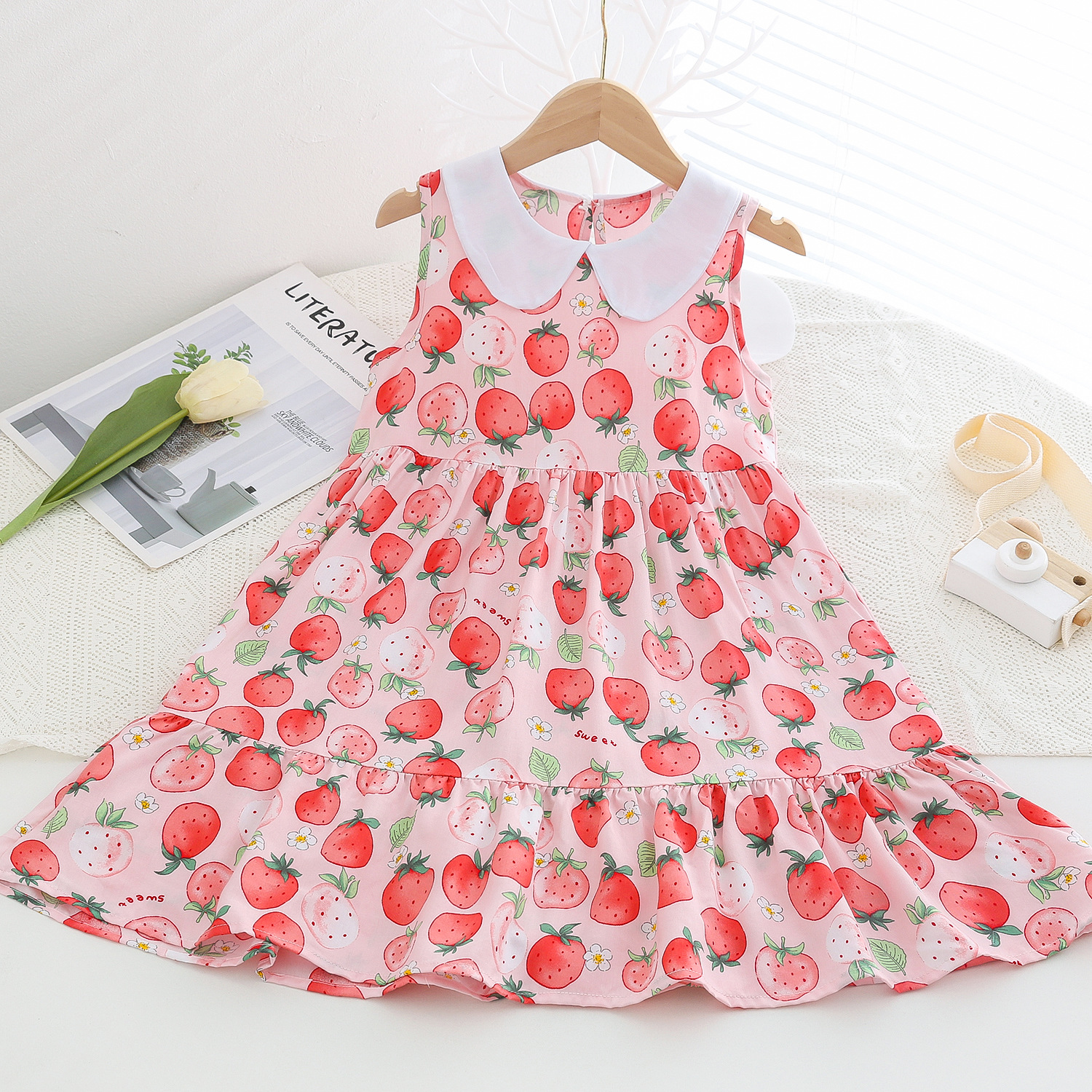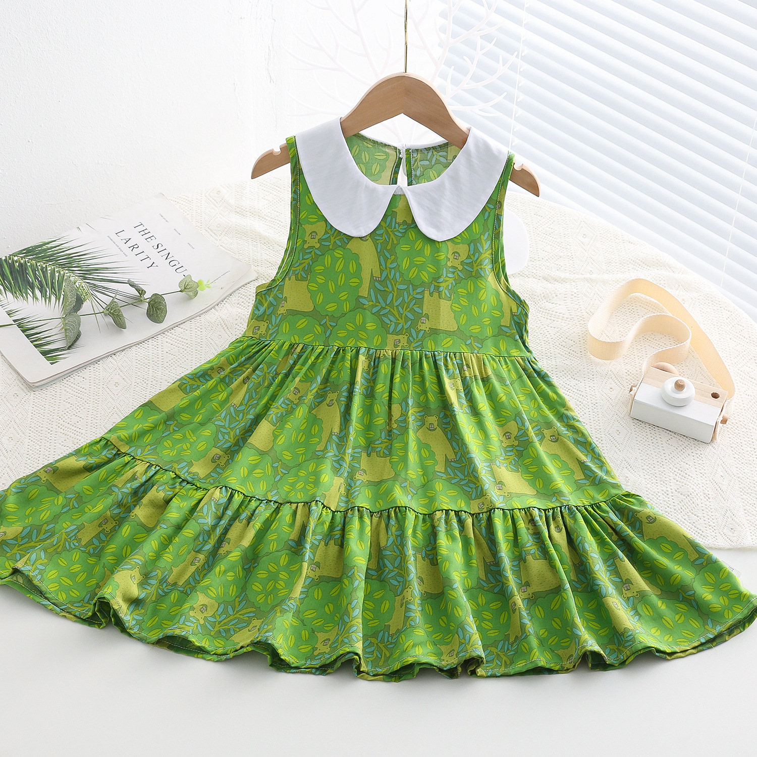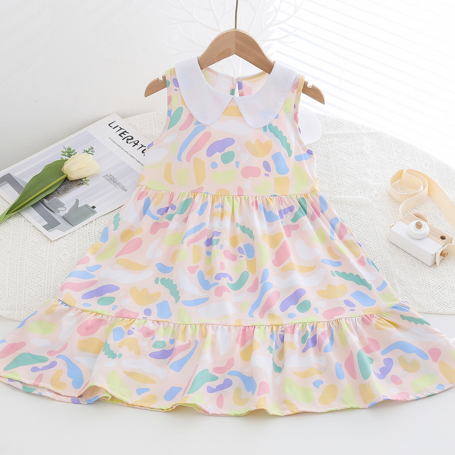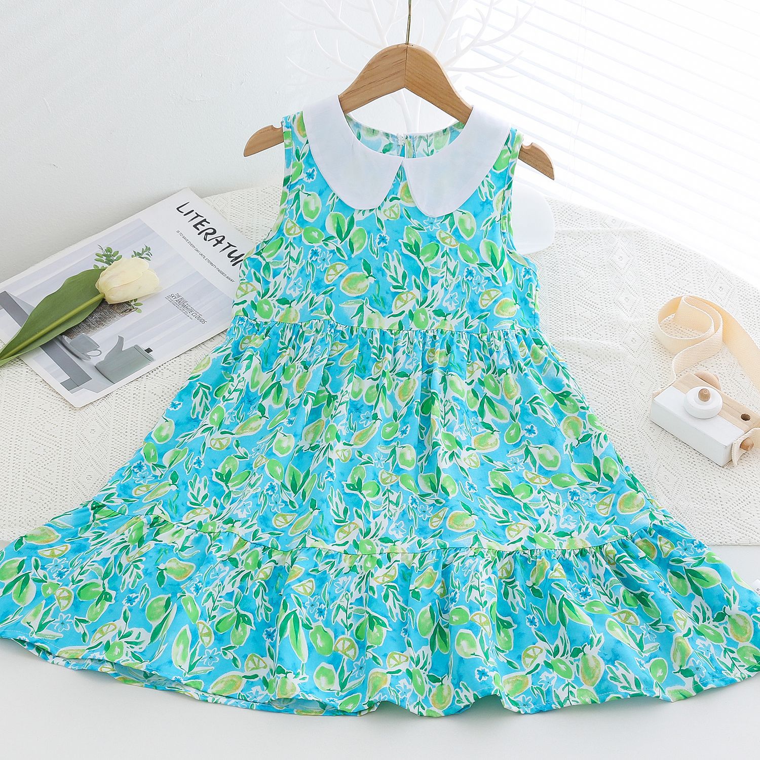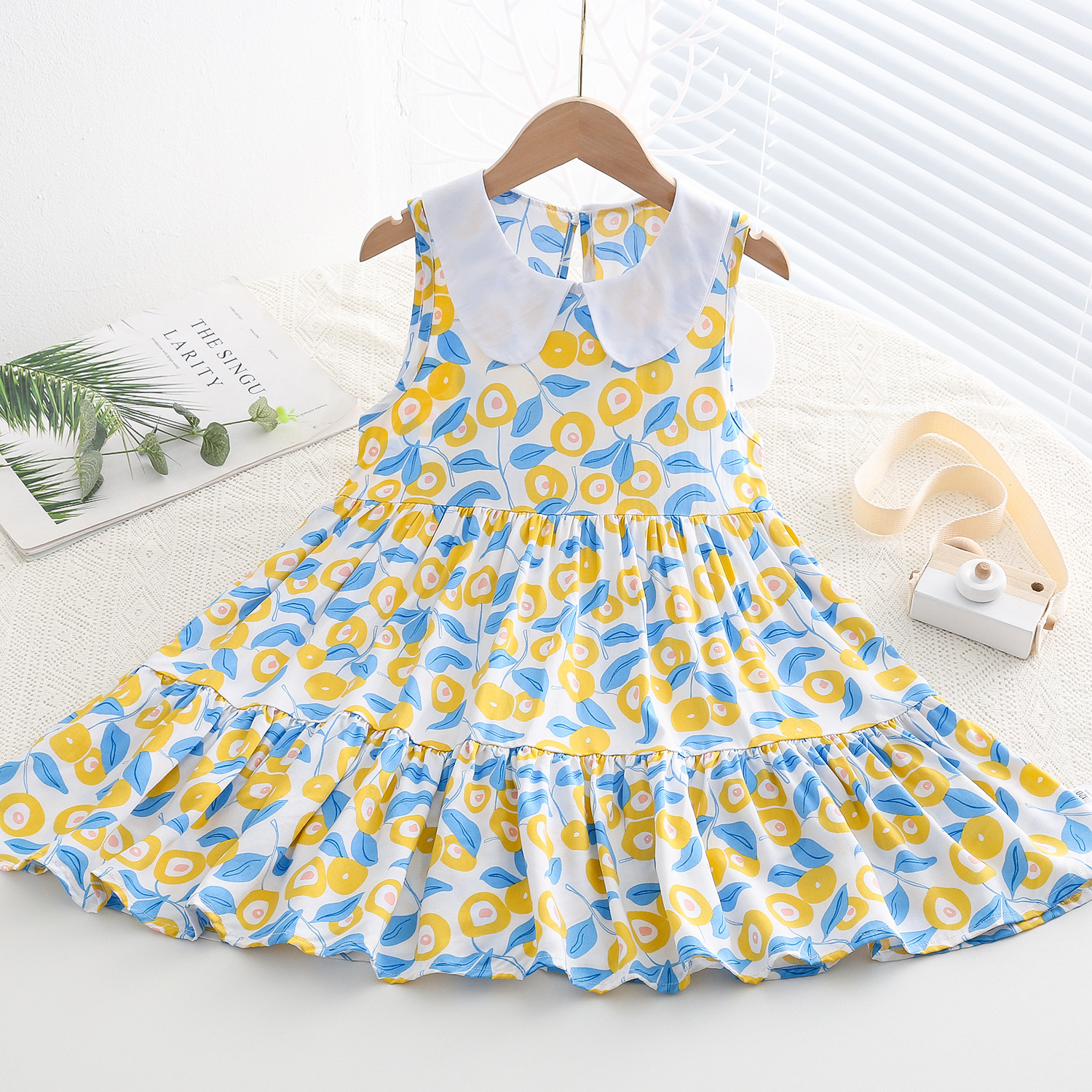 상쾌한 부드러운 찹스러운 소녀 옷깃면 실크 원피스 여름 얇은 미디어와 큰 어린이 꽃 무늬 큰 치마 인공 면화 비치 스커트